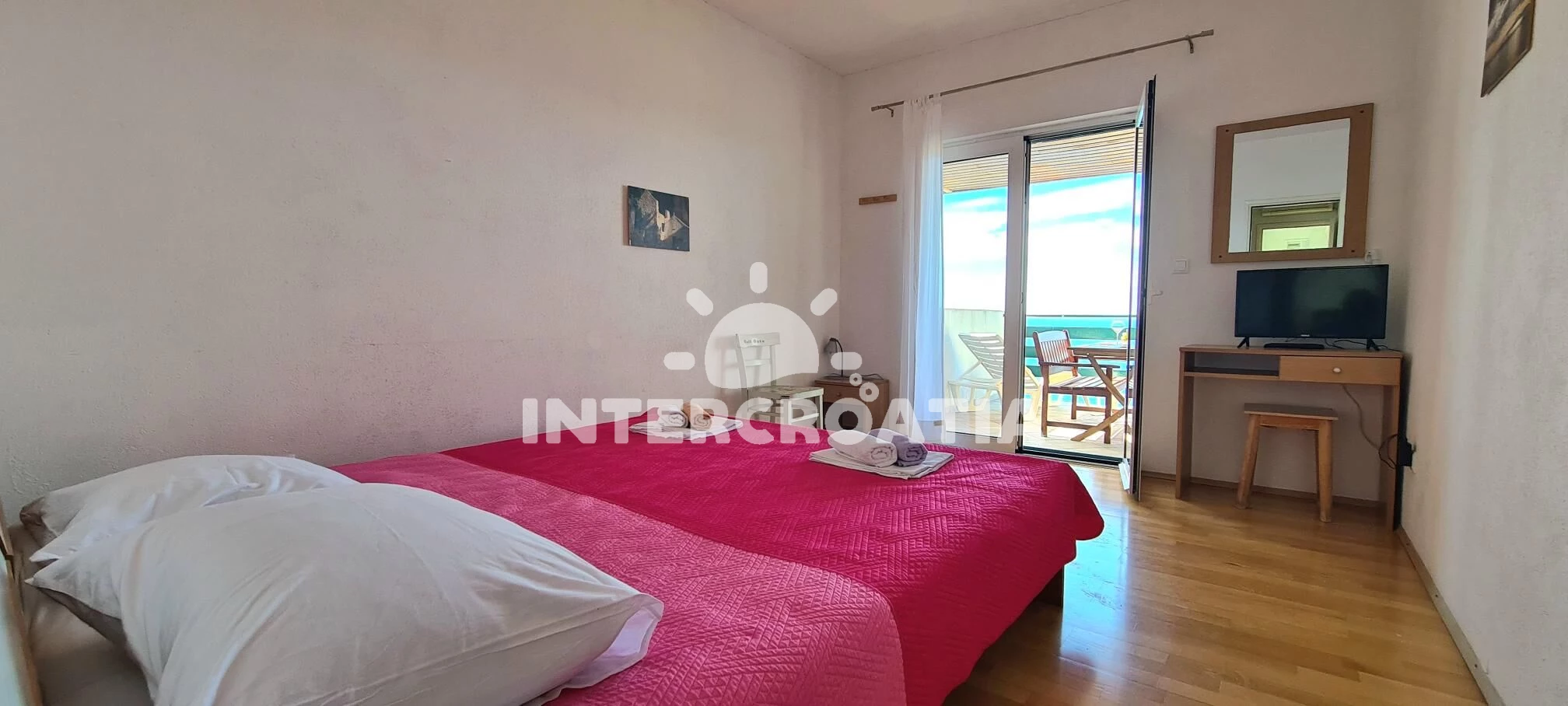 Apartmán (35 m2) s terasou, a výhledem na moře. Nachází se ve 3. patře objektu. Apartmán má 1 ložnici a je vhodný pro až 3 osoby. Kuchyňská linka je vybavena varnou deskou, rychlovarnou konvicí, nádobím, lednicí, mrazákem. K dispozici televize, žehlička. Ložnice s dvoulůžkem, přistýlkou. Koupelna se sprchovým koutem, umyvadlem, fénem a WC.