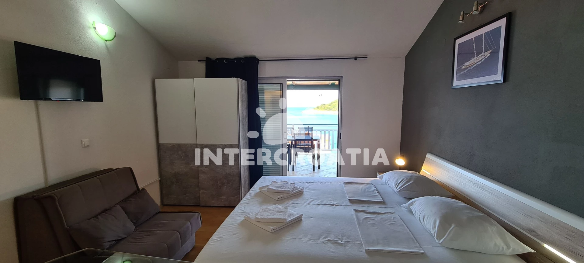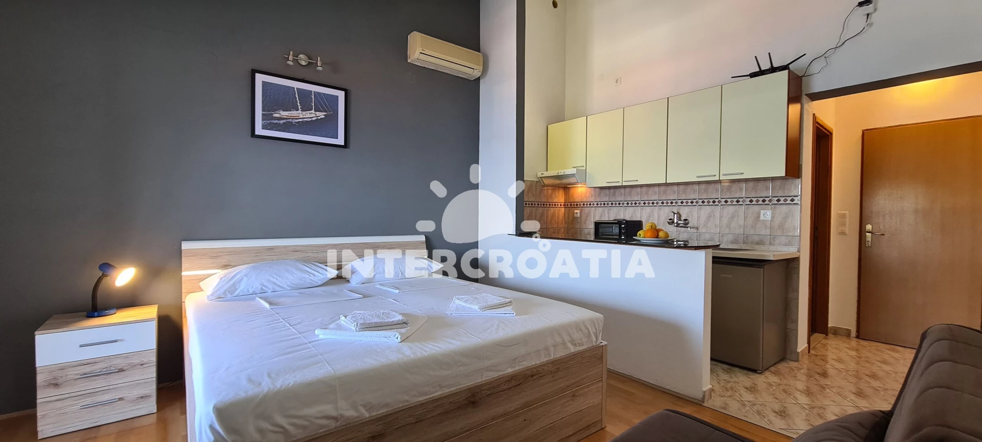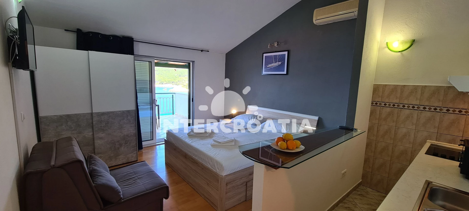 Apartmán (28 m2) typu studio s balkonem, a výhledem na moře. Nachází se ve 3. patře objektu. Kuchyňská linka je vybavena varnou deskou, kávovarem, mikrovlnnou troubou, rychlovarnou konvicí, nádobím, lednicí, mrazákem. K dispozici dvoulůžko, televize, žehlička. Koupelna se sprchovým koutem, umyvadlem, fénem a WC.