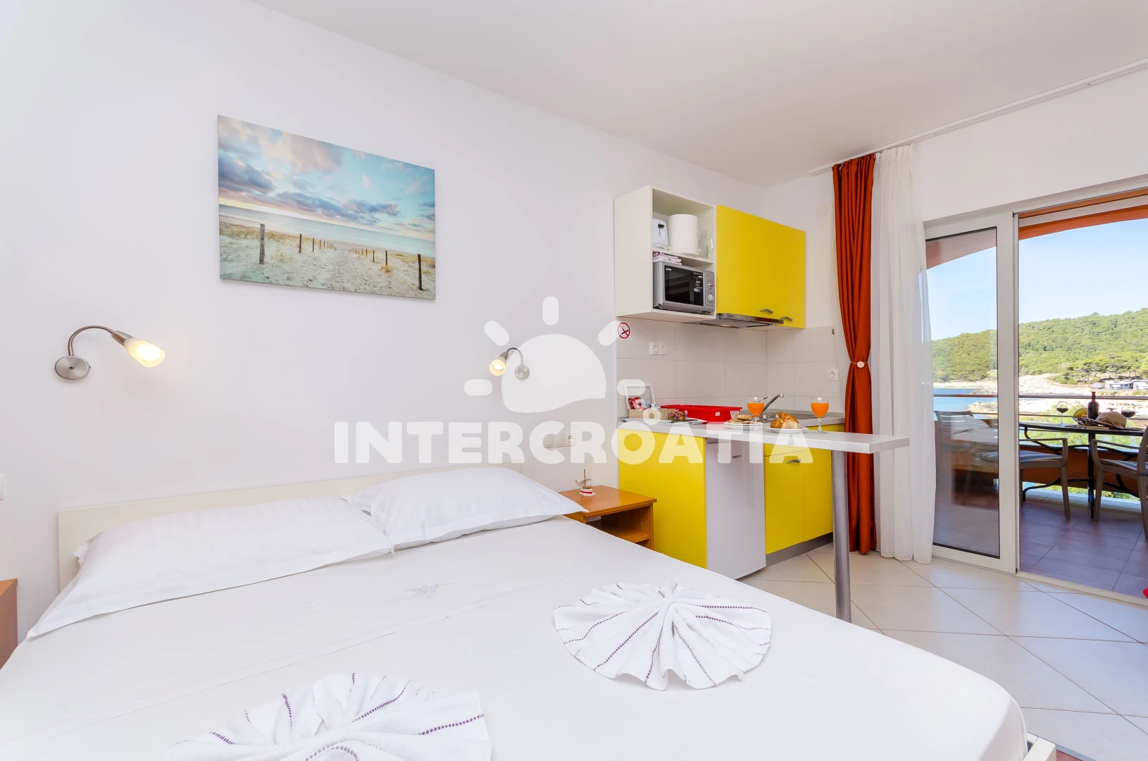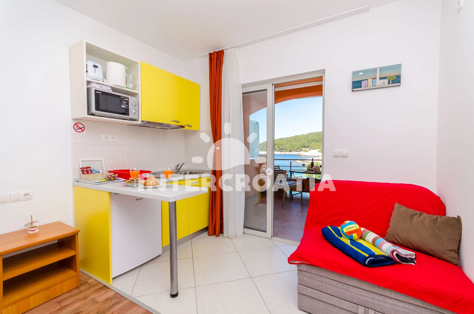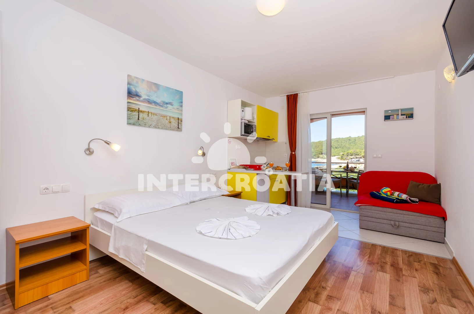 Apartmán typu studio (20 m2) s balkonem, a výhledem na moře. Nachází se v 1. patře objektu. Kuchyňská linka je vybavena varnou deskou, kávovarem, toustovačem, rychlovarnou konvicí, nádobím, lednicí,…