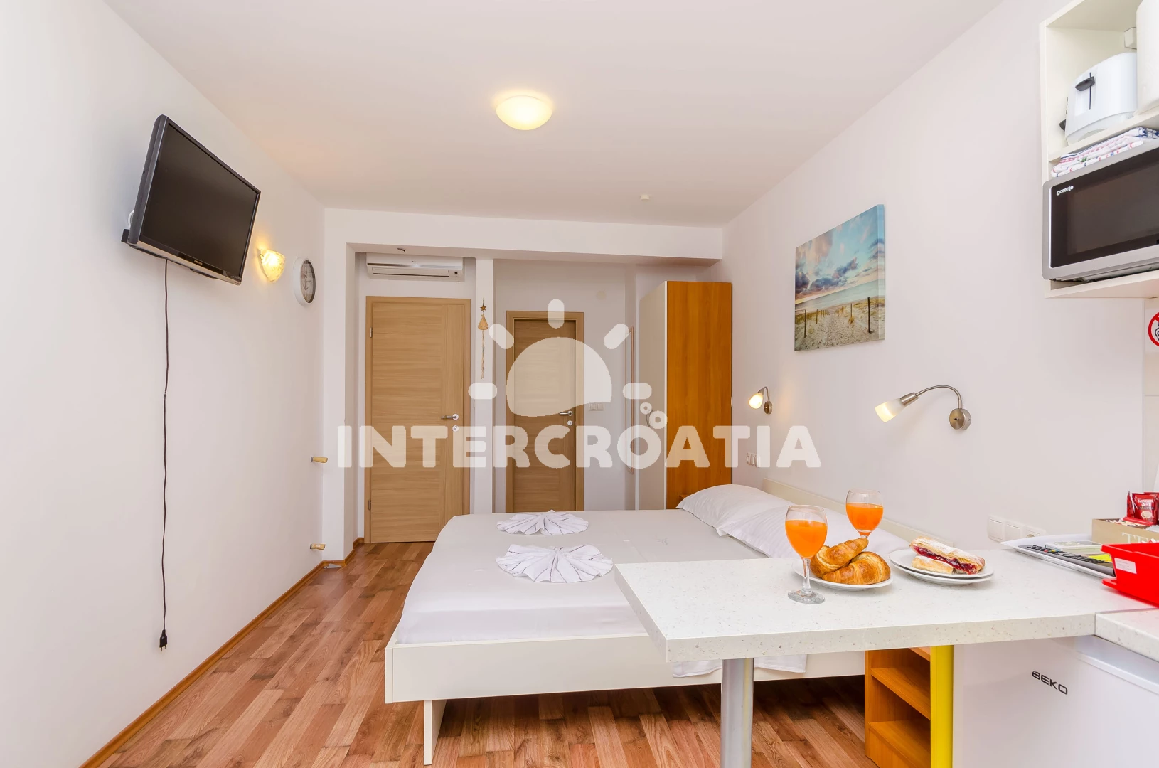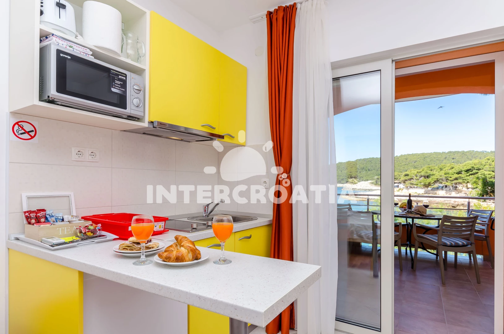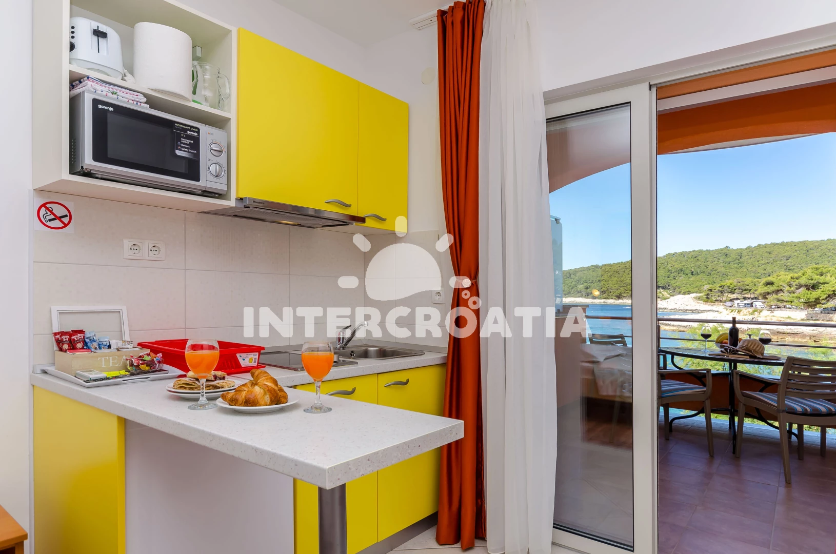 Apartmán typu studio (20 m2) s balkonem, a výhledem na moře. Nachází se v 1. patře objektu. Kuchyňská linka je vybavena varnou deskou, kávovarem, toustovačem, rychlovarnou konvicí, nádobím, lednicí,…