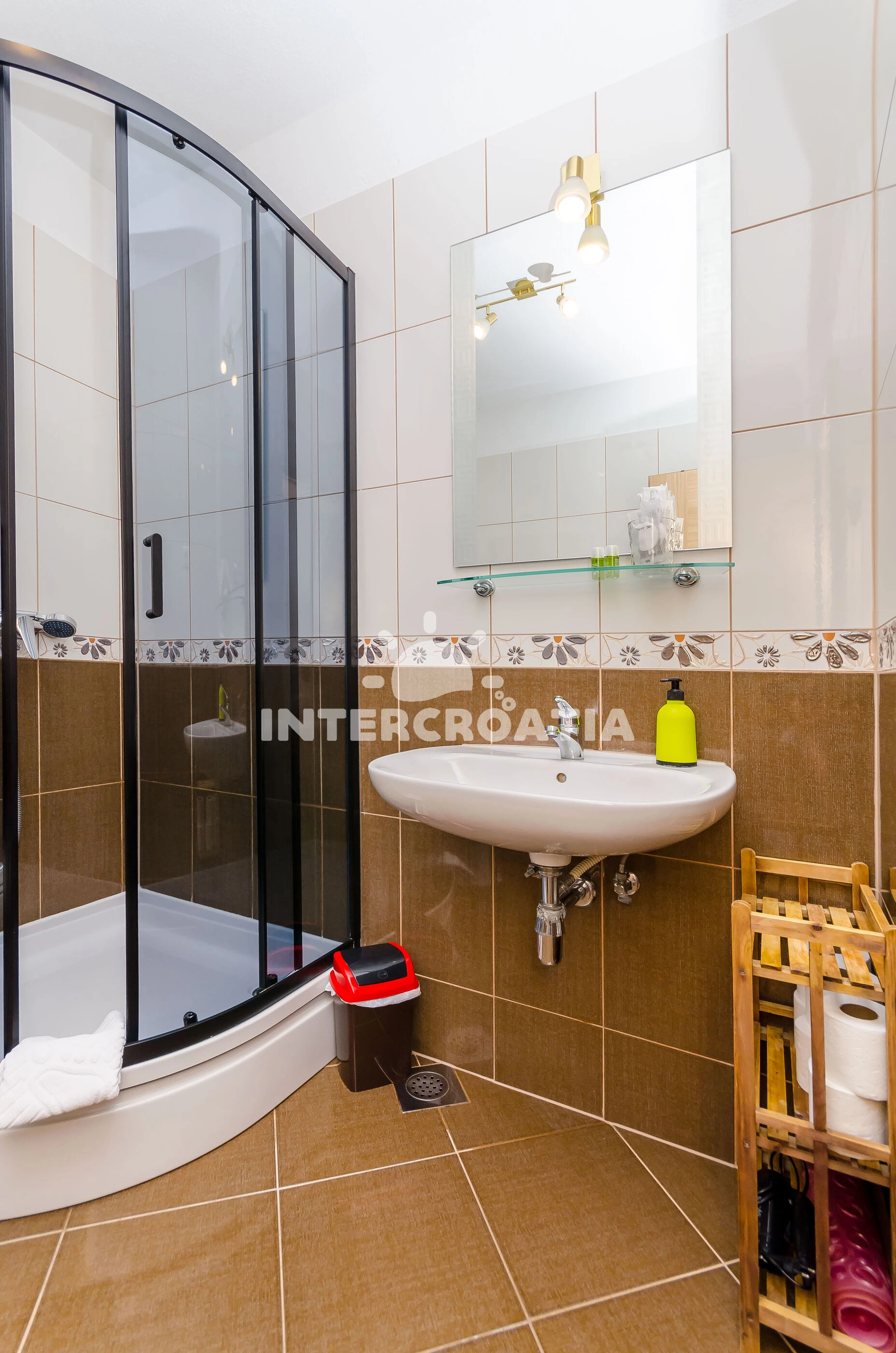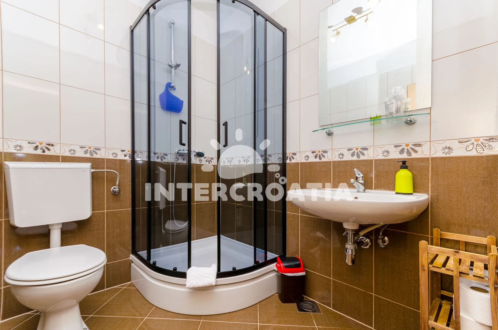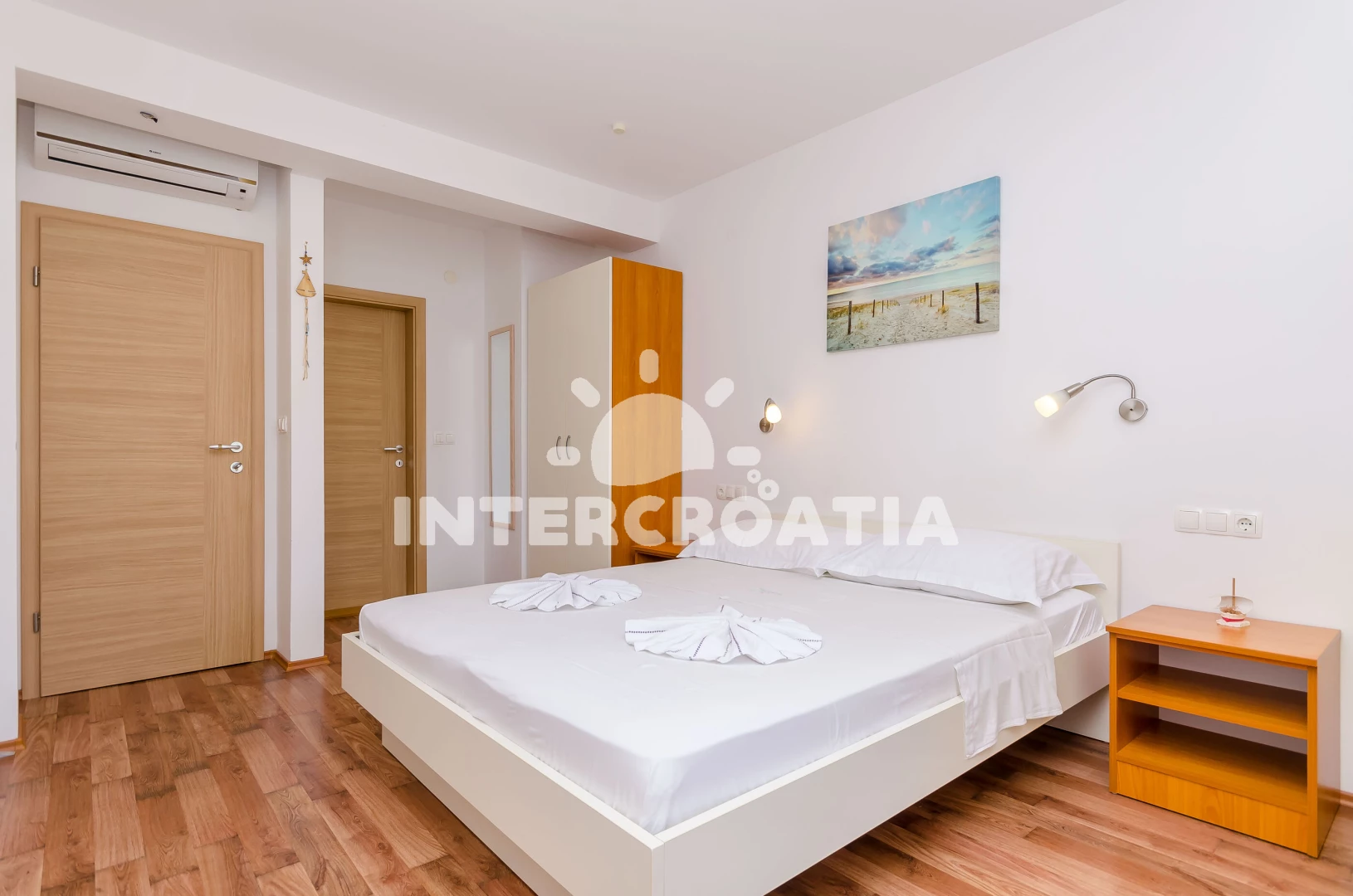 Apartmán se nachází 50 m od moře a pláže. Pláž je skalnatá, oblázková, větší kamení a betonové desky.