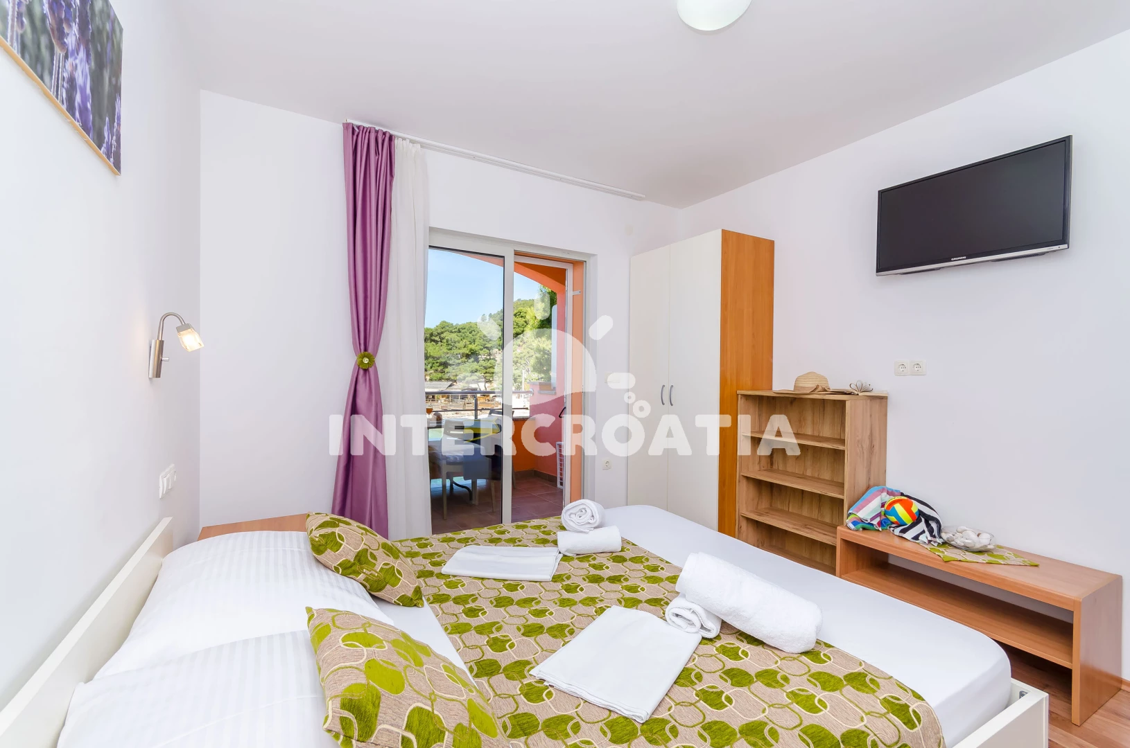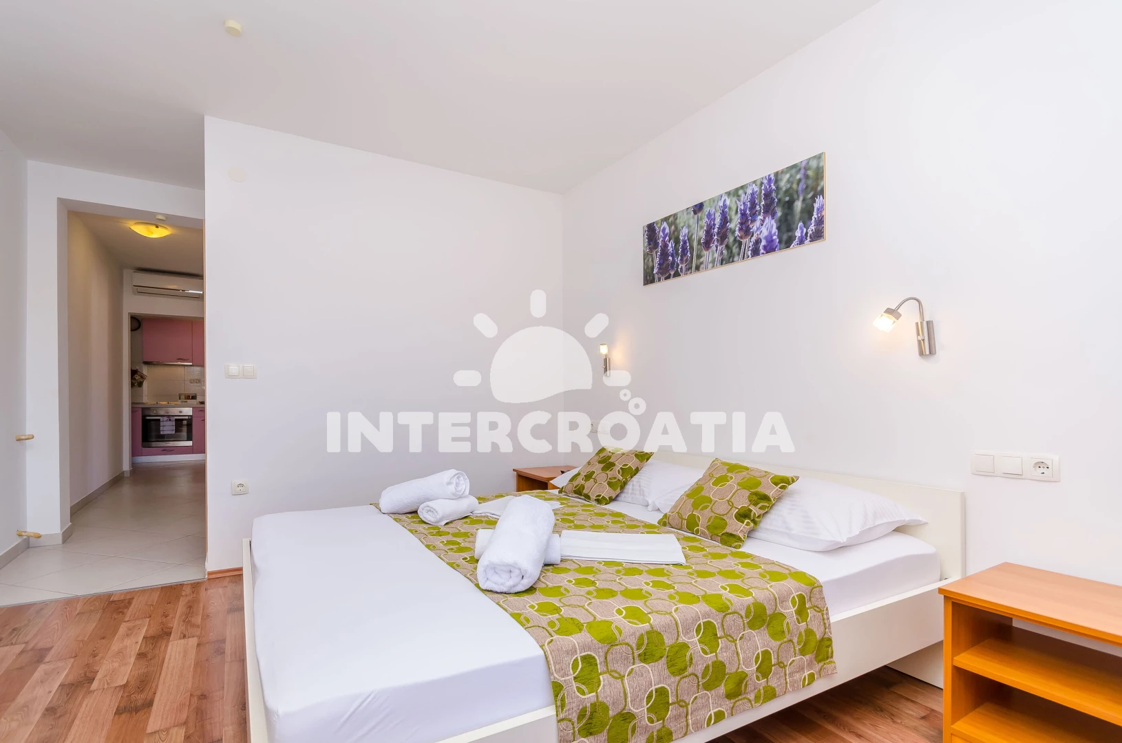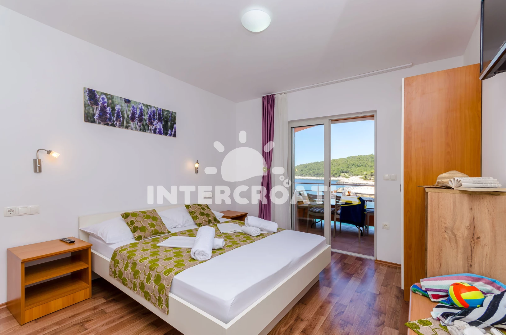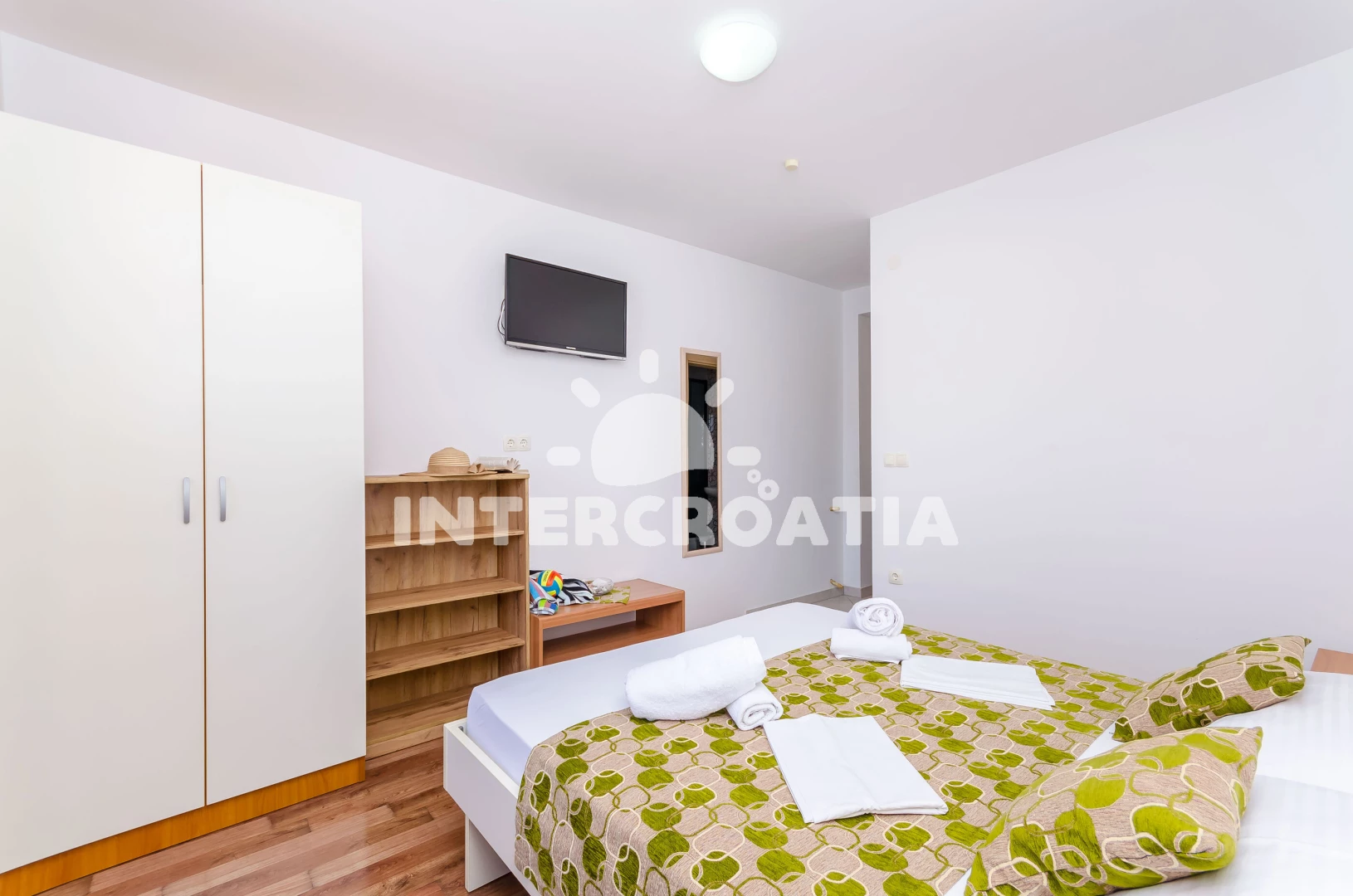 Apartmán (30 m2) s balkonem, a výhledem na moře. Nachází se ve 2. patře objektu. Apartmán má 1 ložnici a je vhodný pro až 2 osoby. Kuchyňská linka je vybavena varnou deskou, toustovačem, kávovarem, troubou, rychlovarnou konvicí, nádobím, lednicí, mrazákem. K dispozici televize se satelitním programem, žehlička. Ložnice s palandou. Koupelna se sprchovým koutem, umyvadlem, fénem a WC.