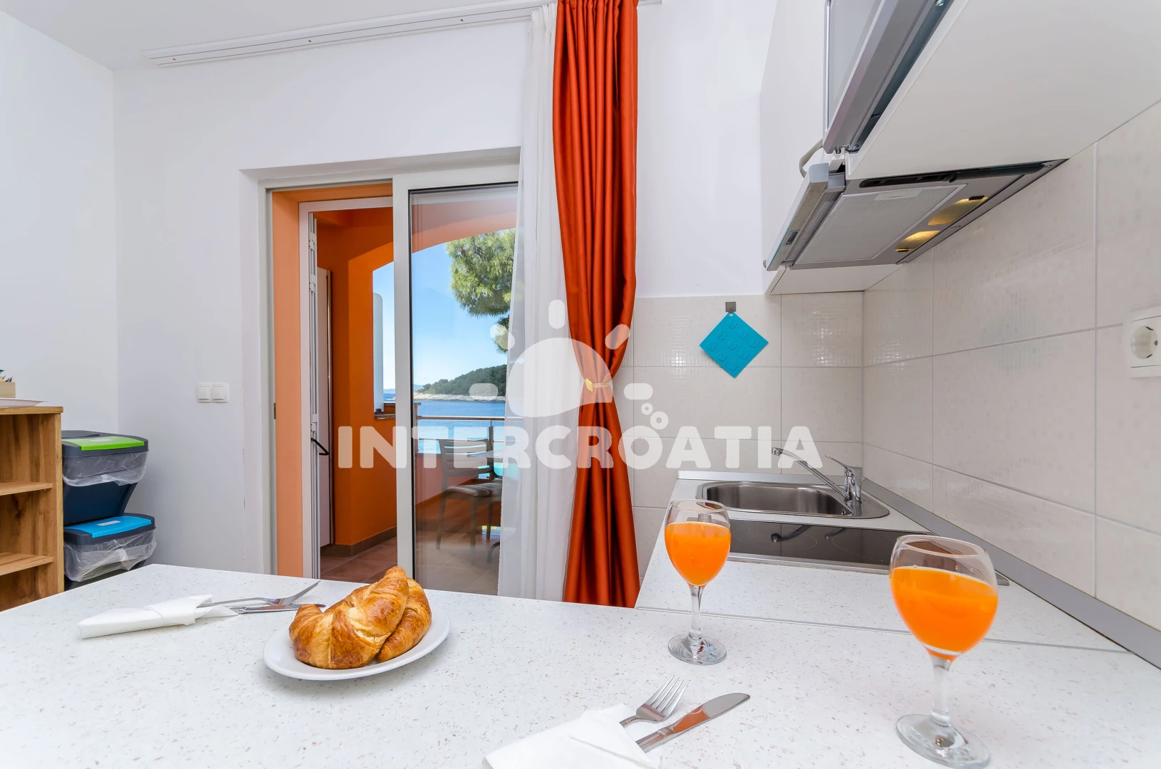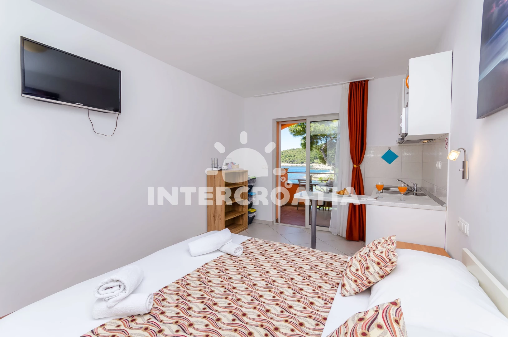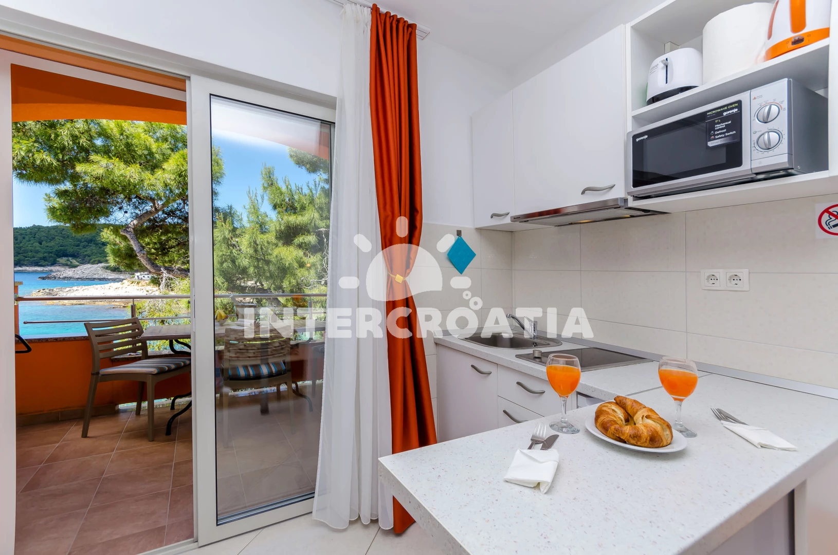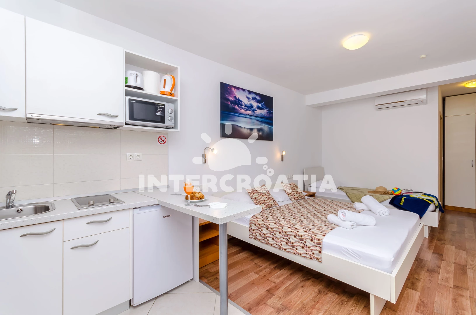 Apartmán typu studio (24 m2) s balkonem, a výhledem na moře. Nachází se ve 2. patře objektu. Kuchyňská linka je vybavena varnou deskou, kávovarem, toustovačem, rychlovarnou konvicí, nádobím, lednicí,…