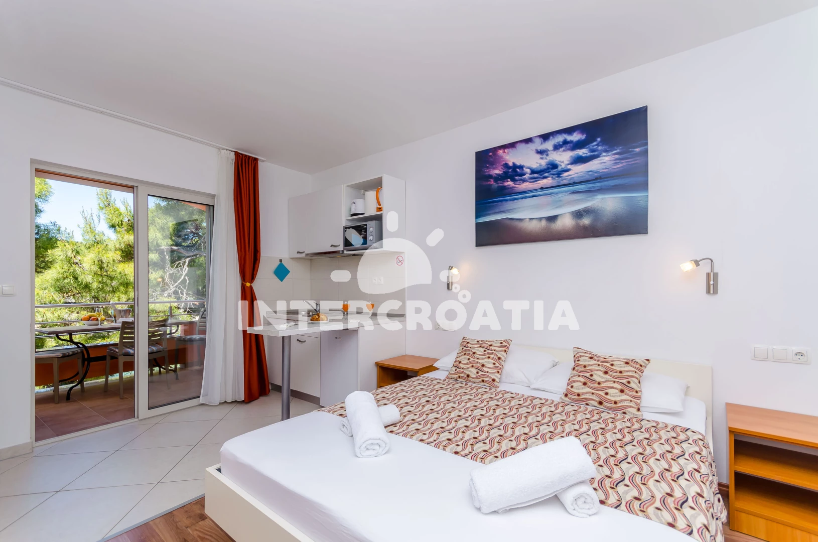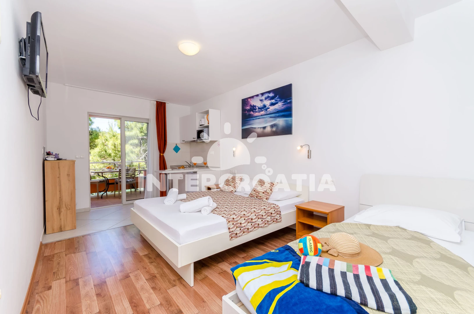 Apartmán typu studio (24 m2) s balkonem, a výhledem na moře. Nachází se ve 2. patře objektu. Kuchyňská linka je vybavena varnou deskou, kávovarem, toustovačem, rychlovarnou konvicí, nádobím, lednicí, mrazákem. K dispozici dvoulůžko, televize se satelitním programem, žehlička. Koupelna se sprchovým koutem, umyvadlem, fénem a WC.