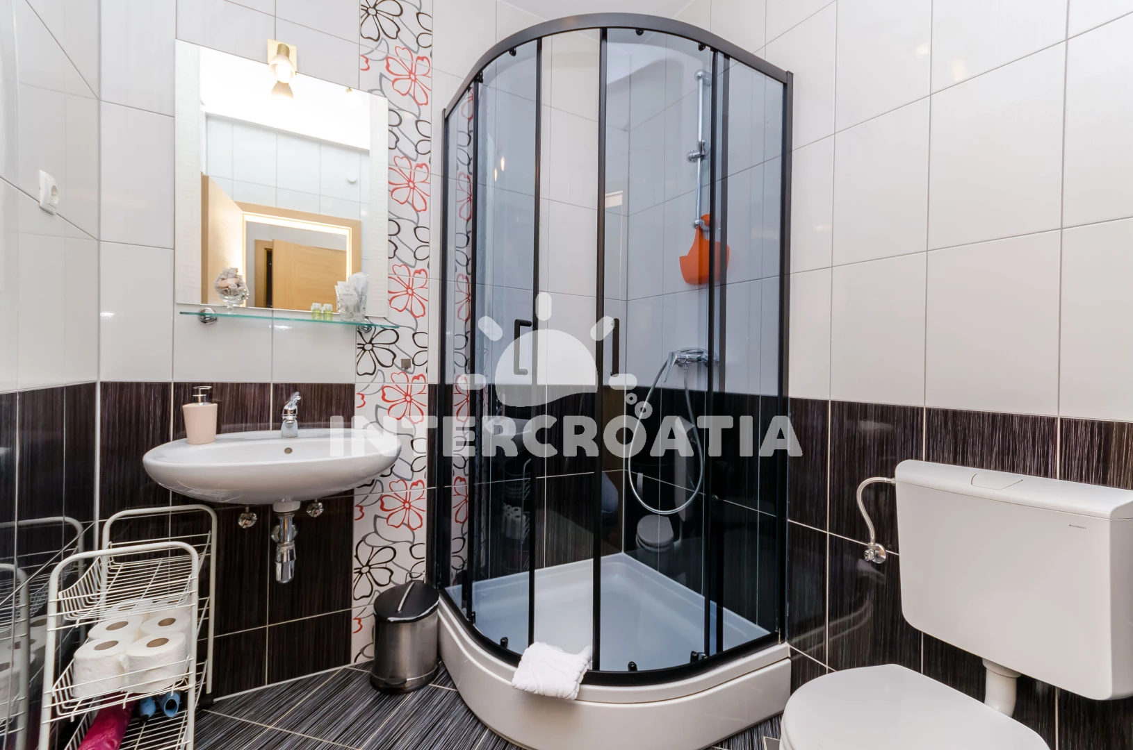 Apartmán se nachází 50 m od moře a pláže. Pláž je skalnatá, oblázková, větší kamení a betonové desky.
