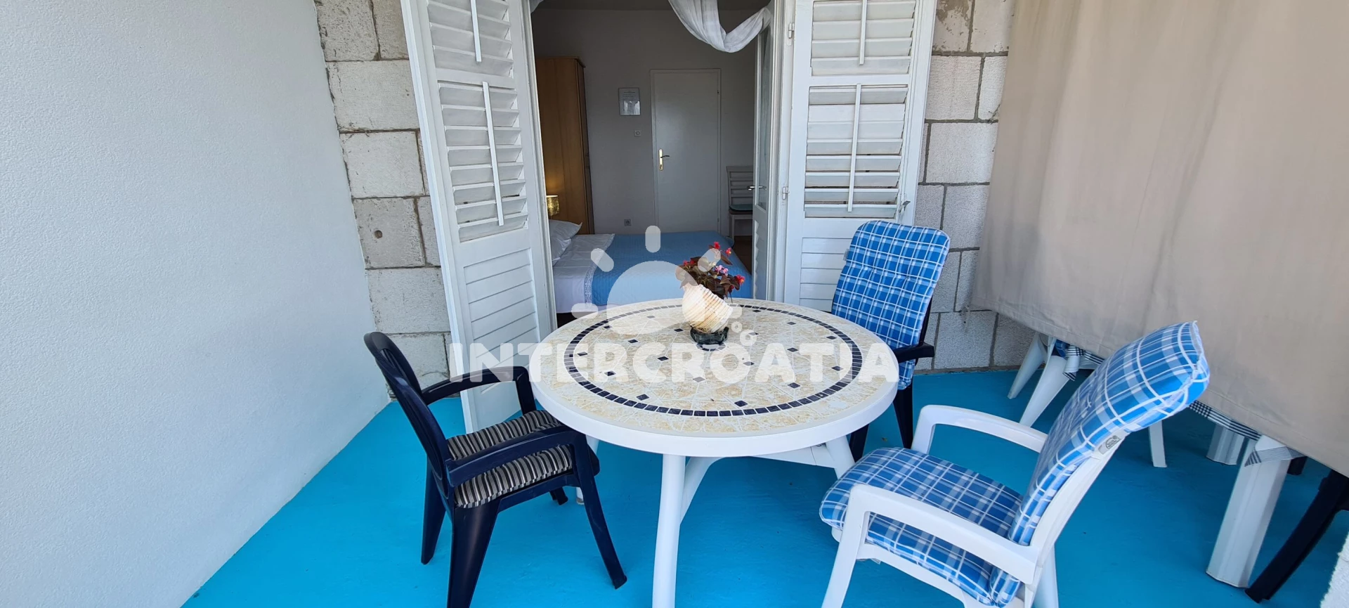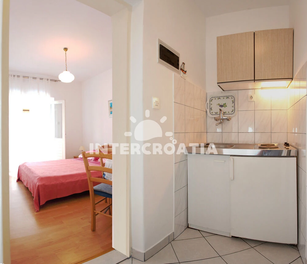 Apartmán typu studio (22 m2) s terasou, a výhledem na moře. Nachází se v 1. patře objektu. Kuchyňská linka je vybavena varnou deskou, nádobím, lednicí, mrazákem. K dispozici dvoulůžko, žehlička.…