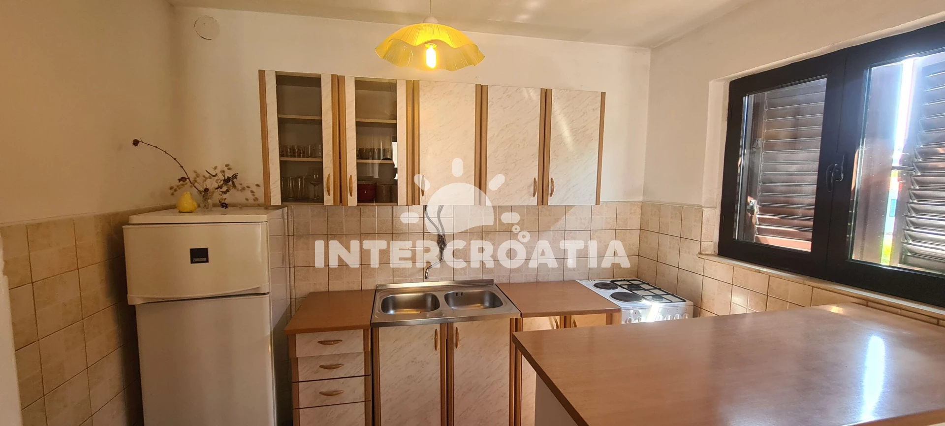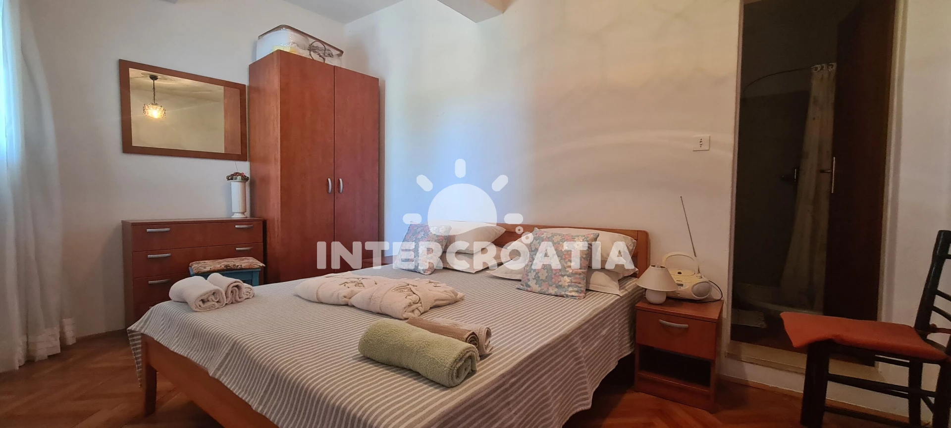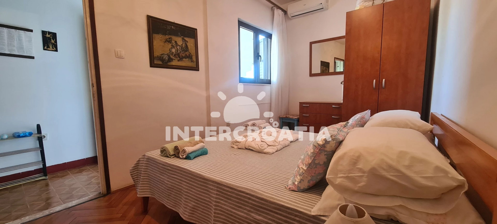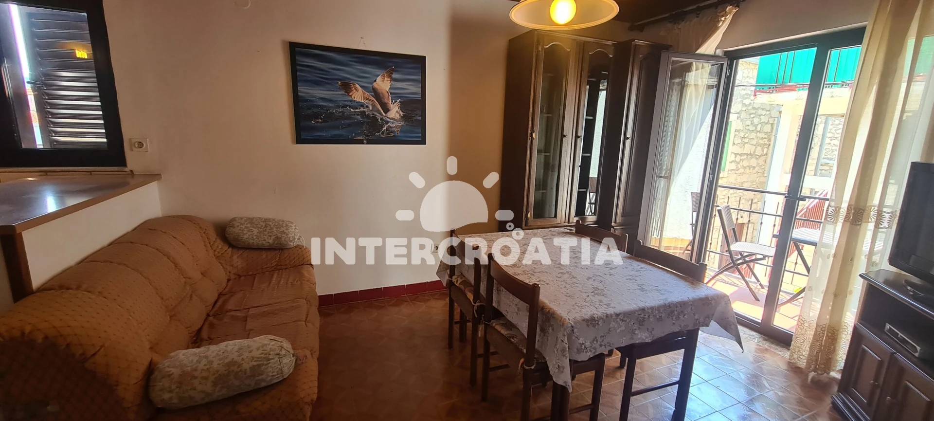 Apartmán se nachází 150 m od moře a pláže. Pláž je skalnatá, oblázková, větší kamení a betonové desky. U objektu je k dispozici společná zahrada s posezením a grilem. Parkování je před domem.