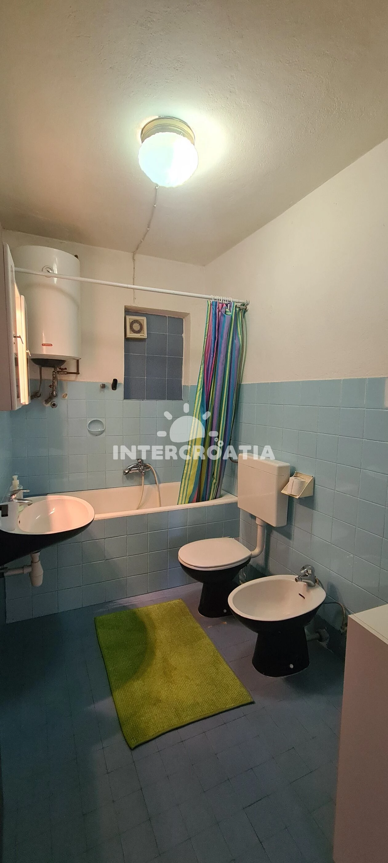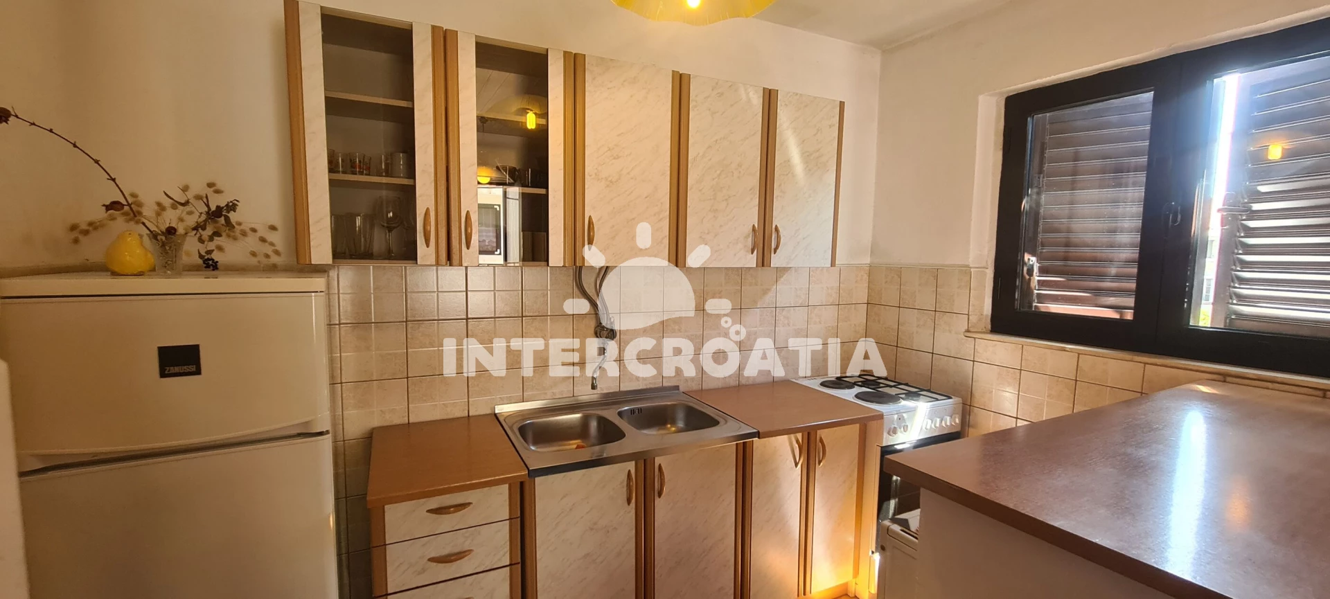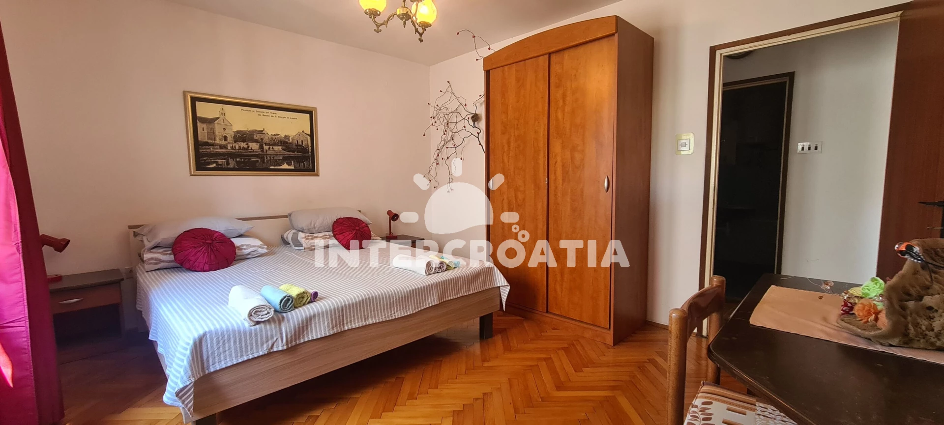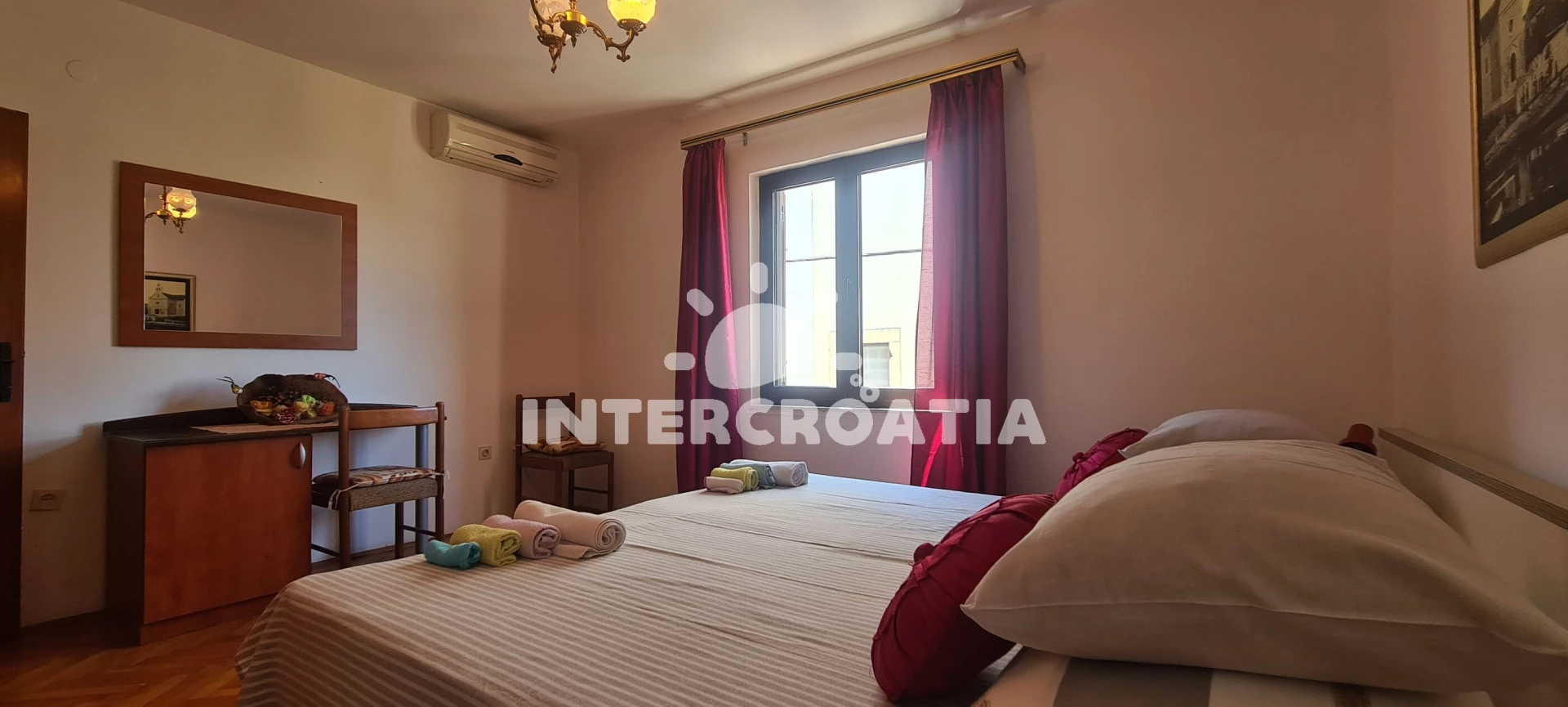 Apartmán se nachází 150 m od moře a pláže. Pláž je skalnatá, oblázková, větší kamení a betonové desky. U objektu je k dispozici společná zahrada s posezením a grilem. Parkování je před domem.
