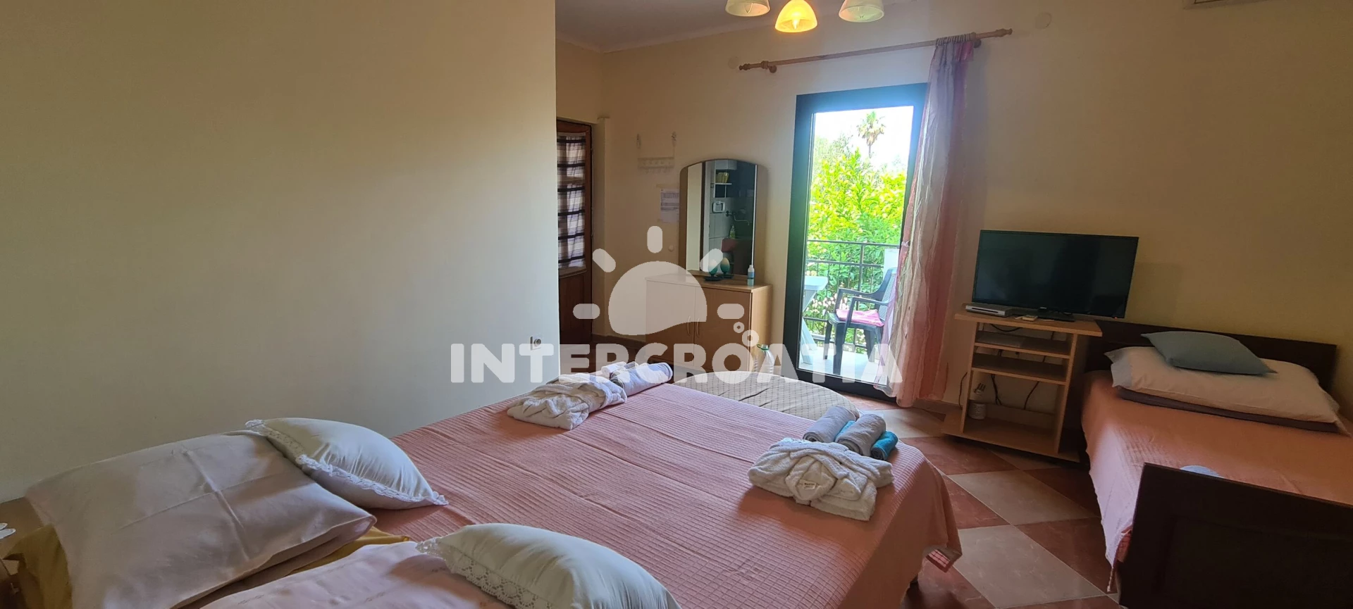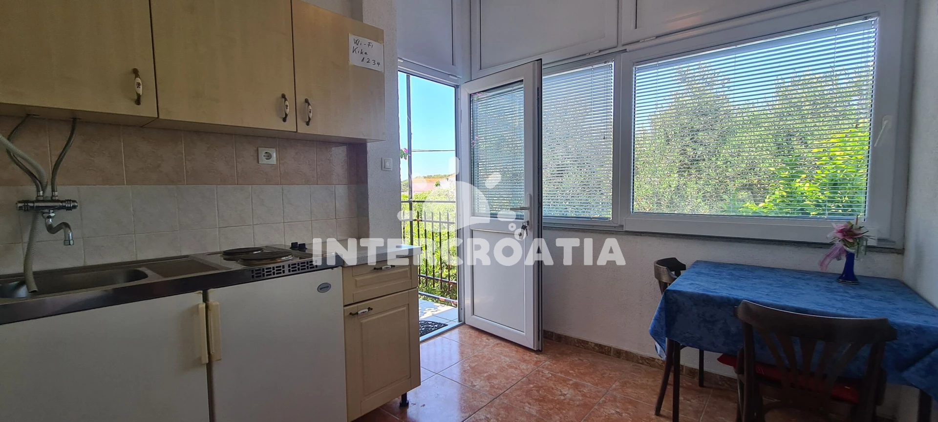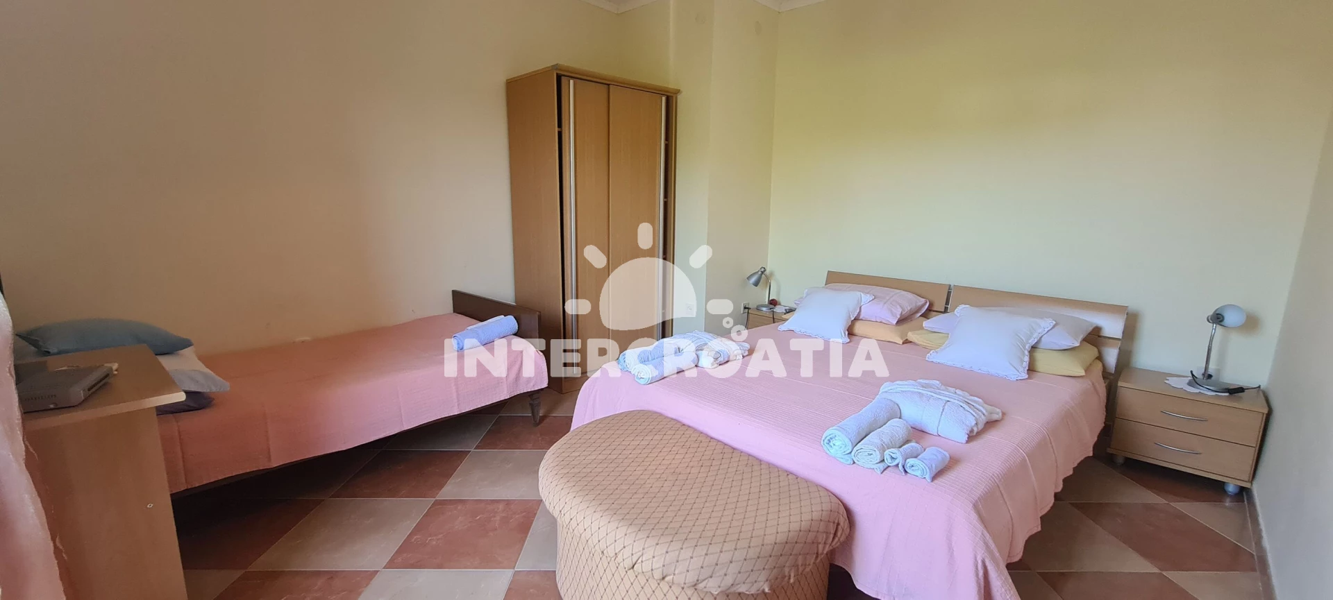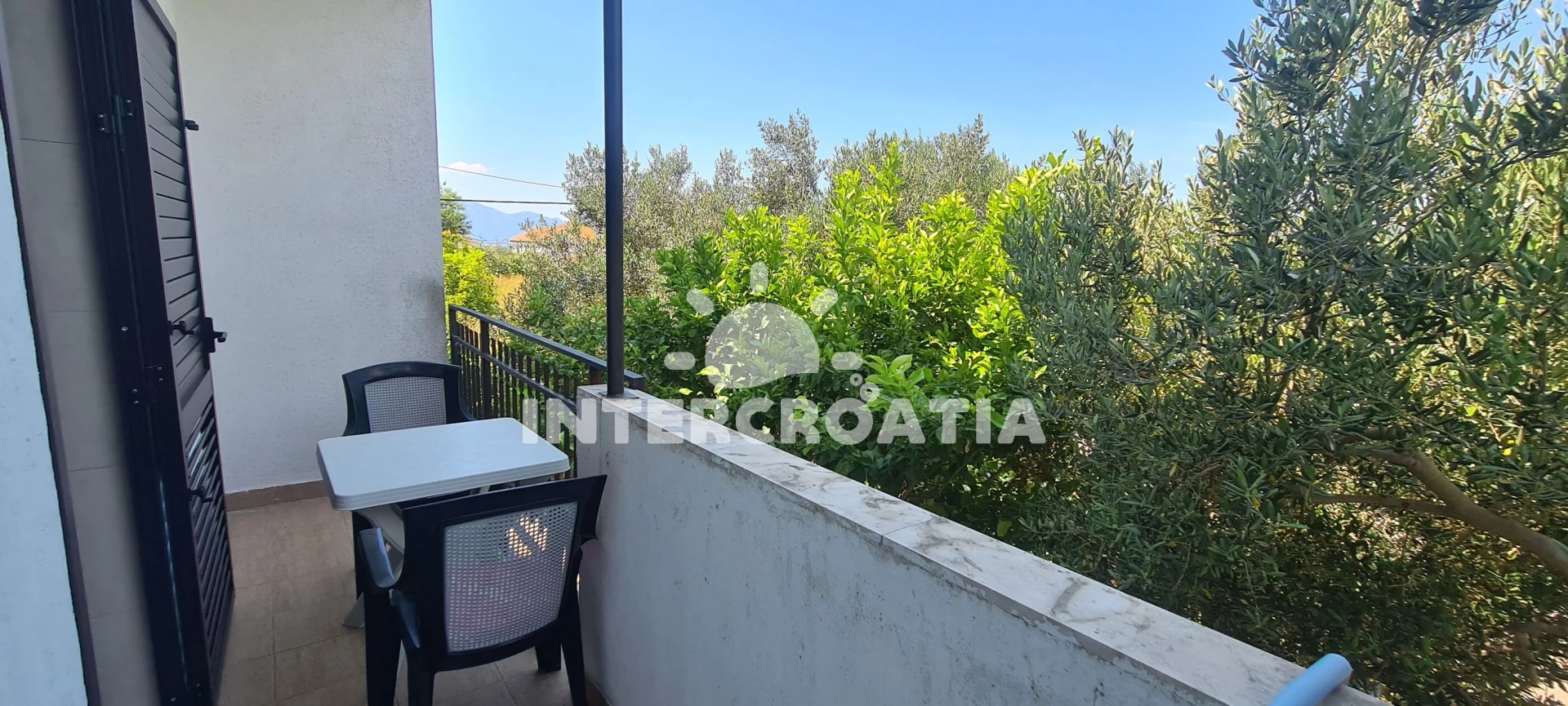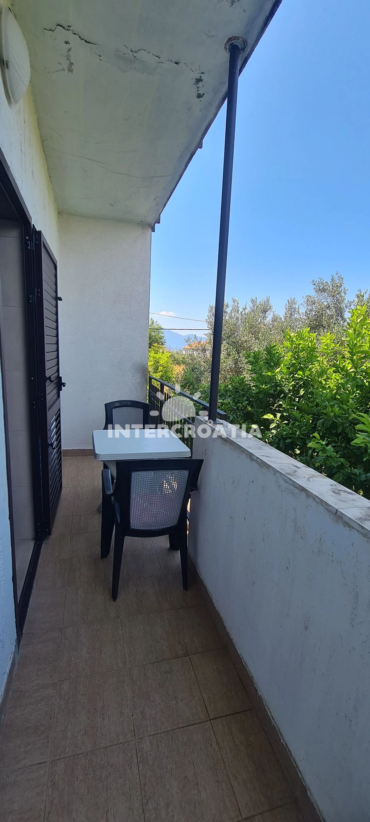 Apartmán se nachází 150 m od moře a pláže. Pláž je skalnatá, oblázková, větší kamení a betonové desky. U objektu je k dispozici společná zahrada s posezením a grilem. Parkování je před domem.