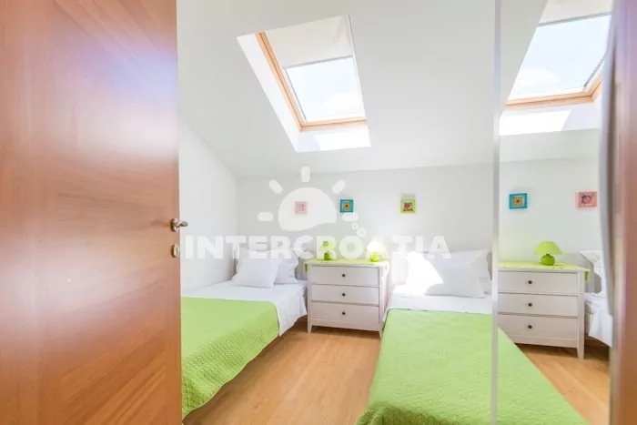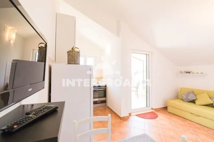 Podkrovní apartmán (50 m2) s terasou a venkovním posezením. Apartmán má 2 ložnice a je vhodný pro 4 osoby. Obývací pokoj je spojený s kuchyní. Kuchyňská linka je vybavena dvouplotýnkovým vařičem, troubou, rychlovarnou konvicí, kávovarem, nádobím a lednicí s mrazákem. Obývací pokoj s jídelním stolem, pohovkou, televizí se satelitním programem, klimatizací a vstupem na terasu. První ložnice s dvoulůžkem a vstupem na terasu. Druhá ložnice s dvěma jednolůžky. Koupelna se sprchovým koutem, umyvadlem a wc. Hostům je k dispozici parkování u objektu zdarma.