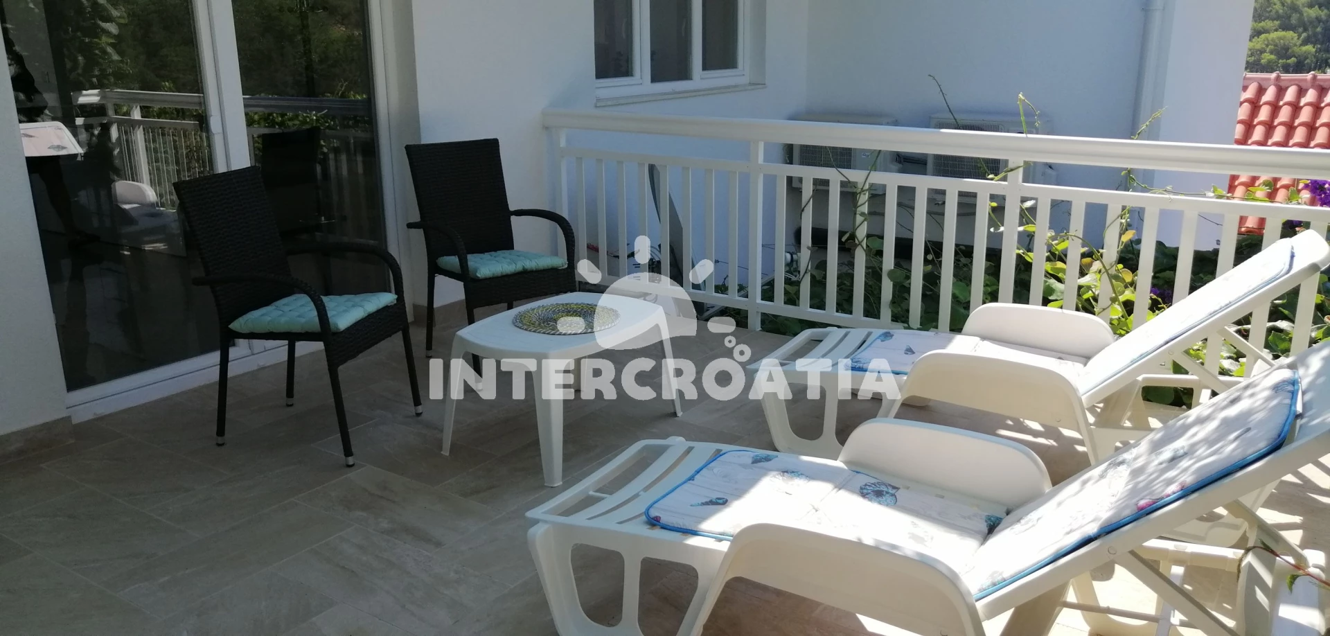 Apartmán se nachází 50 m od moře a pláže. Pláž je písčitá, skalnatá, oblázková, větší kamení a betonové desky. U objektu je k dispozici společná zahrada s posezením a grilem. Parkování je před domem.