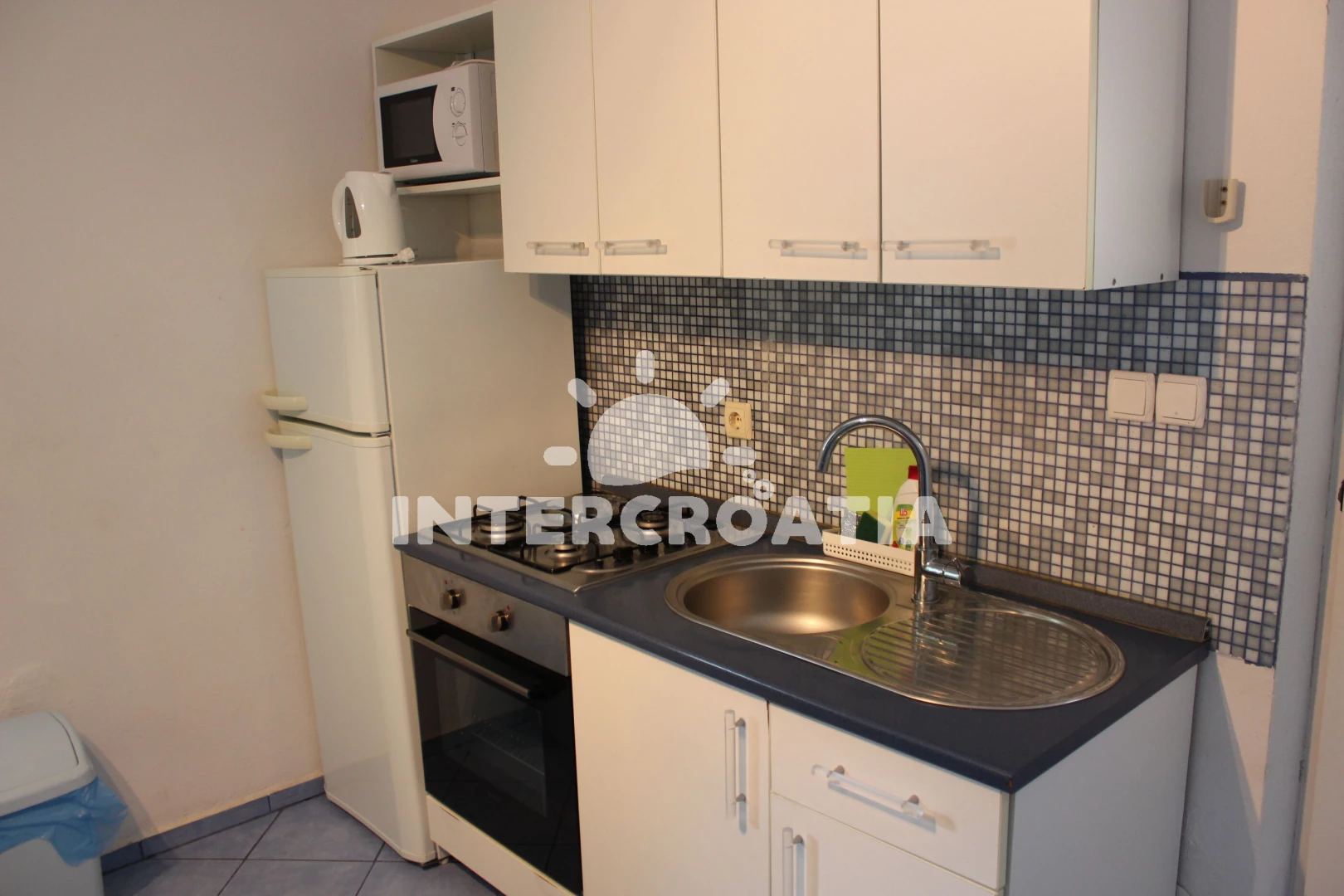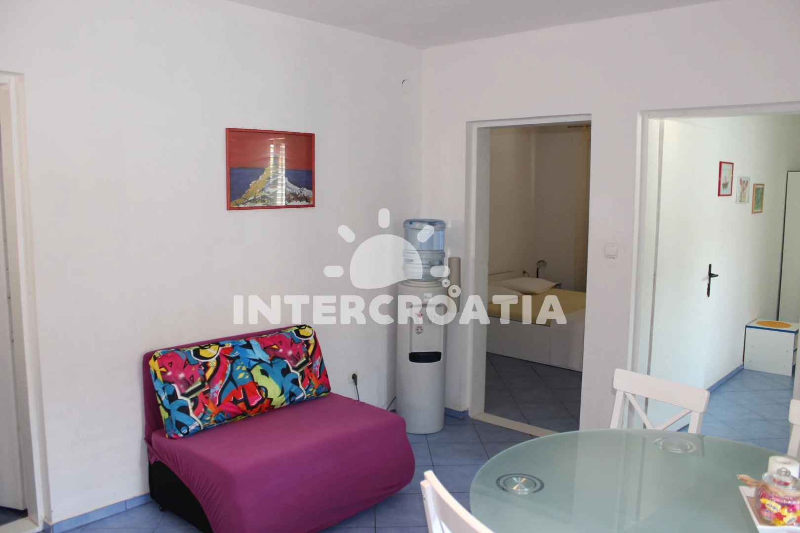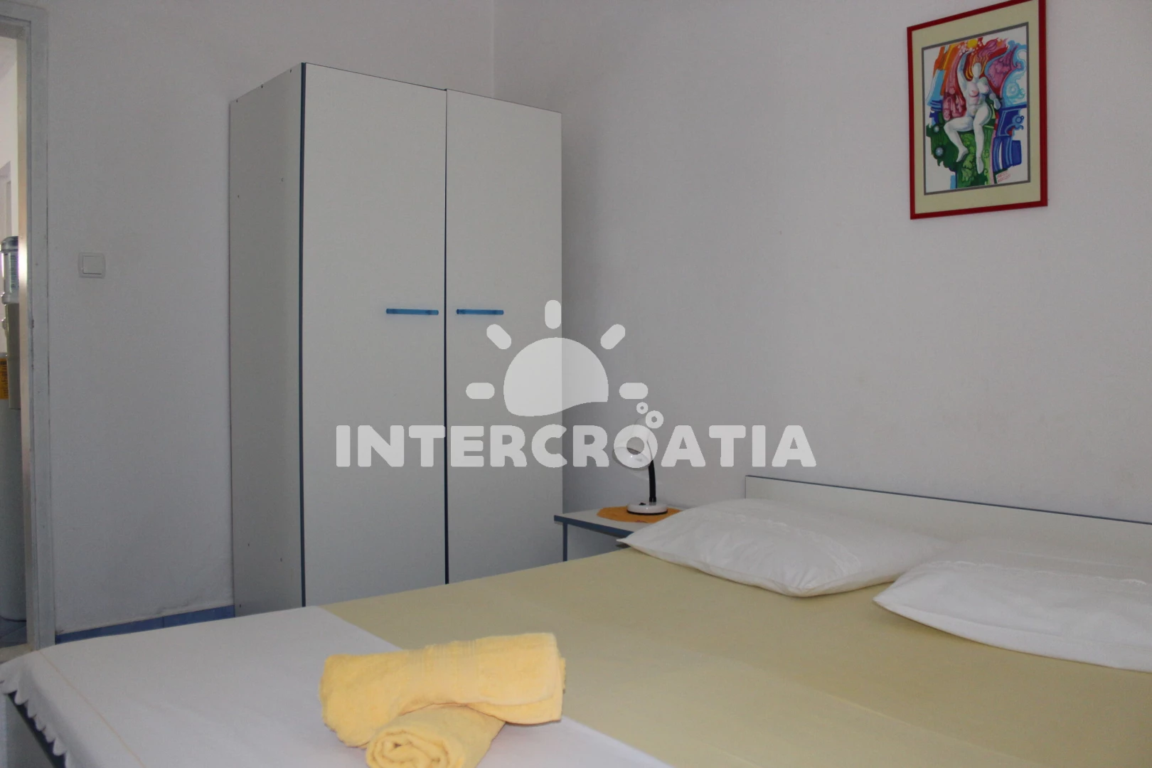 Apartmán se nachází 150 m od moře a pláže. Pláž je skalnatá, oblázková, větší kamení a betonové desky. U objektu je k dispozici společná zahrada s posezením a grilem. Parkování je před domem.