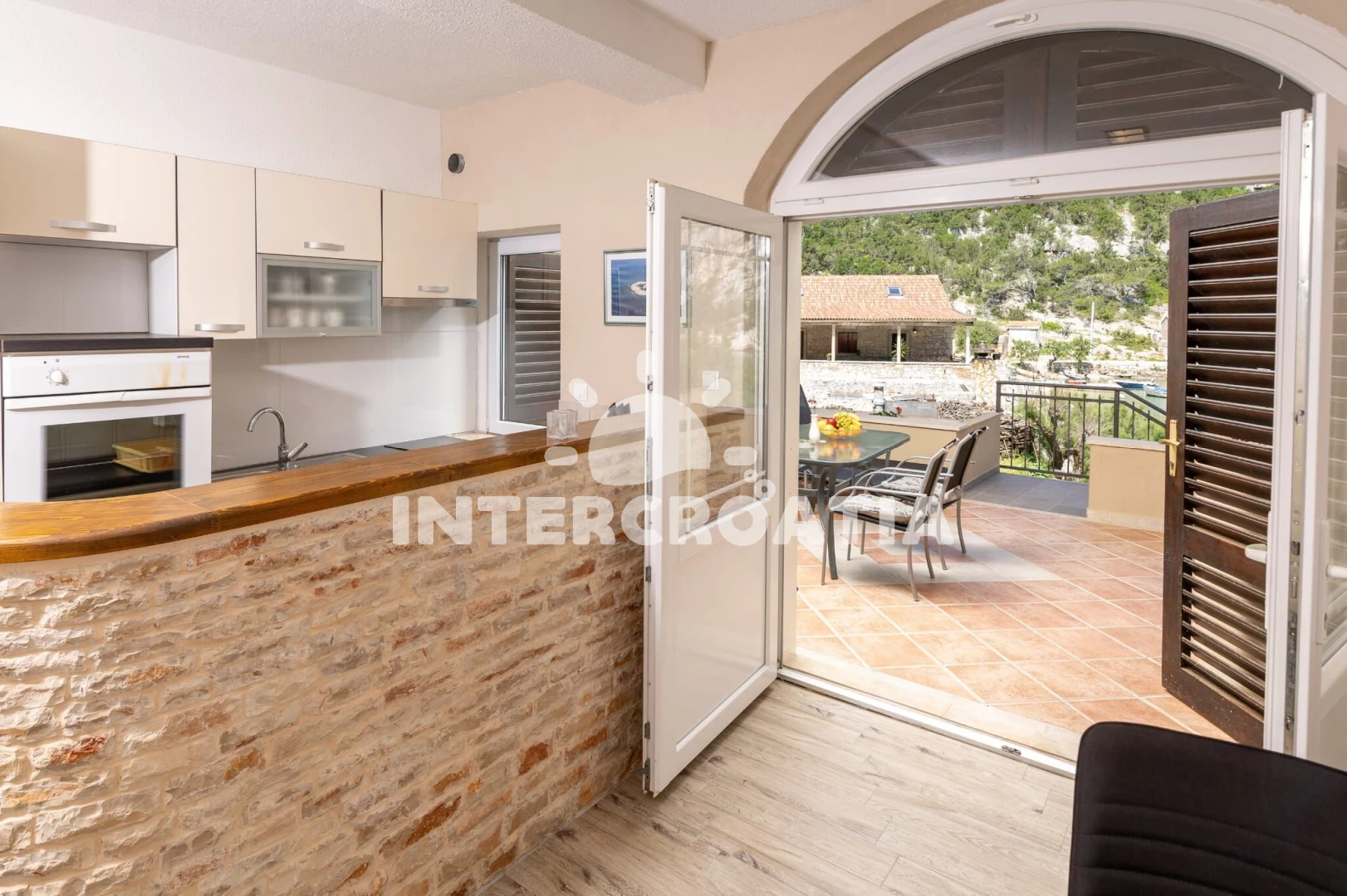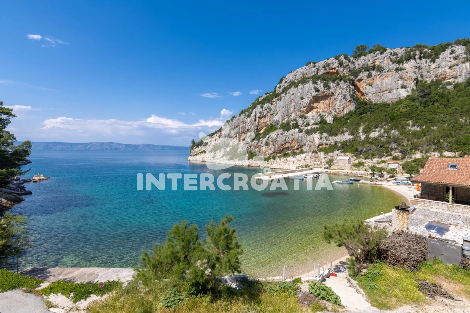 Vzdálenosti: Moře 30 m, pláž 30 m (skalnatá, oblázková, větší kamení a betonové desky), bar 50 m, restaurace 50 m, centrum 3 km, supermarket 3 km, veřejná doprava 3 km, pošta 3 km, lékárna 21 km, ambulance 21 km, směnárna 21 km, čerpací stanice 21 km, potápění 21 km, banka 21 km, trajekt (Stari Grad) 30 km,