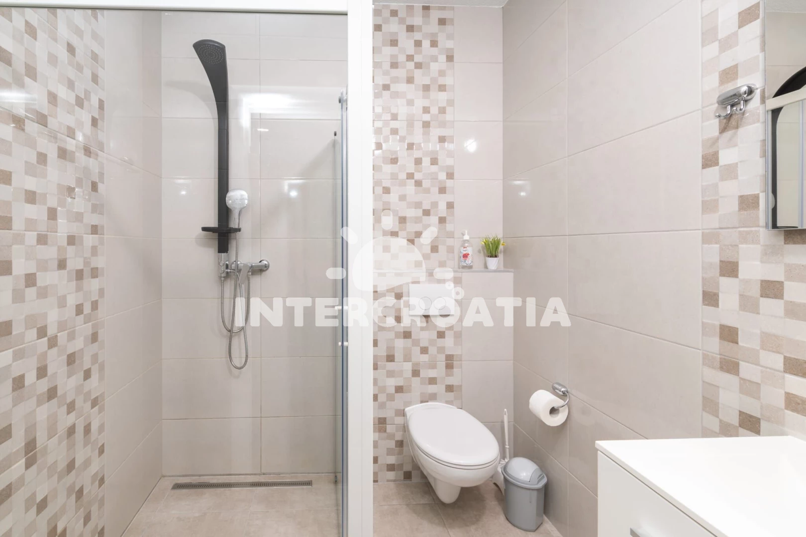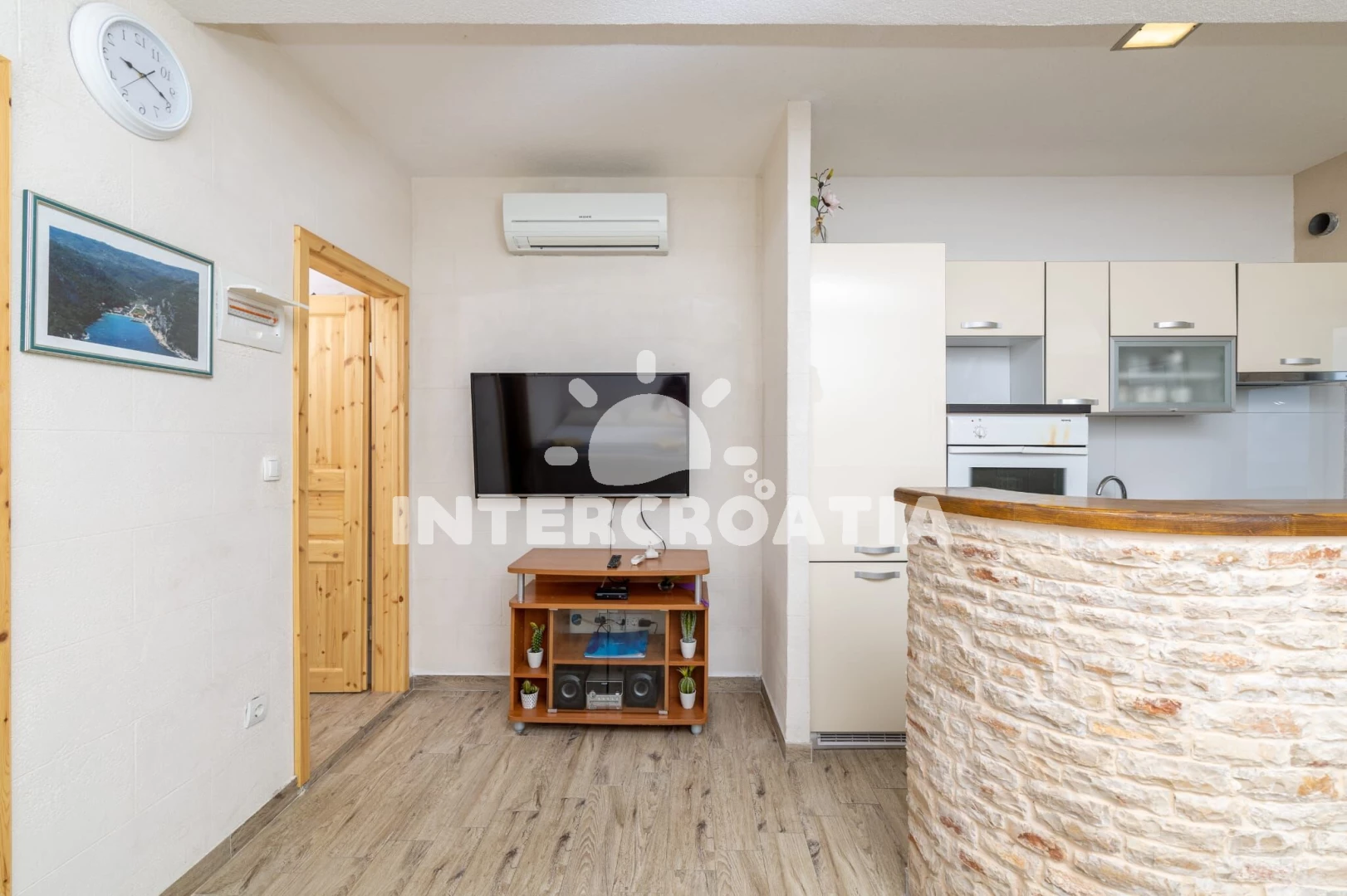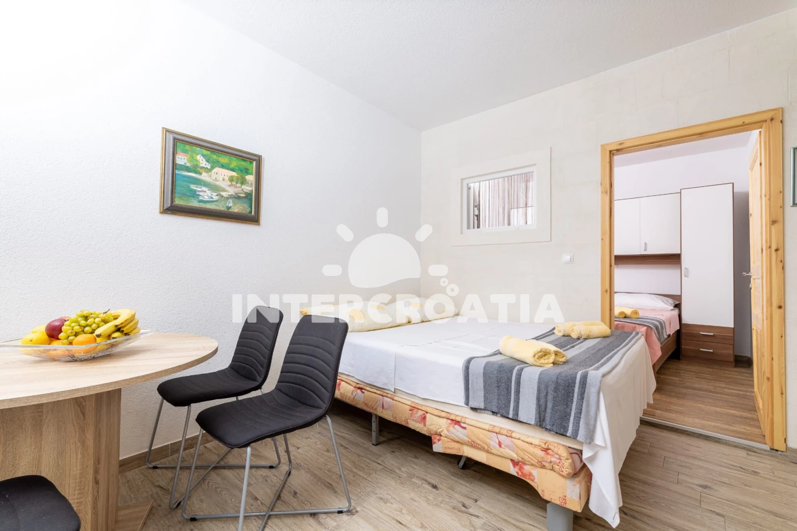 Apartmán se nachází 30 m od moře a pláže. Pláž je skalnatá, oblázková, větší kamení a betonové desky. Parkování je 50m - 150 m od domu.