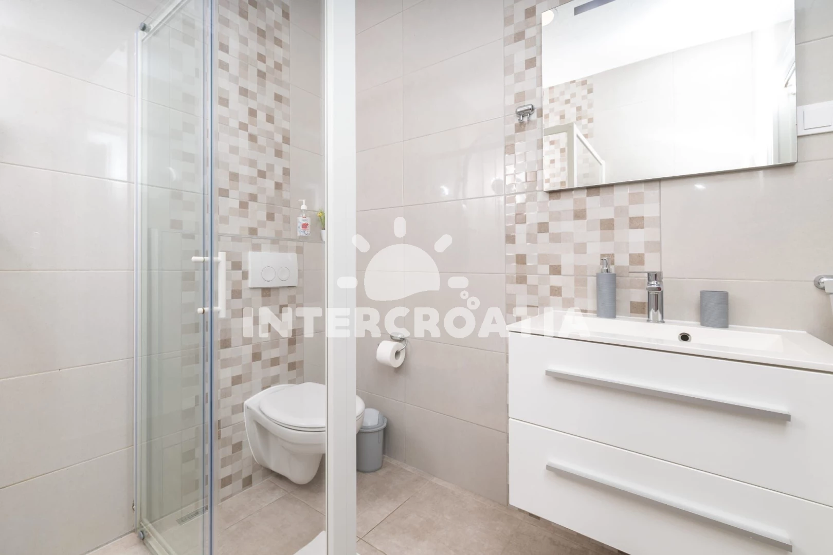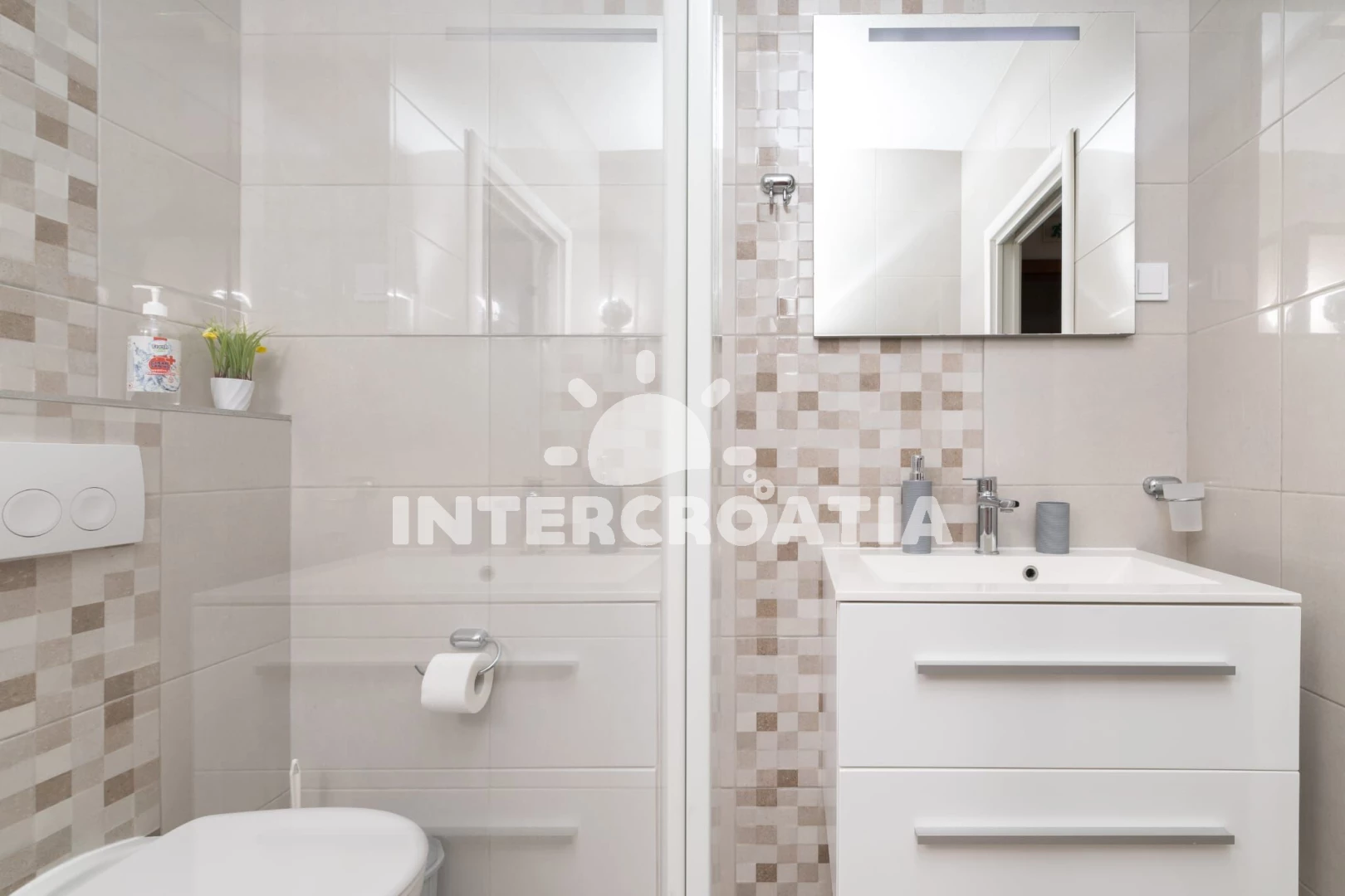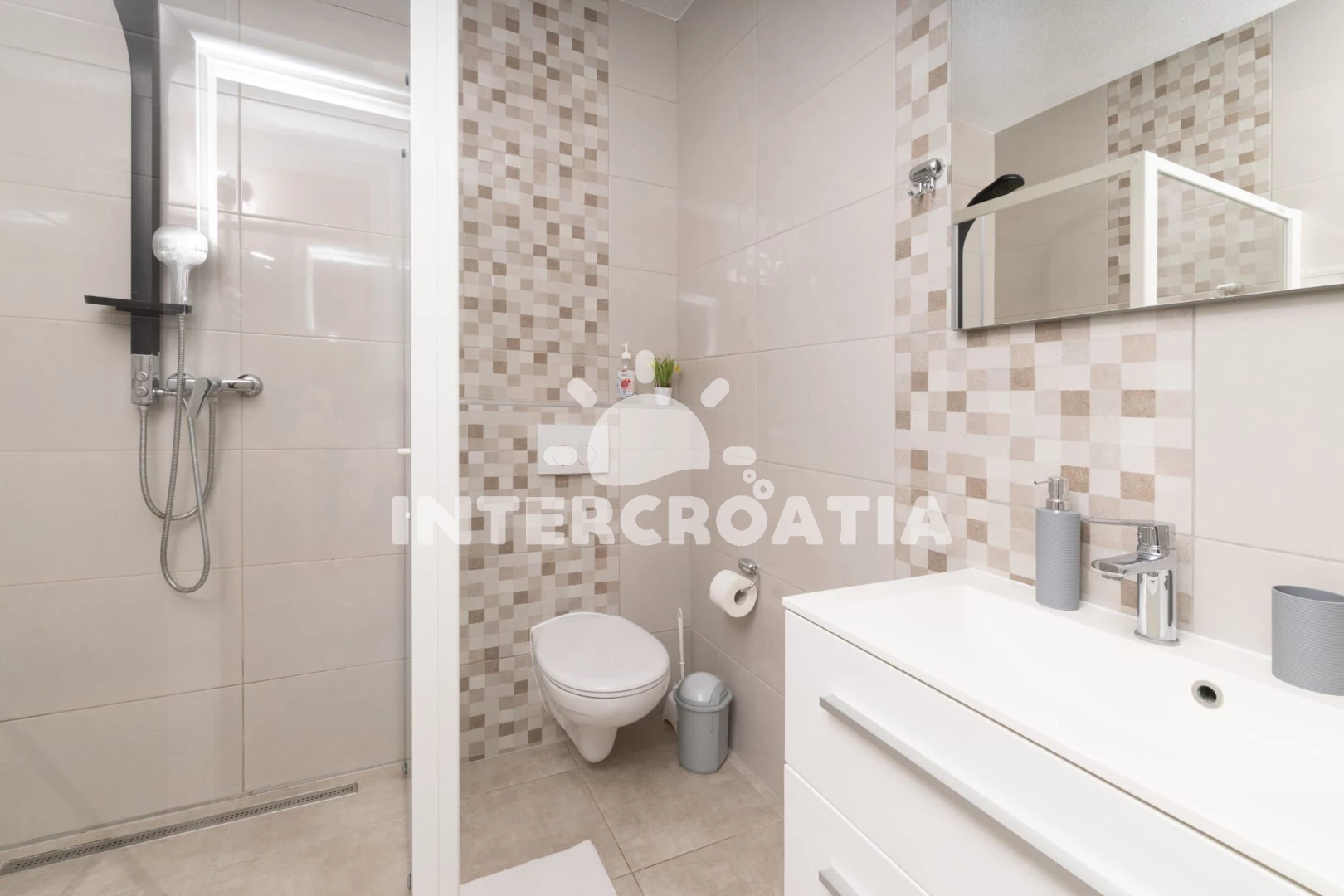 Apartmán se nachází 30 m od moře a pláže. Pláž je skalnatá, oblázková, větší kamení a betonové desky. Parkování je 50m - 150 m od domu.
