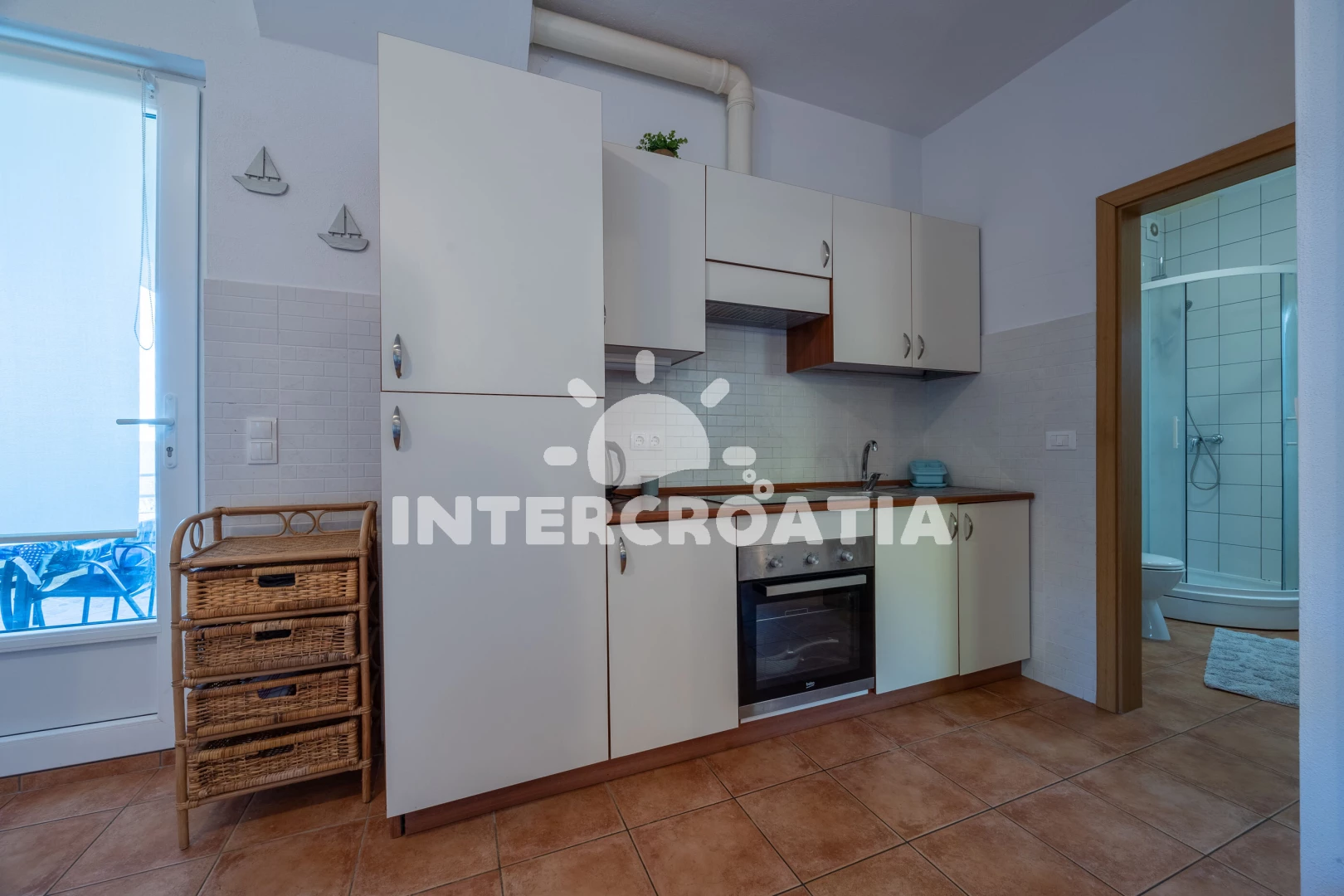 Apartmán se nachází 70 m od moře a pláže. Pláž je oblázková. U objektu je k dispozici společná zahrada s posezením a grilem. Parkování je před domem.