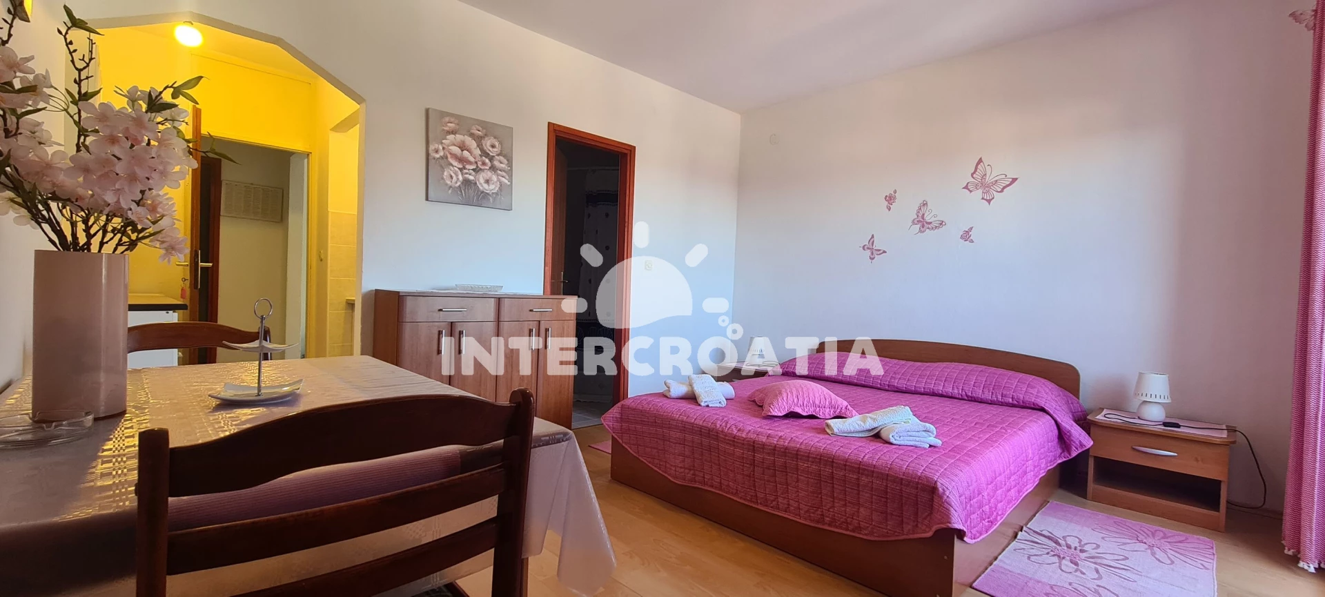 Apartmán se nachází 250 m od moře a pláže. Pláž je skalnatá, oblázková a betonové desky. U objektu je k dispozici společná zahrada s posezením a grilem. Parkování je před domem.
