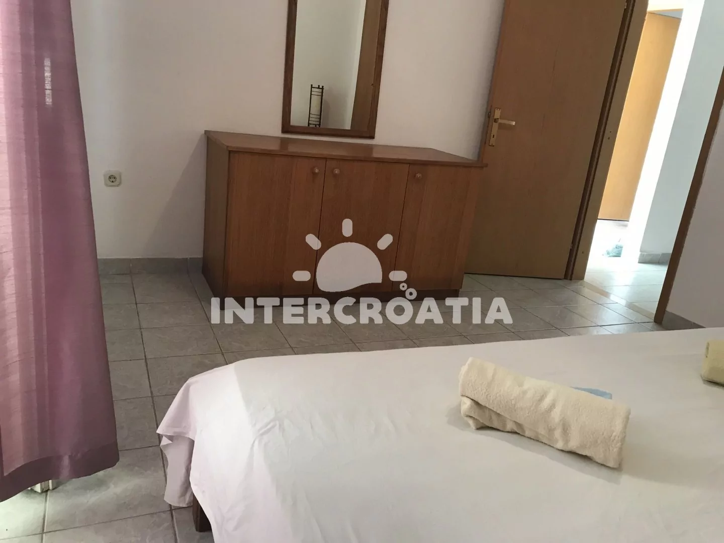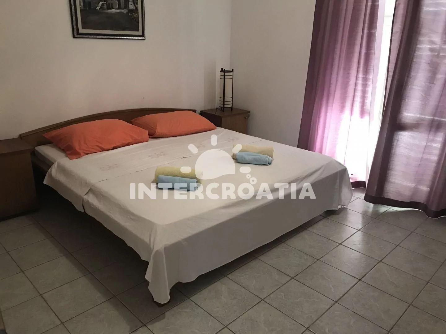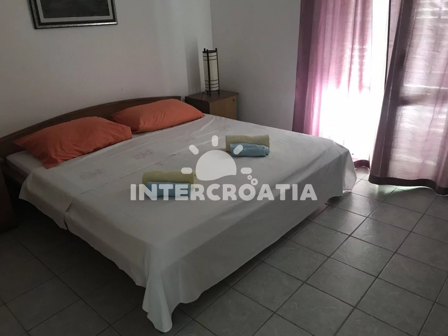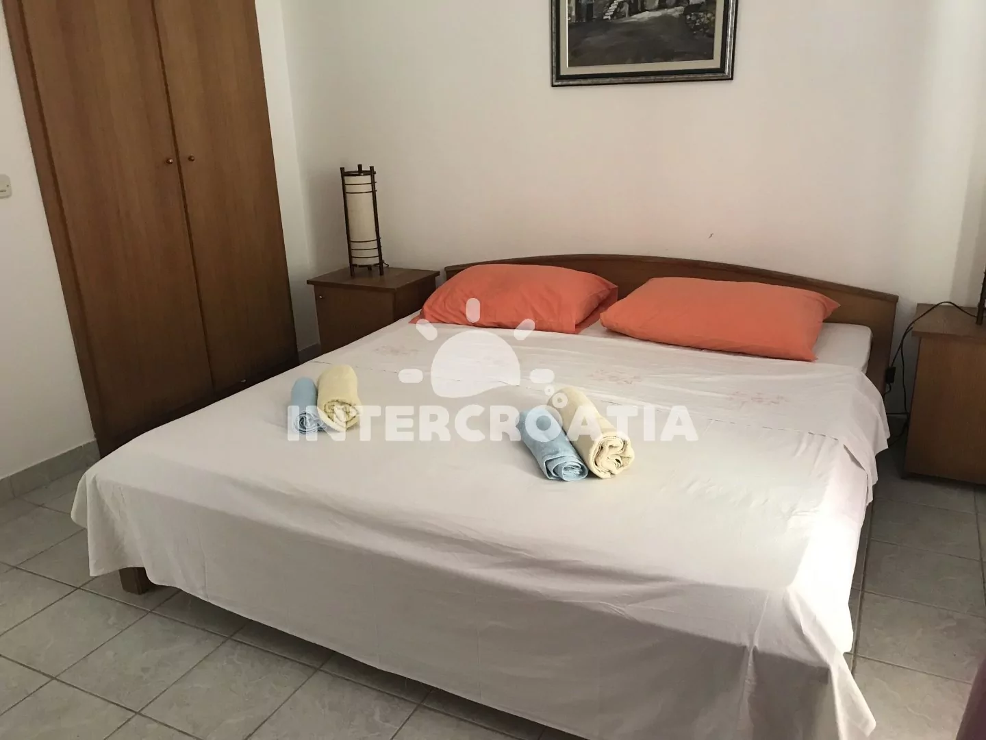Apartmán v přízemí domu je vhodný pro 4 osoby, disponuje výhledem na moře a terasou s posezením. Kuchyň je vybavena jídelním stolem pro 4 osoby, kuchyňskou linkou se sporákem, troubou, rychlovarnou konvicí, kávovarem, nádobím a chladničkou s mrazákem. Obývací pokoj s rohovou pohovkou a televizí se satelitním programem. První i druhá ložnice je vybavena vždy s jedním dvoulůžkem. Dvě koupelny se sprchovým koutem, umyvadlem a wc. Hosté mají k dispozici klimatizaci, WiFi, sejf a žehličku. Fén a pračka u pronajímatele (služba na požádání).