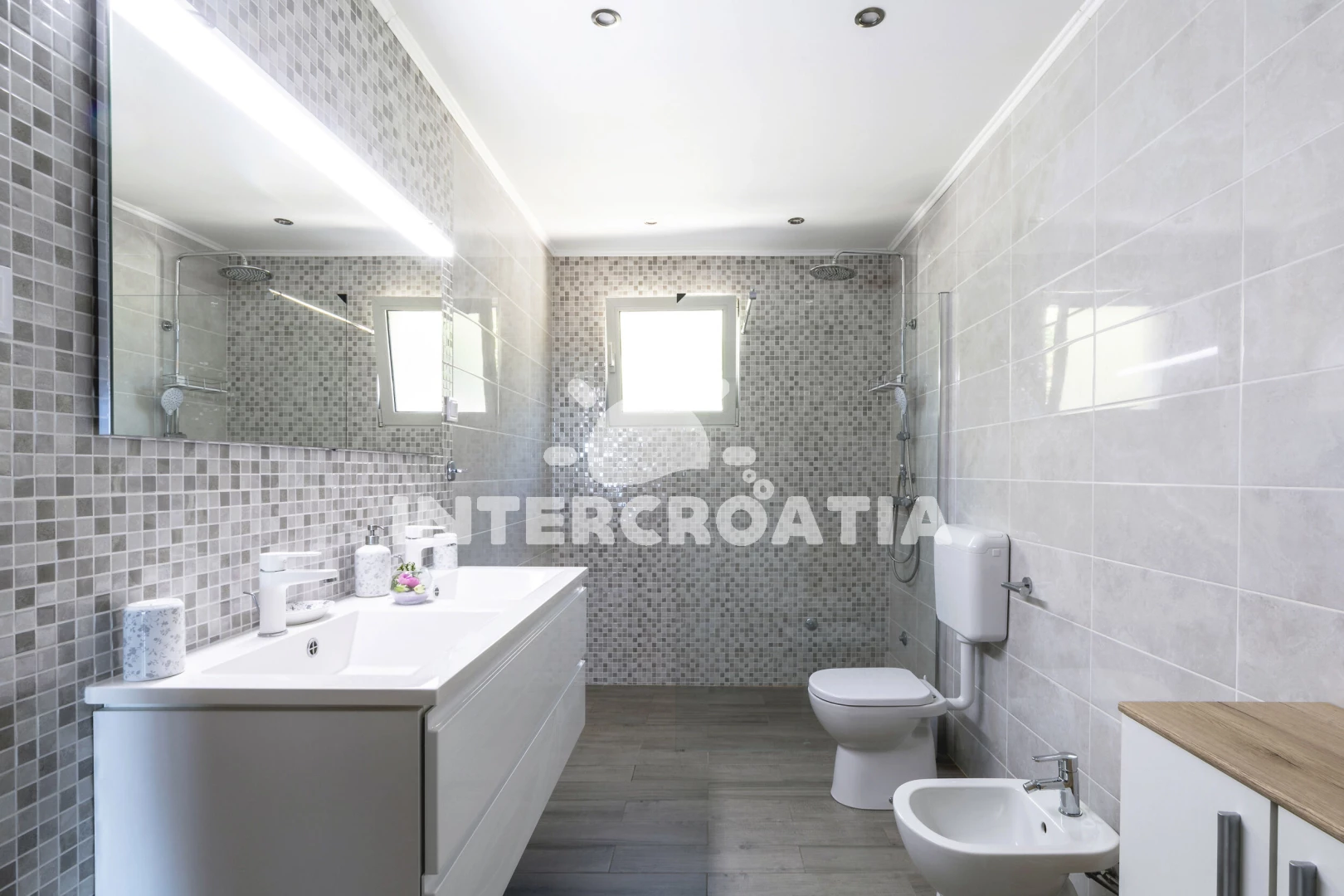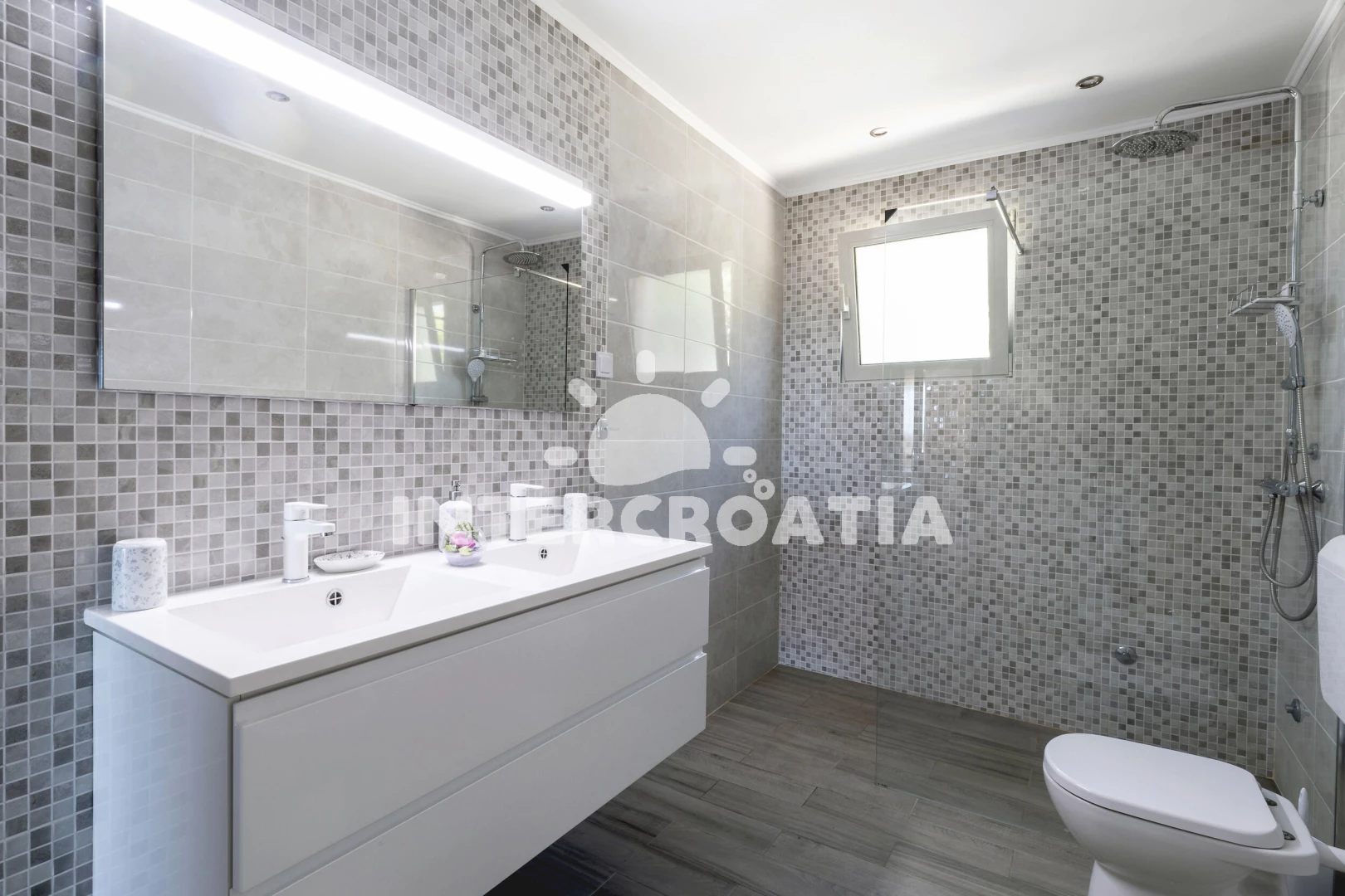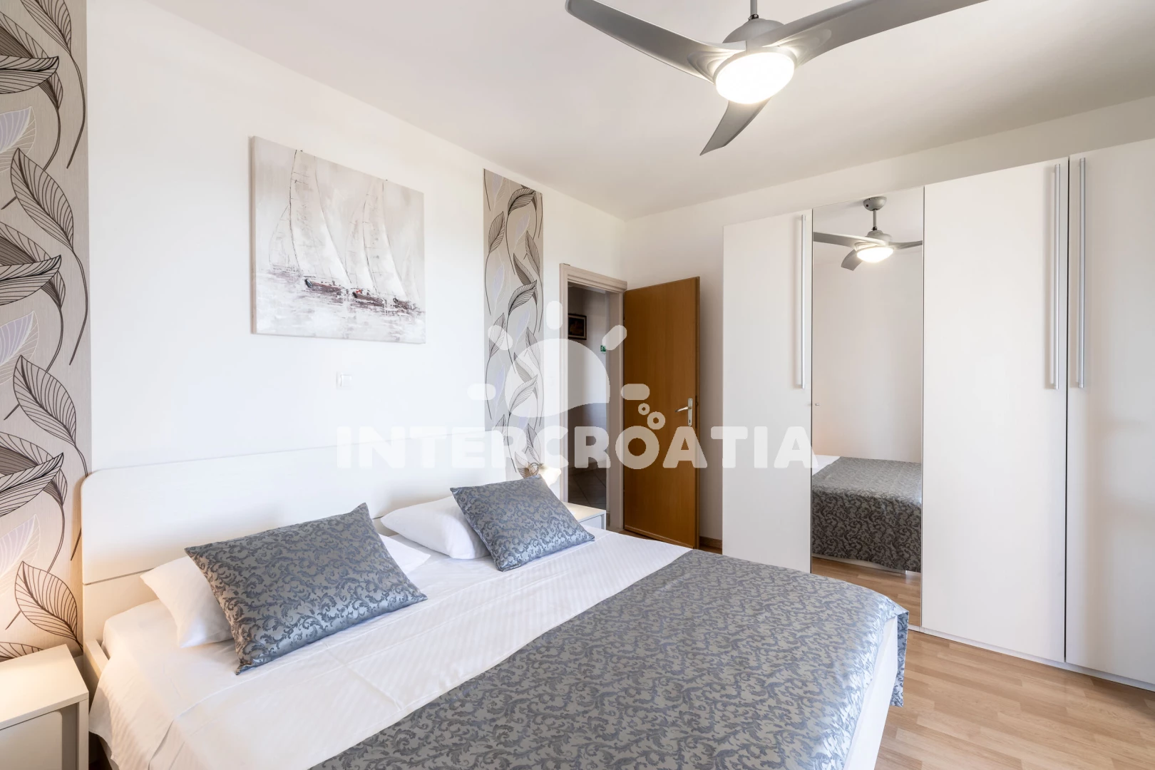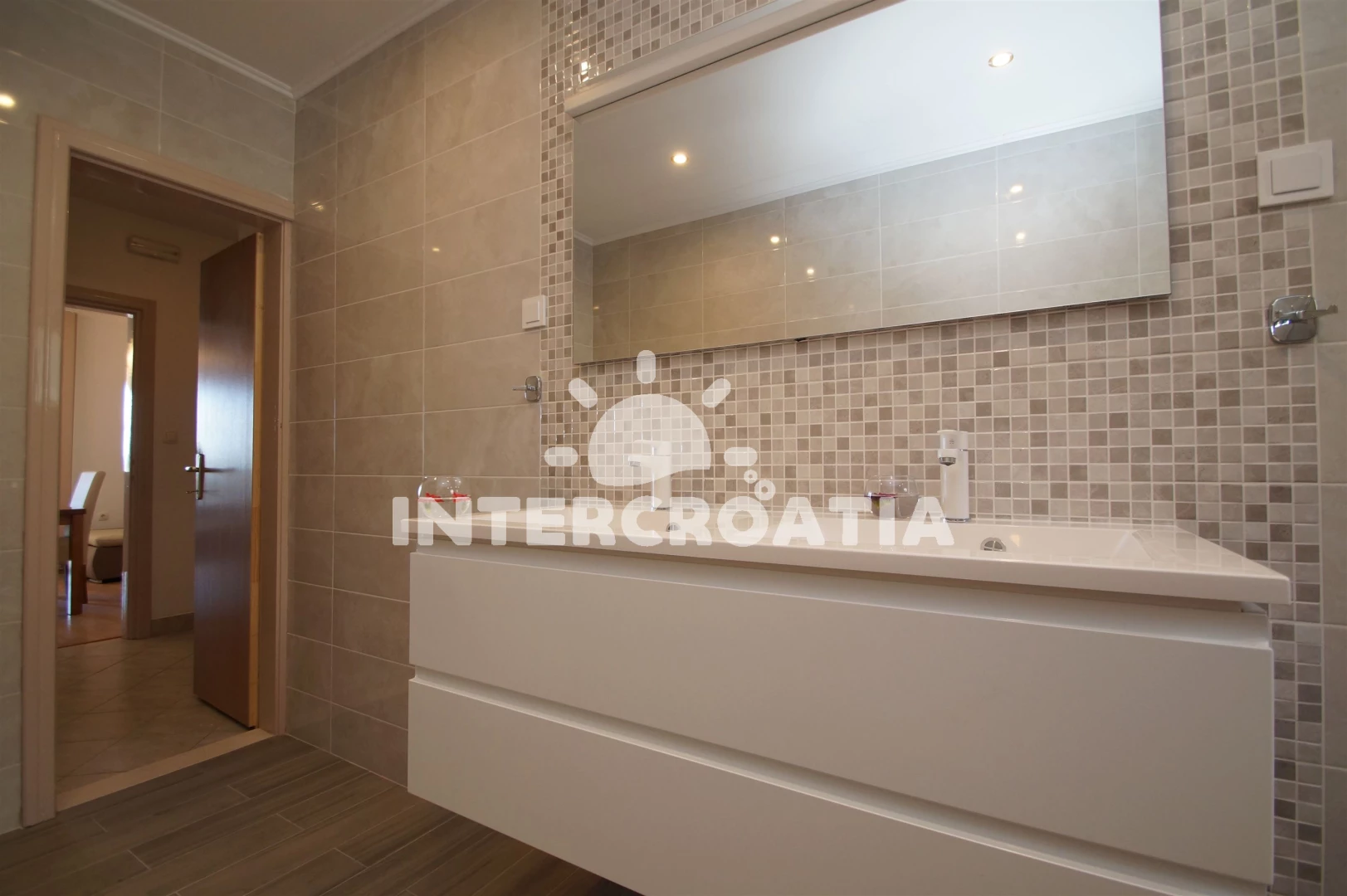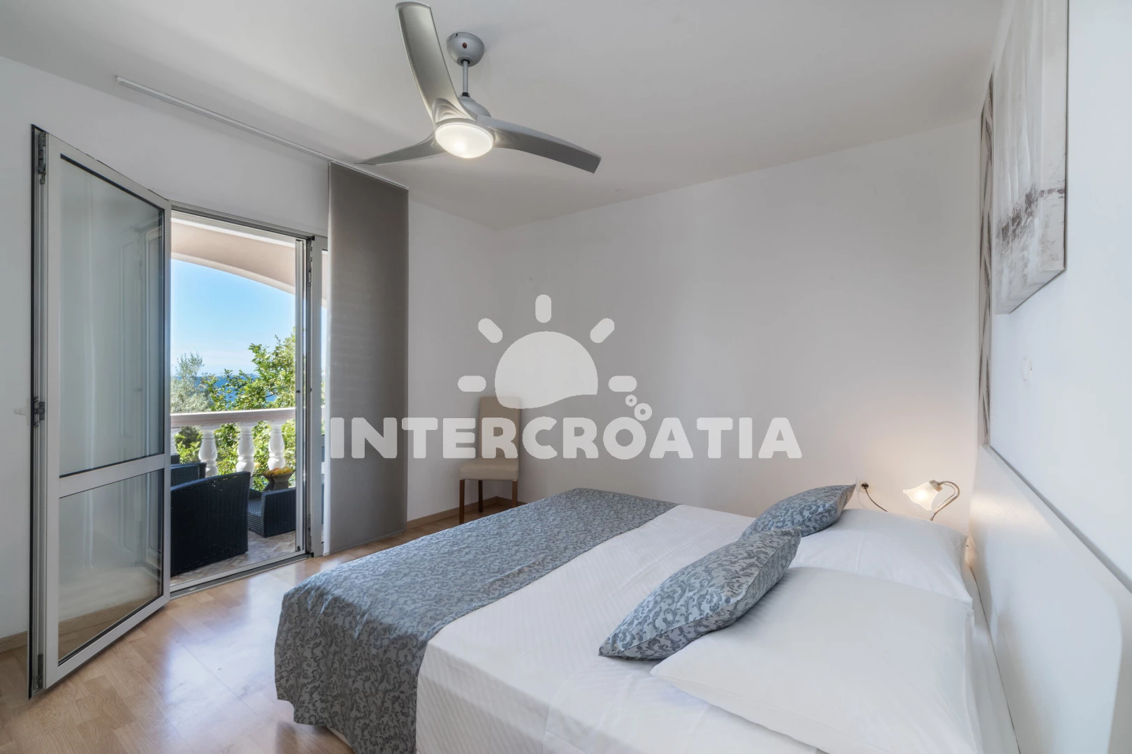 Apartmán (75 m2) s balkonem, a výhledem na moře. Nachází se v přízemí objektu. Apartmán má 2 ložnice a je vhodný pro až 5 osob. Kuchyňská linka je vybavena varnou deskou, toustovačem, kávovarem, troubou, myčkou na nádobí, mikrovlnnou troubou, rychlovarnou konvicí, nádobím, lednicí, mrazákem. V obývací místnosti je rozložitelná pohovka (extra lůžko pro 1 osobu). K dispozici televize se satelitním programem, radio, žehlička. První ložnice s dvoulůžkem. Druhá ložnice se 2 jednolůžky. První koupelna se sprchovým koutem, umyvadlem, fénem a WC. Druhá koupelna se sprchovým koutem, umyvadlem, fénem a WC. Hostům je k dispozici parkování u objektu zdarma.