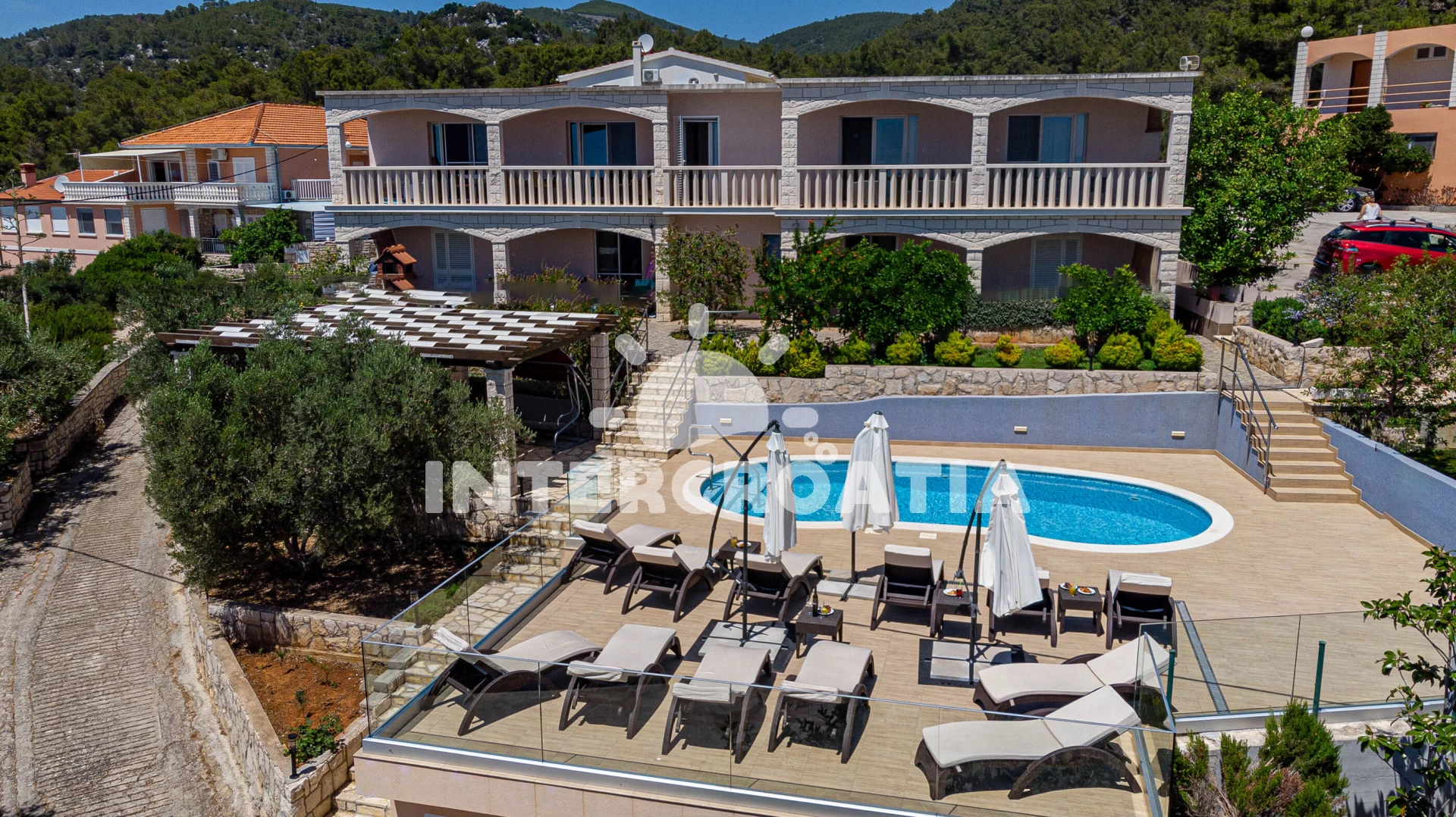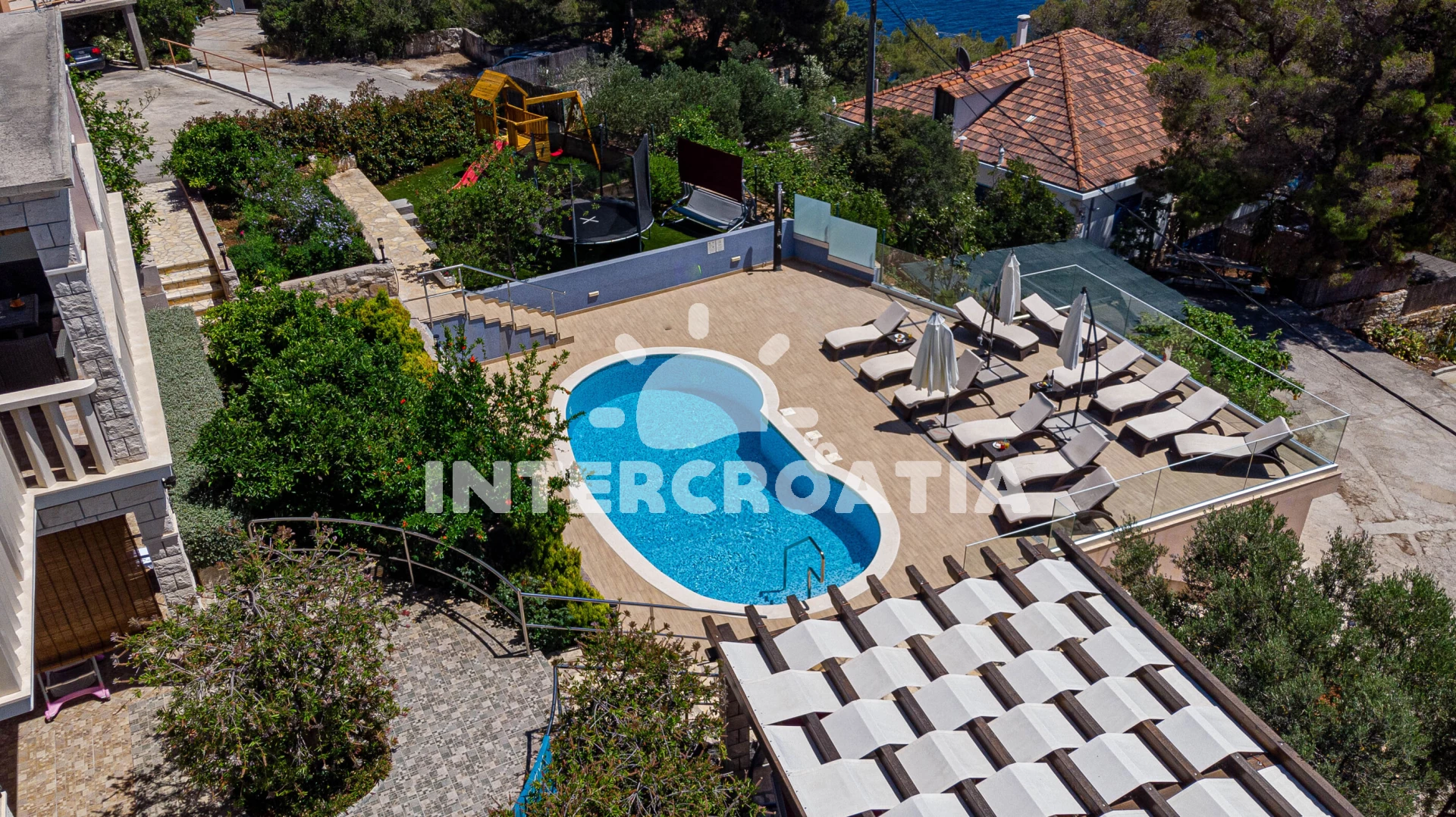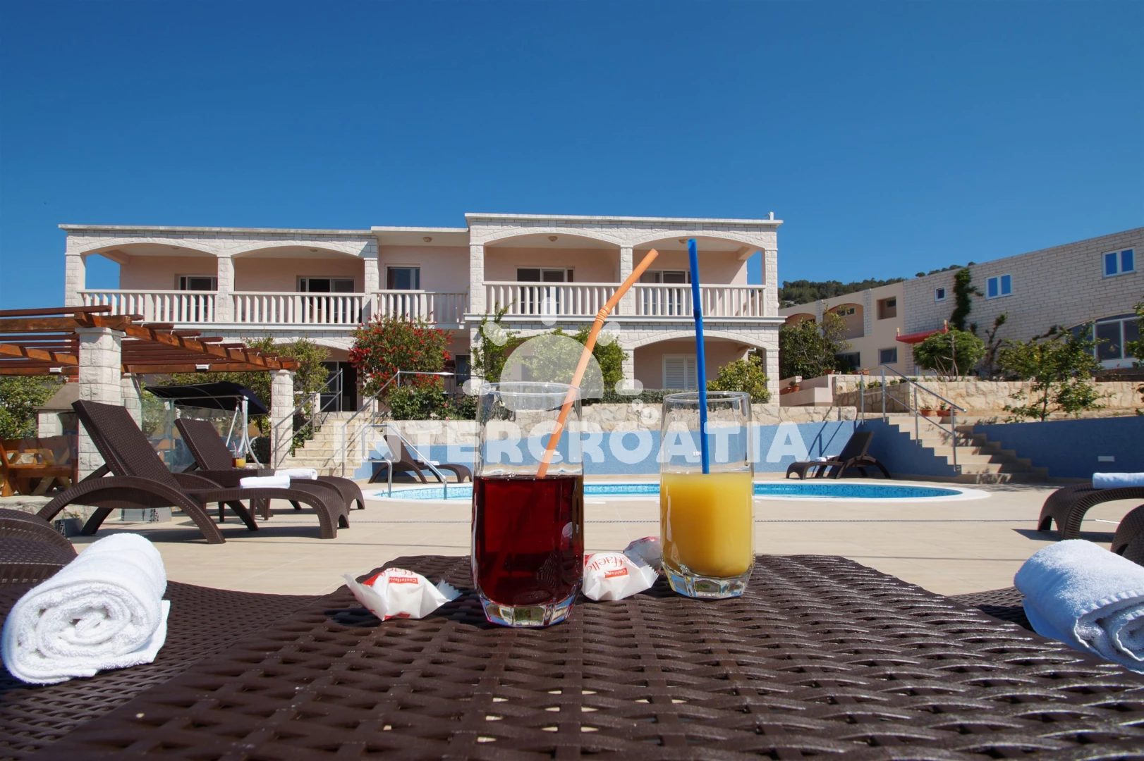Vzdálenosti: Moře 50 m, pláž 50 m (betonové desky), bar 50 m, půjčovna motorových člunů 50 m, restaurace 50 m, veřejná doprava 50 m, potápění 50 m, centrum 1,8 km, supermarket 1,8 km, diskotéka 2 km, směnárna 2 km, pošta 2 km, tenisové kurty 5 km, ambulance 7 km, lékárna 7 km, banka 7 km, čerpací stanice 10 km, marina 45 km, trajekt (Vela Luka) 45 km,