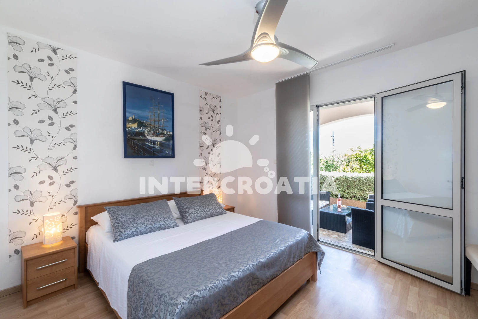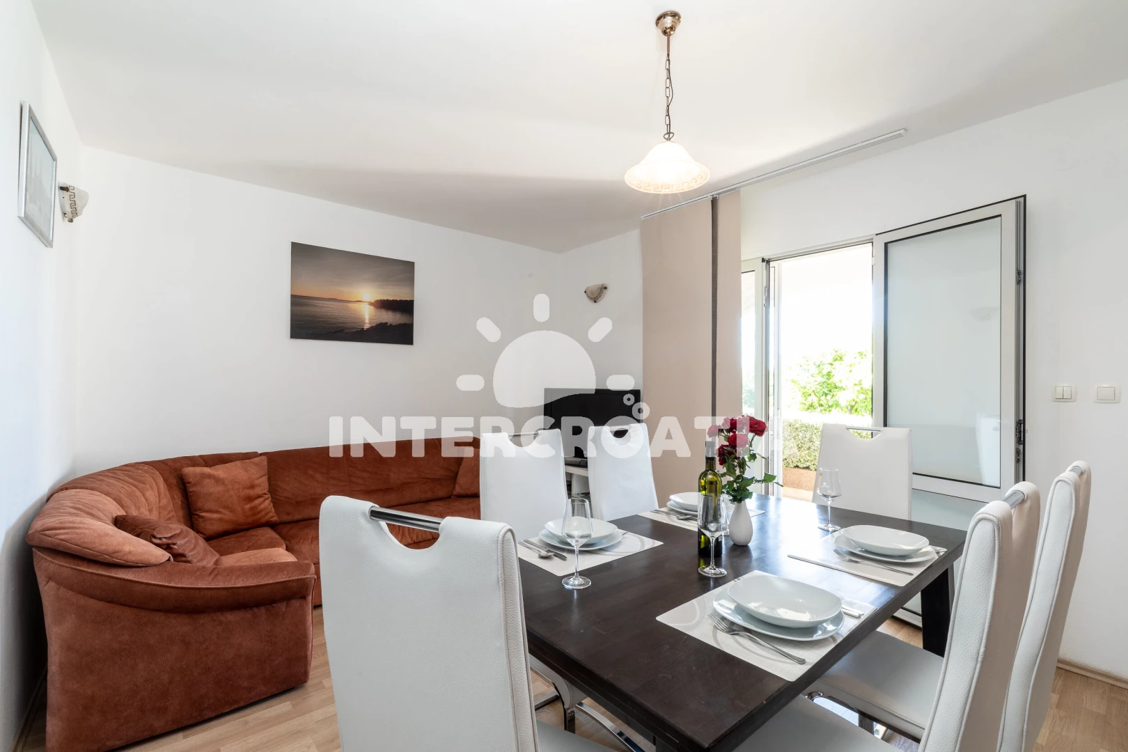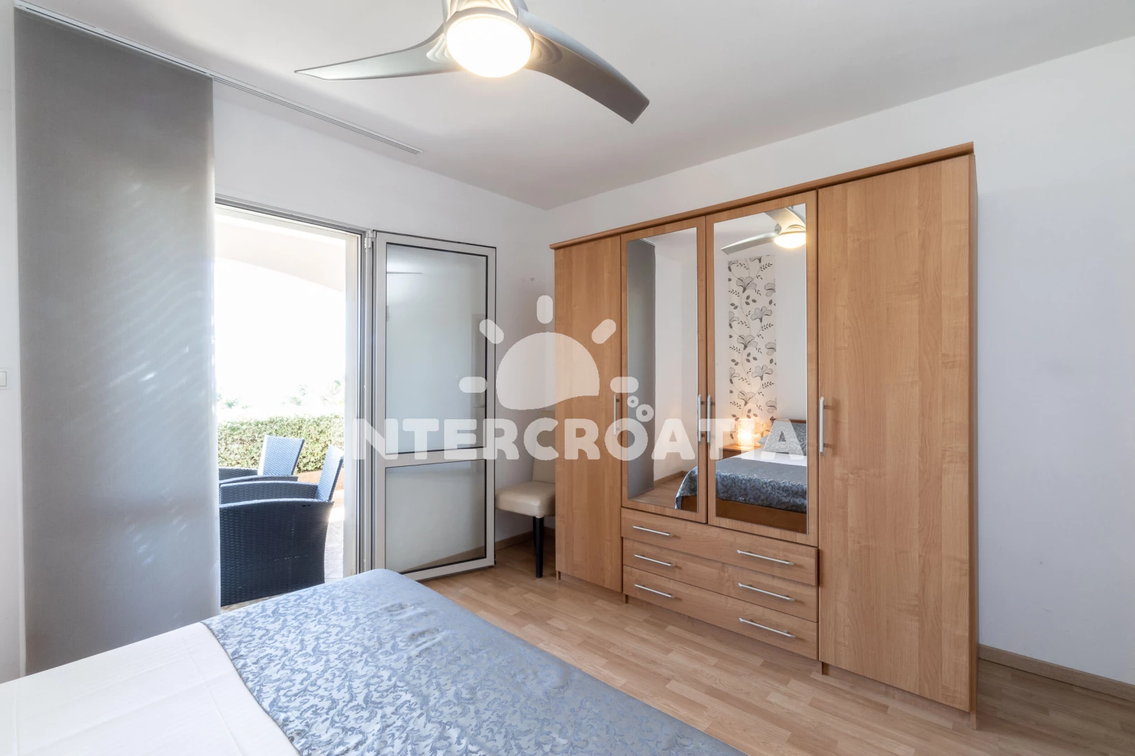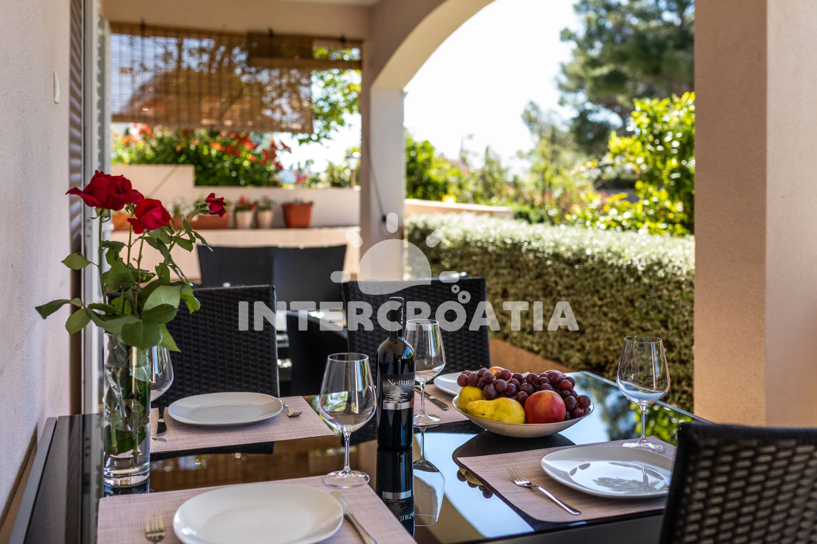 Apartmán (75 m2) s balkonem, a výhledem na moře. Nachází se v přízemí objektu. Apartmán má 2 ložnice a je vhodný pro až 5 osob. Kuchyňská linka je vybavena varnou deskou, troubou, toustovačem, kávovarem, myčkou na nádobí, mikrovlnnou troubou, rychlovarnou konvicí, nádobím, lednicí, mrazákem. V obývací místnosti je rozložitelná pohovka (extra lůžko pro 1 osobu). K dispozici televize se satelitním programem, žehlička. První ložnice s dvoulůžkem. Druhá ložnice se 2 jednolůžky. První koupelna se sprchovým koutem, umyvadlem, fénem a WC. Druhá koupelna se sprchovým koutem, umyvadlem, fénem a WC. Hostům je k dispozici parkování u objektu zdarma.