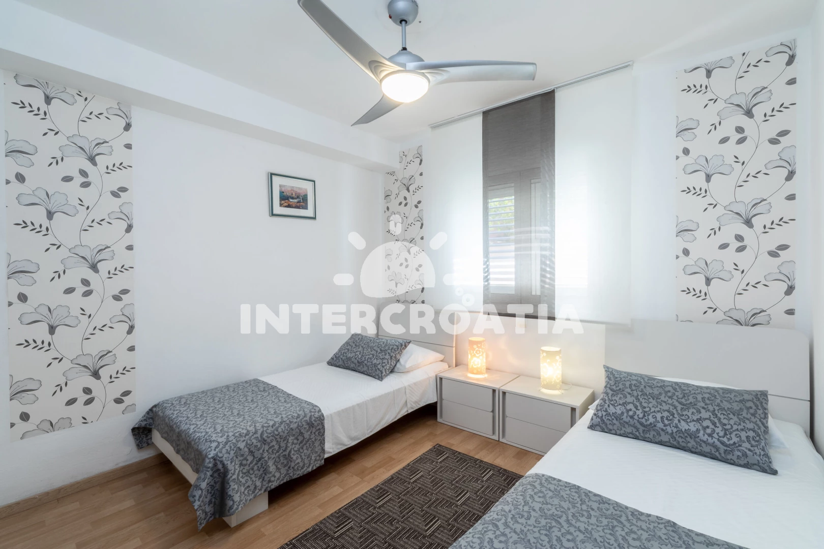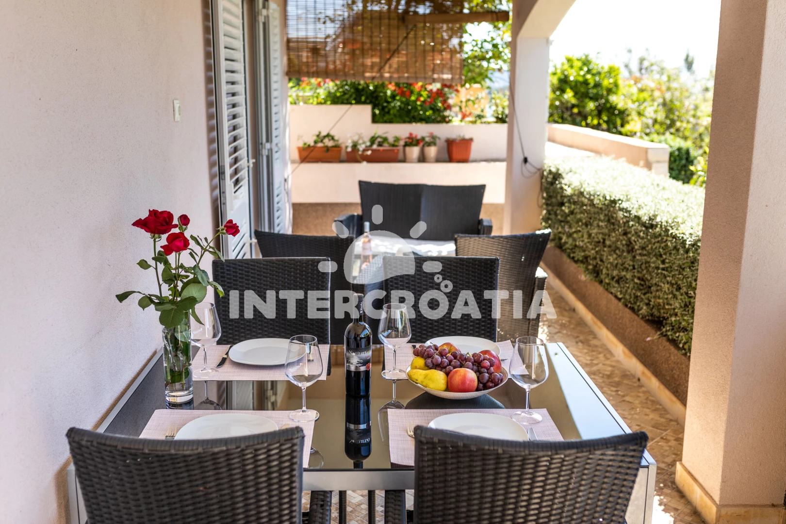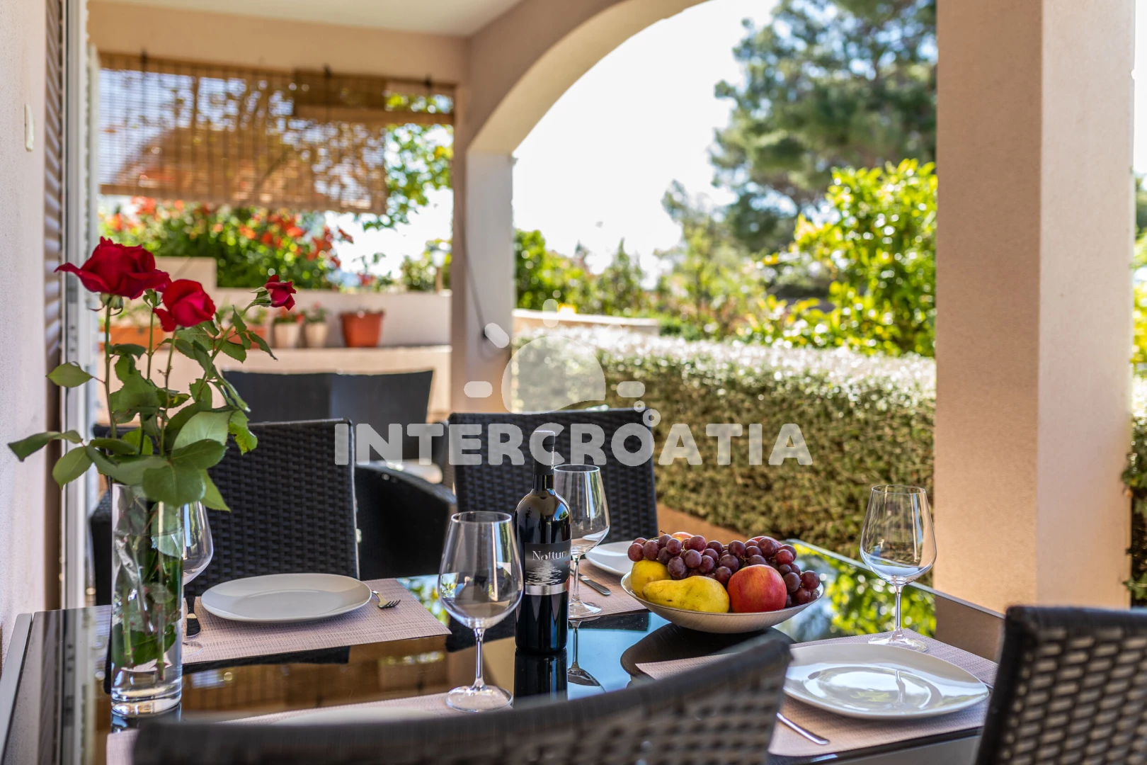 Apartmán (75 m2) s balkonem, a výhledem na moře. Nachází se v přízemí objektu. Apartmán má 2 ložnice a je vhodný pro až 5 osob. Kuchyňská linka je vybavena varnou deskou, troubou, toustovačem, kávovarem, myčkou na nádobí, mikrovlnnou troubou, rychlovarnou konvicí, nádobím, lednicí, mrazákem. V obývací místnosti je rozložitelná pohovka (extra lůžko pro 1 osobu). K dispozici televize se satelitním programem, žehlička. První ložnice s dvoulůžkem. Druhá ložnice se 2 jednolůžky. První koupelna se sprchovým koutem, umyvadlem, fénem a WC. Druhá koupelna se sprchovým koutem, umyvadlem, fénem a WC. Hostům je k dispozici parkování u objektu zdarma.