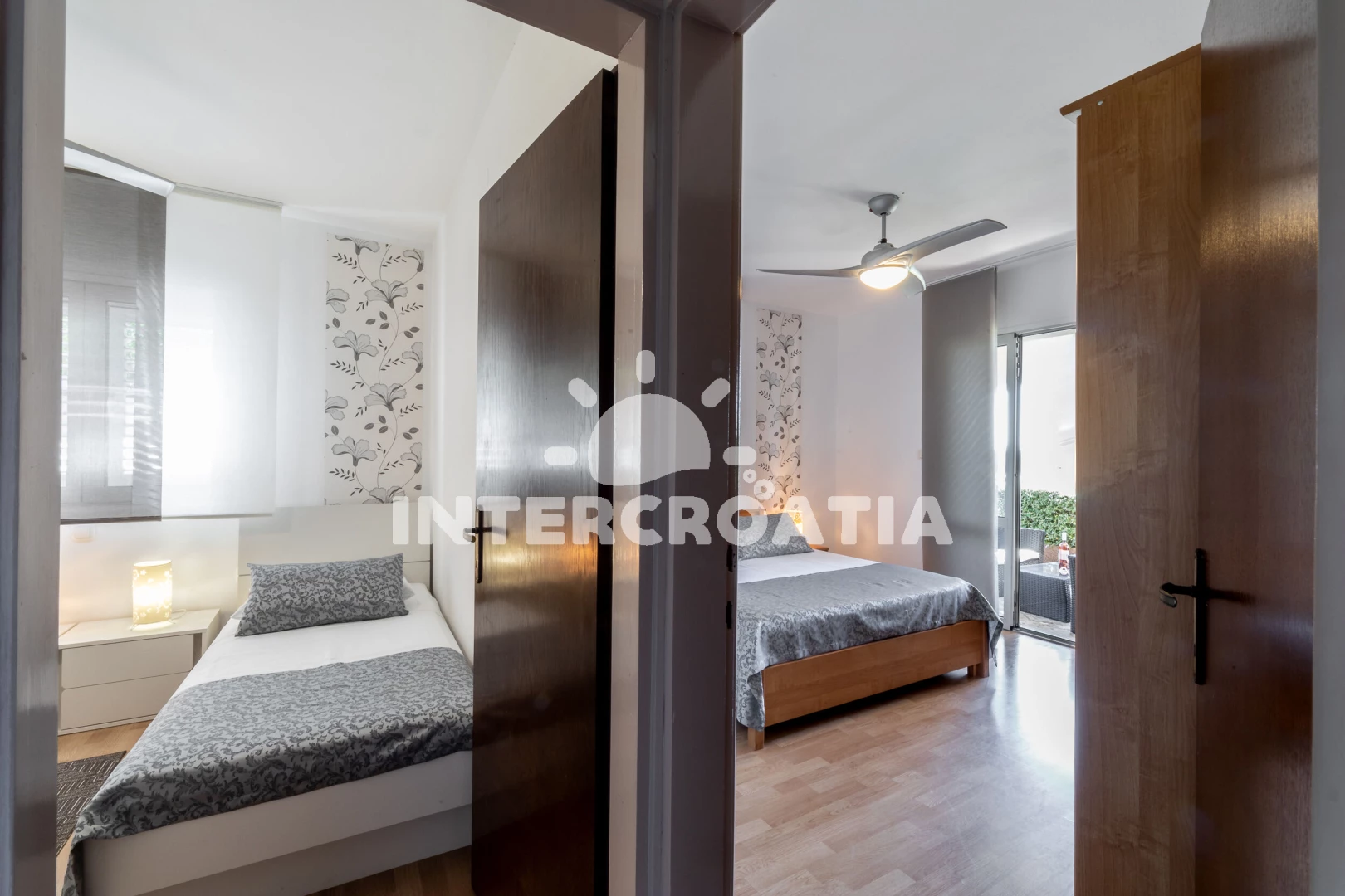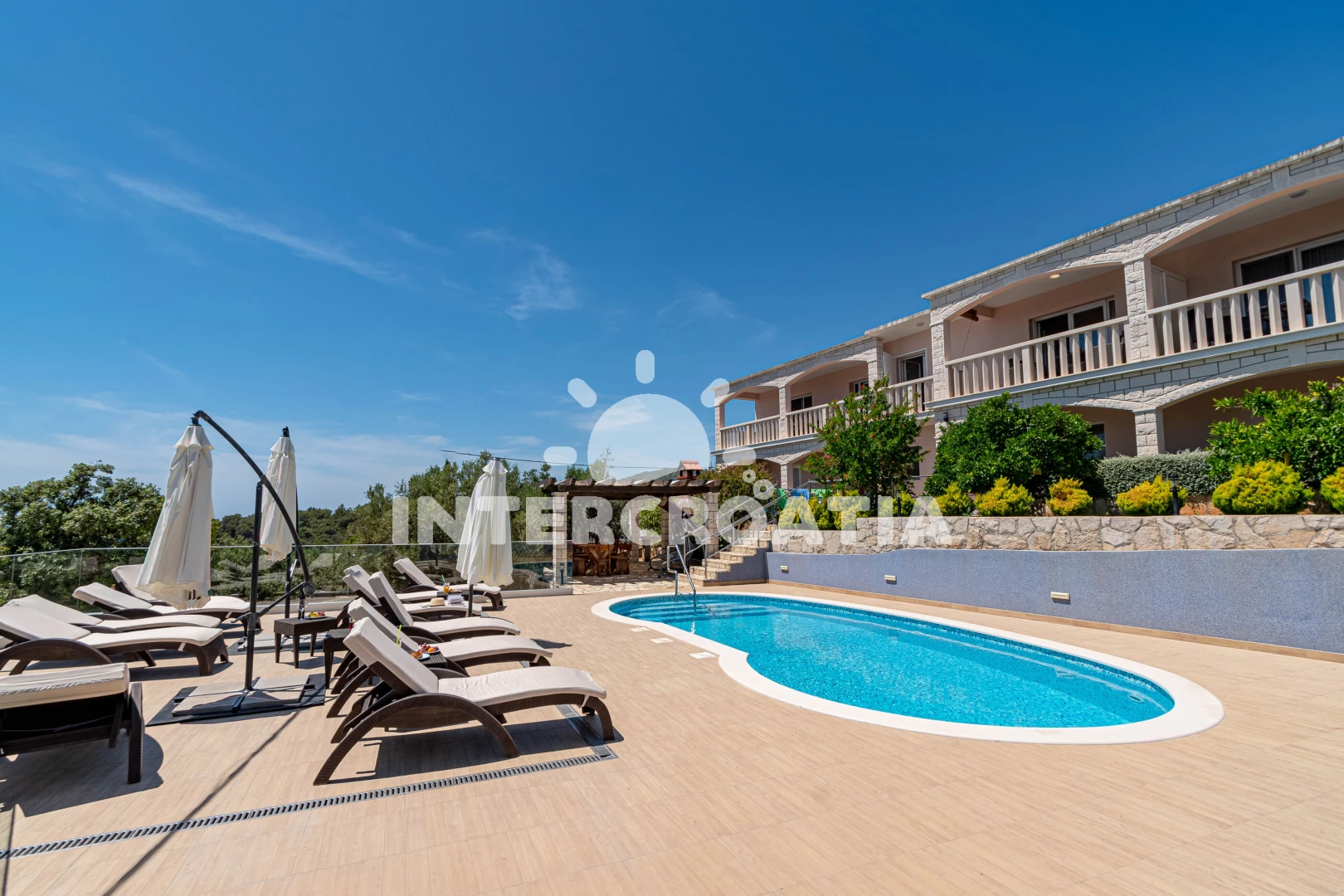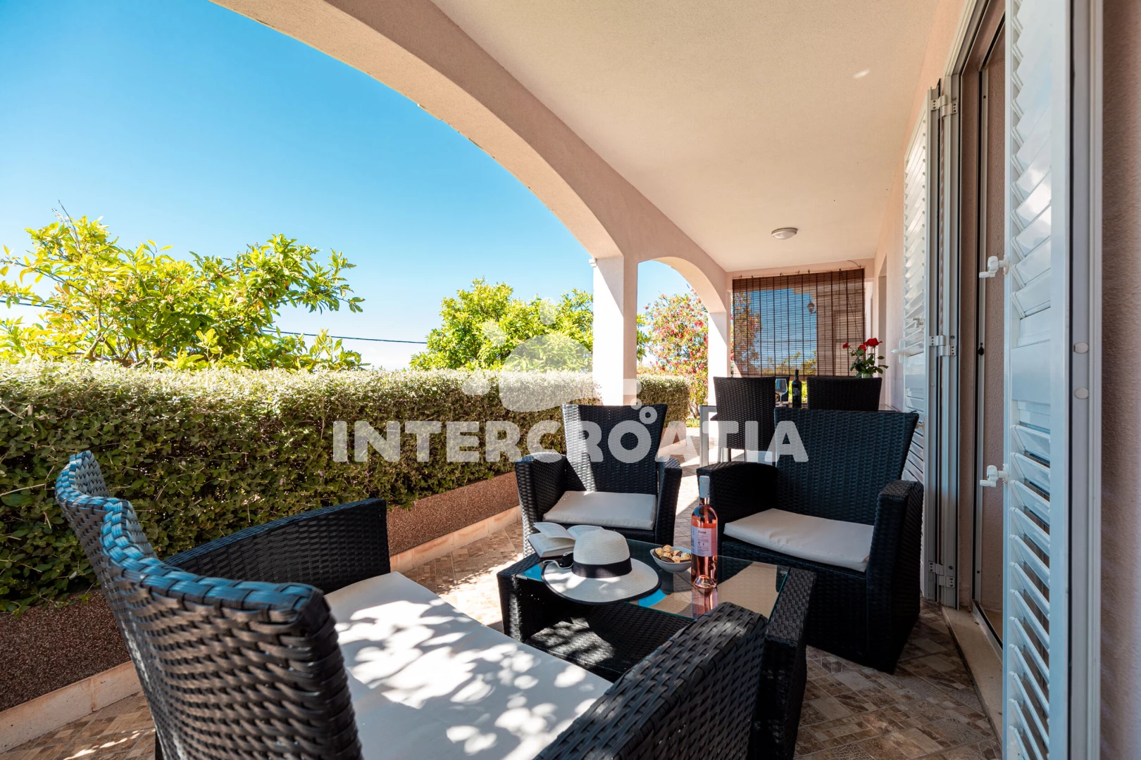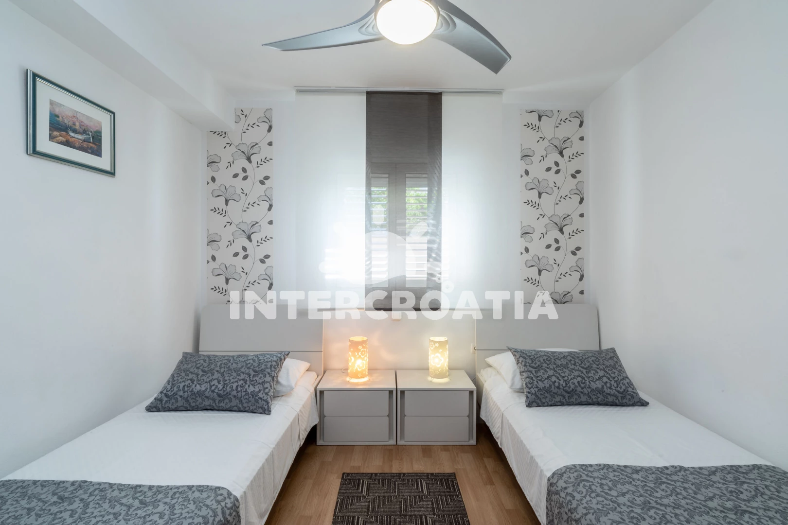 Apartmán (75 m2) s balkonem, a výhledem na moře. Nachází se v přízemí objektu. Apartmán má 2 ložnice a je vhodný pro až 5 osob. Kuchyňská linka je vybavena varnou deskou, troubou, toustovačem, kávovarem, myčkou na nádobí, mikrovlnnou troubou, rychlovarnou konvicí, nádobím, lednicí, mrazákem. V obývací místnosti je rozložitelná pohovka (extra lůžko pro 1 osobu). K dispozici televize se satelitním programem, žehlička. První ložnice s dvoulůžkem. Druhá ložnice se 2 jednolůžky. První koupelna se sprchovým koutem, umyvadlem, fénem a WC. Druhá koupelna se sprchovým koutem, umyvadlem, fénem a WC. Hostům je k dispozici parkování u objektu zdarma.