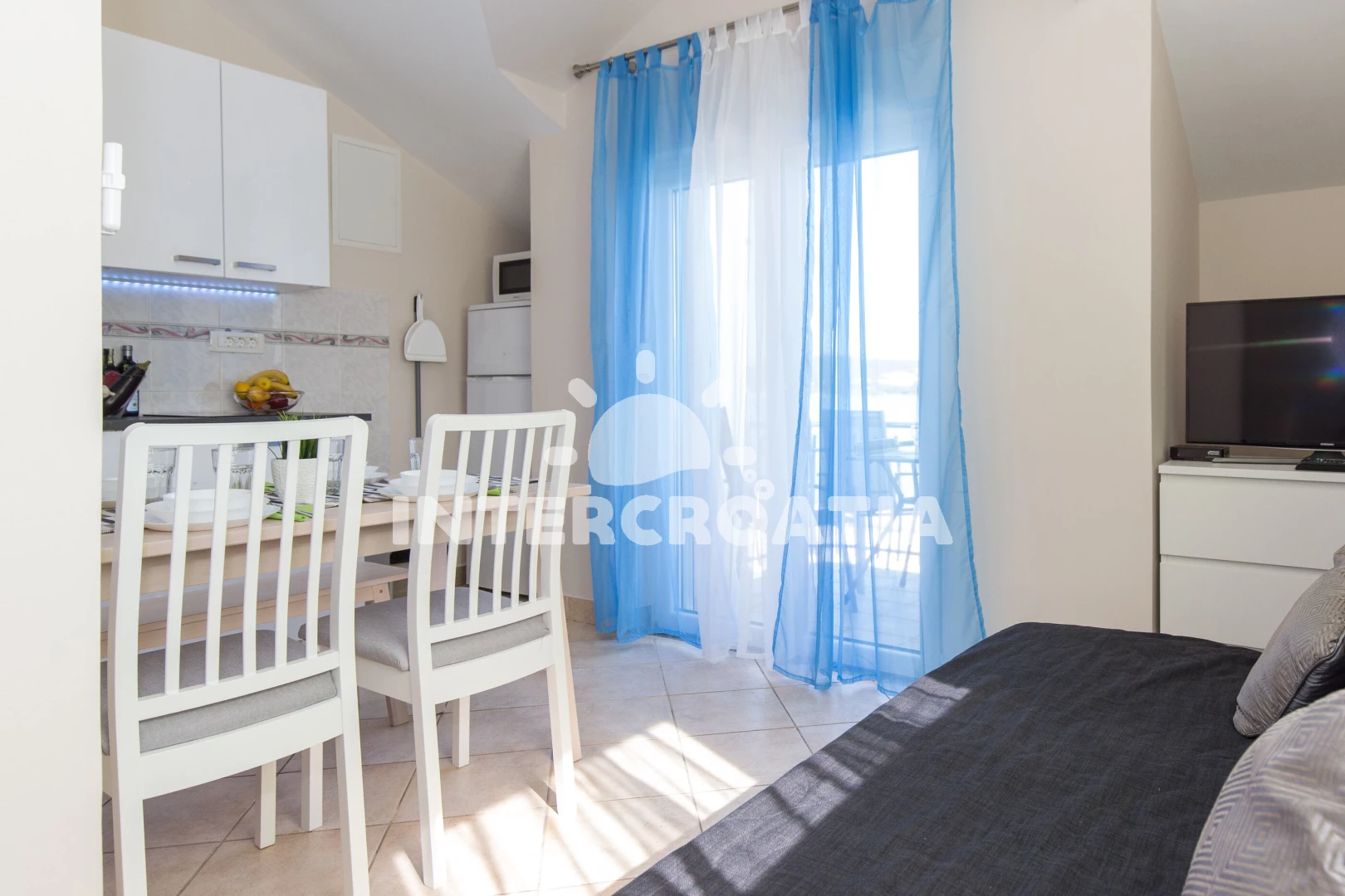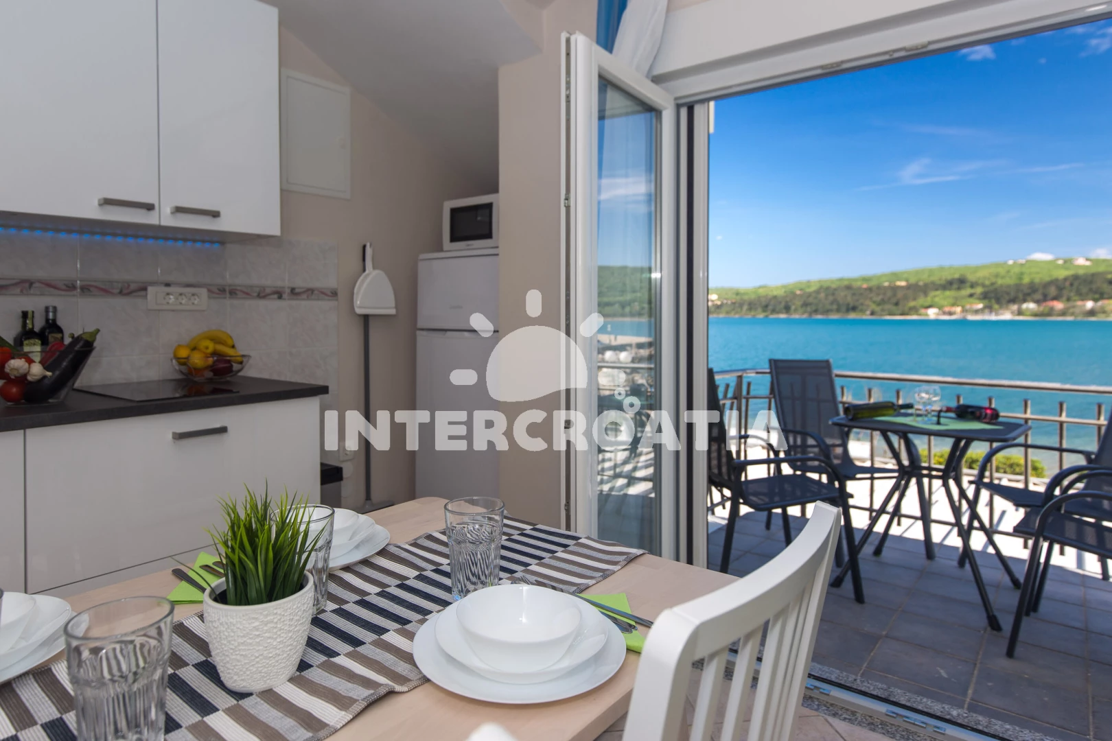Vzdálenosti: Moře 10 m, pláž 10 m (oblázky), centrum 10 m, restaurace 50 m, bar 50 m, supermarket 500 m, půjčovna motorových člunů 2 km, směnárna 5 km, letiště (Rijeka) 7 km, pošta 8 km, čerpací stanice 8 km, ambulance 8 km, muzeum 8 km, půjčovna kol 8 km, lékárna 8 km, banka 8 km, diskotéka 8 km, trajekt (Valbiska (Krk)) 17 km,
