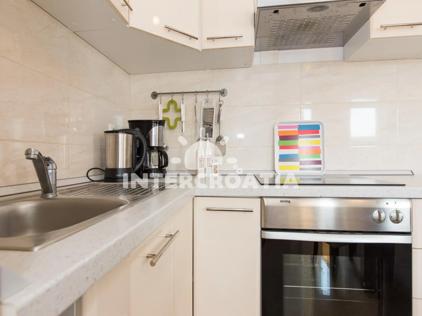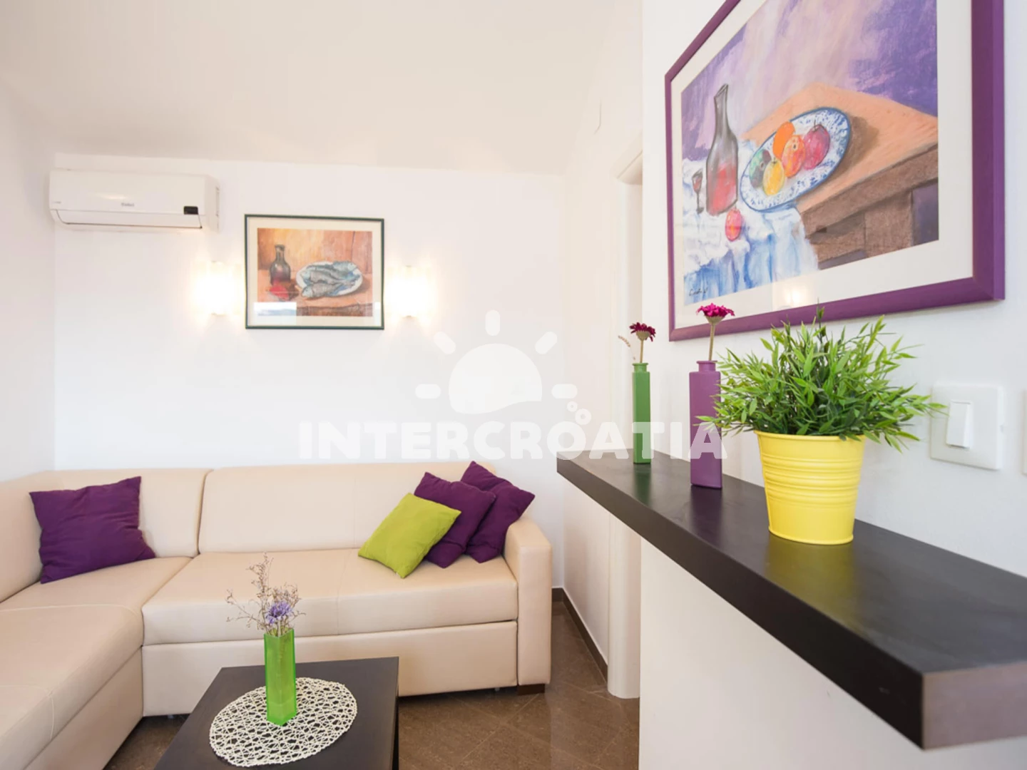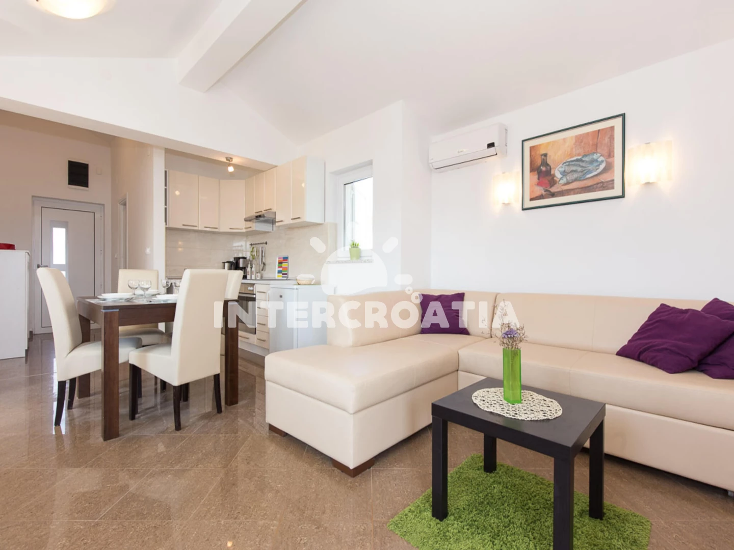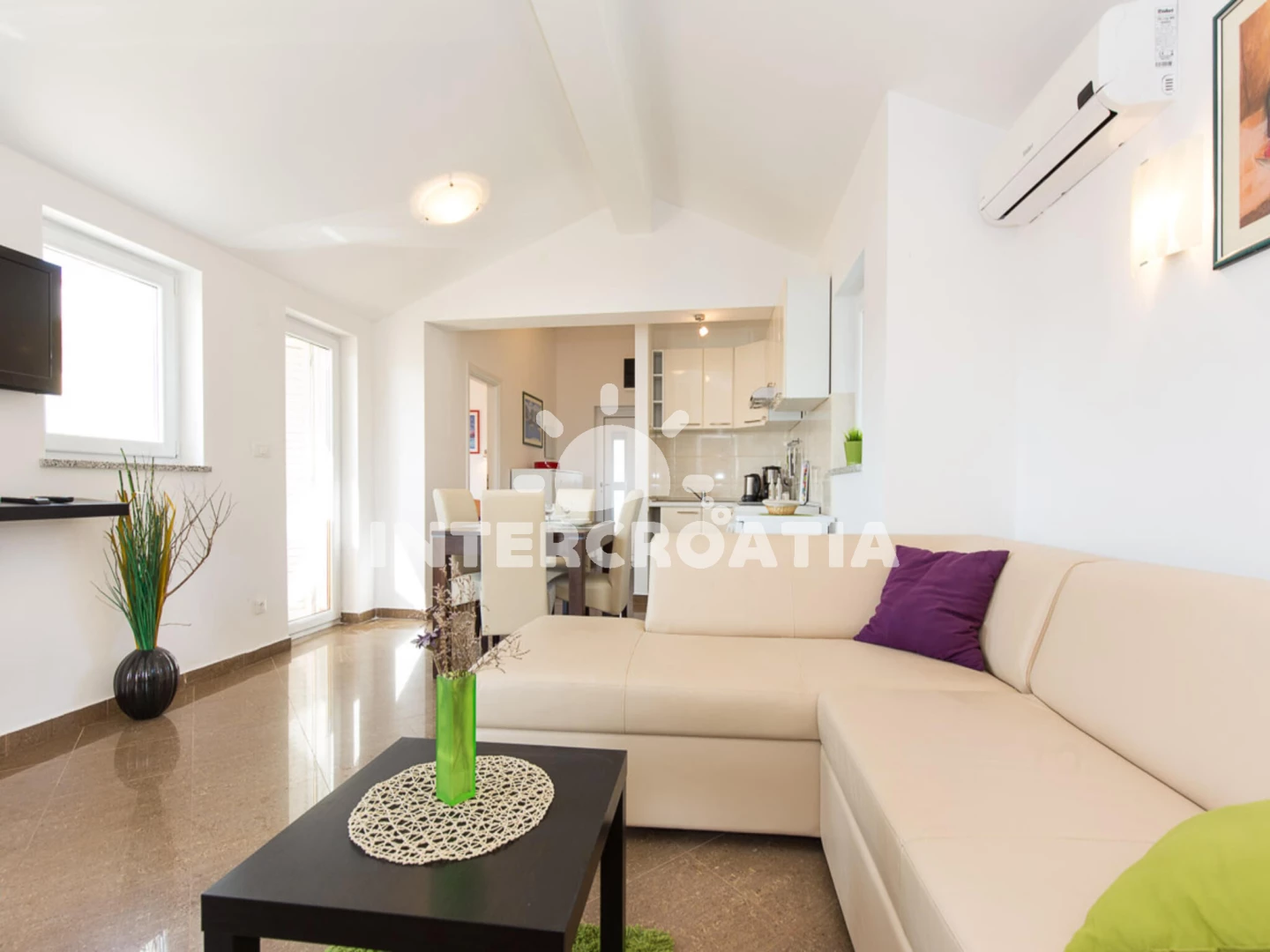 Vzdálenosti: Moře 50 m, pláž 50 m (oblázková a betonové desky), bar 50 m, restaurace 50 m, supermarket 50 m, centrum 100 m, letiště 7 km, diskotéka 10 km, trajekt (Valbiska (Krk)) 14 km,