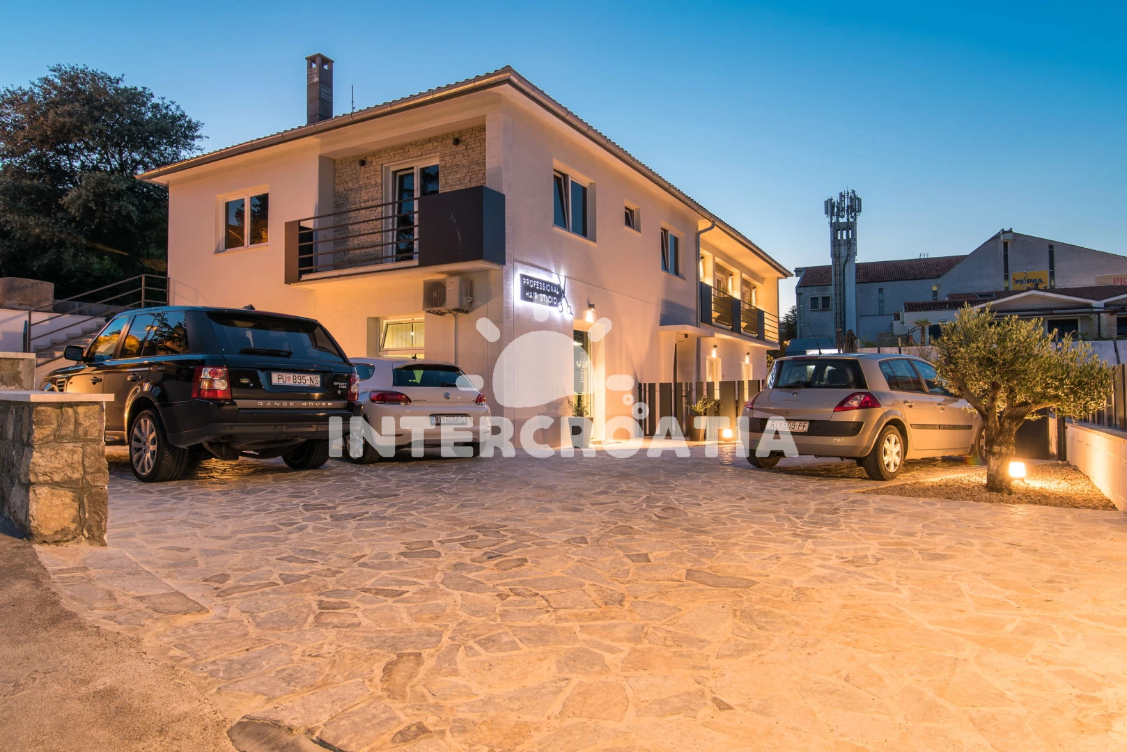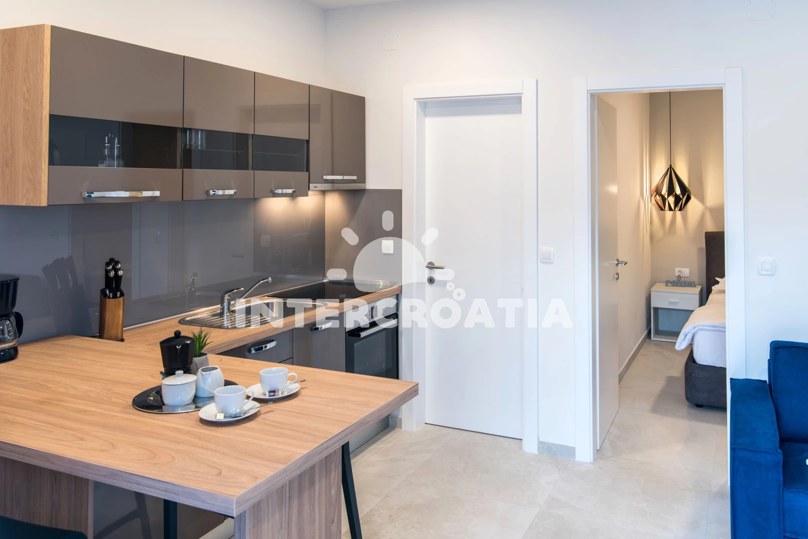 Apartmán se nachází 350 m od moře a pláže. Pláž je oblázková a betonové desky. Apartmán disponuje bazénem s lehátky pro ubytované hosty. Parkování je před domem.