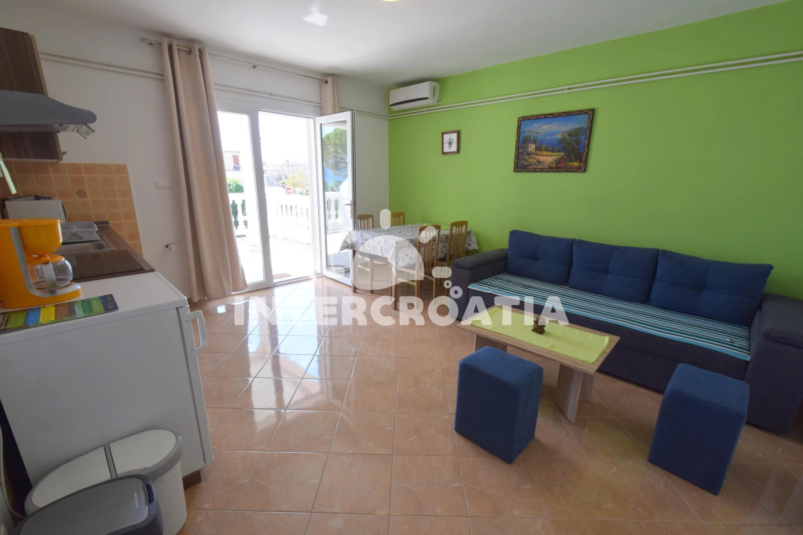 Apartmán se nachází 400 m od moře a pláže. Pláž je oblázková a betonové desky. U objektu je k dispozici společná zahrada s posezením a grilem. Parkování je před domem.