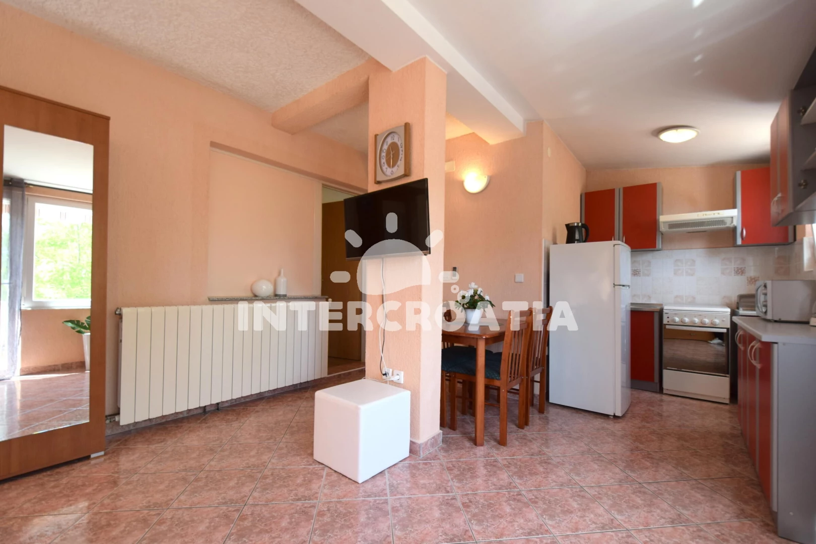 Vzdálenosti: Moře 400 m, pláž 600 m (oblázky), ambulance 200 m, veřejná doprava 250 m, pošta 300 m, centrum 300 m, směnárna 300 m, supermarket 300 m, banka 300 m, muzeum 350 m, lékárna 350 m, restaurace 350 m, bar 350 m, diskotéka 400 m, půjčovna motorových člunů 550 m, trajekt (Valbiska (Krk)) 6 km, letiště (Rijeka) 21 km,