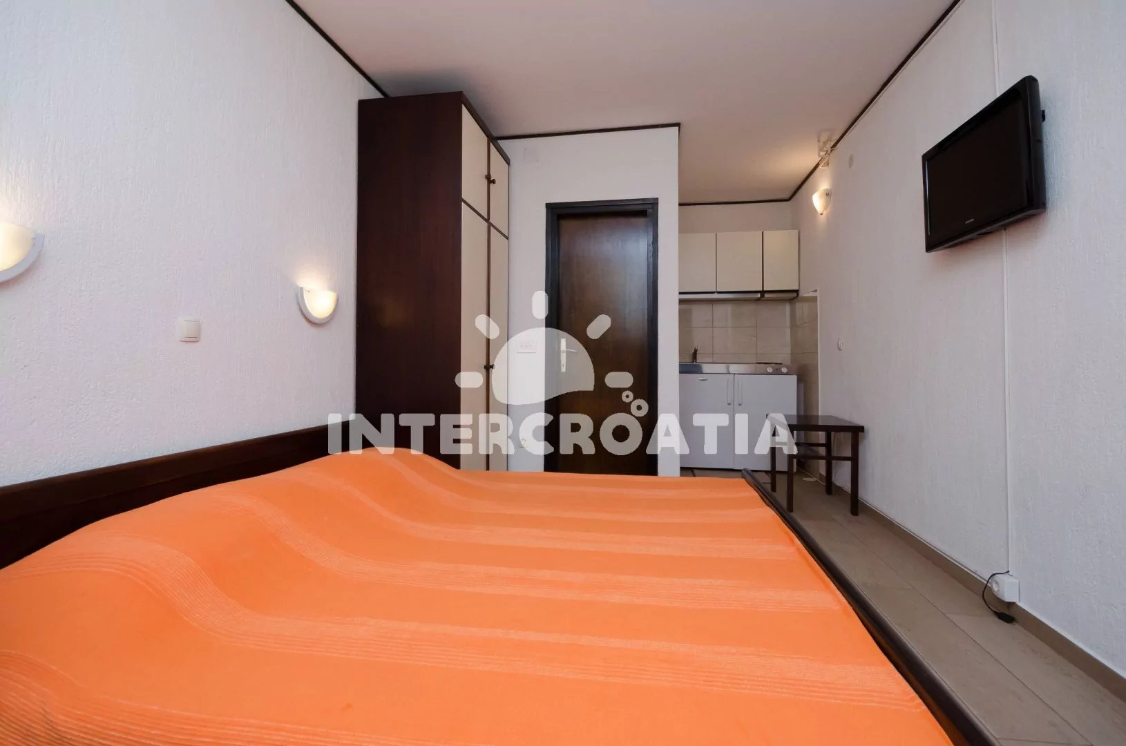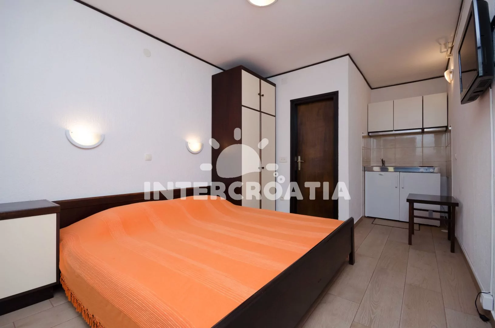 Apartmán typu studio s terasou a venkovním posezením se nachází ve sníženém přízemí vilky a je vhodný pro 2 osoby. Obývací místnost je spojena s kuchyní. Kuchyňská linka je vybavena elektrickým dvouplotýnkovým sporákem, nádobím a lednicí s mrazákem. Obývací místnost s jedním dvoulůžkem, televizí se satelitním programem, klimatizací a vstupem do koupelny. Koupelna se sprchovým koutem, umyvadlem a wc. Hostům je k dispozici parkování u objektu zdarma.