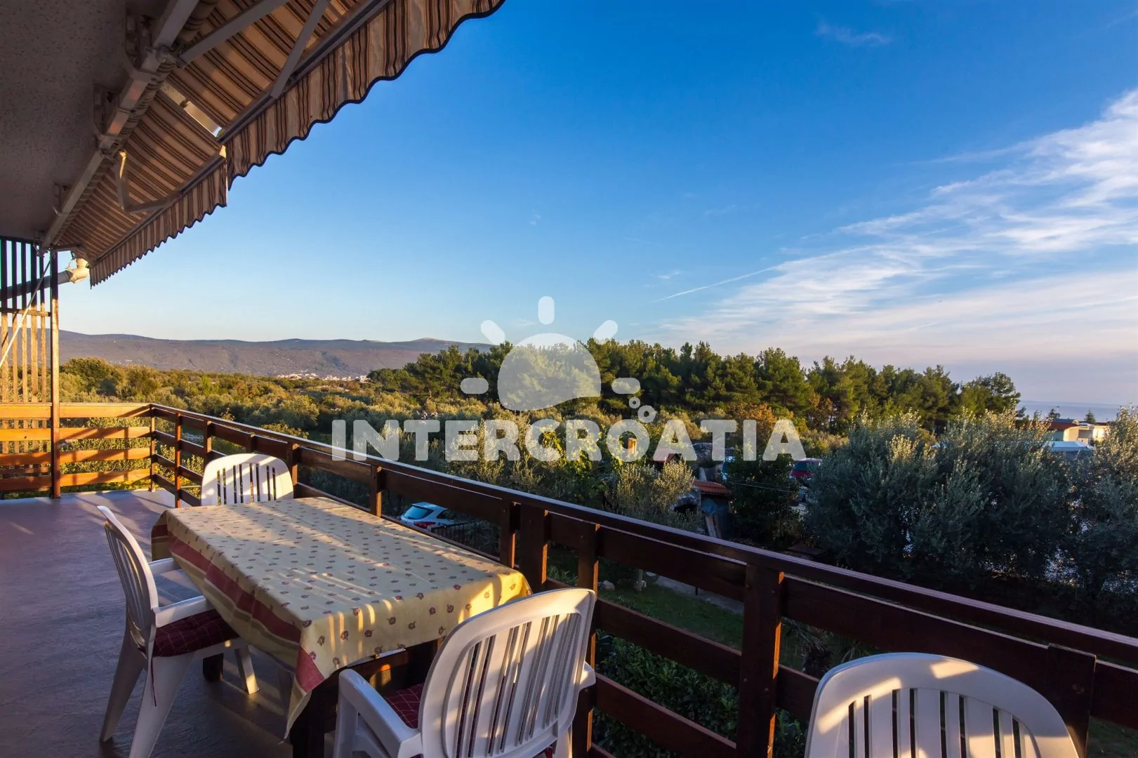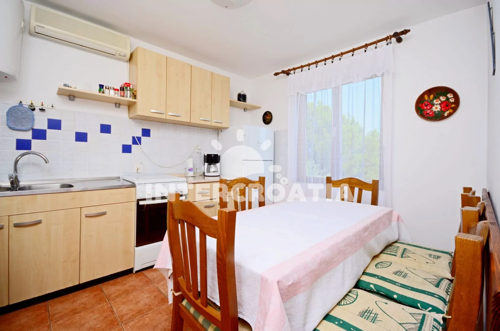 Apartmán s výhledem na moře a balkonem, nachází se v prvním patře a je vhodný pro až 6 osob. Kuchyň je vybavena jídelním stolem pro 6 osob, klimatizací, kuchyňskou linkou se sporákem, troubou, myčkou…