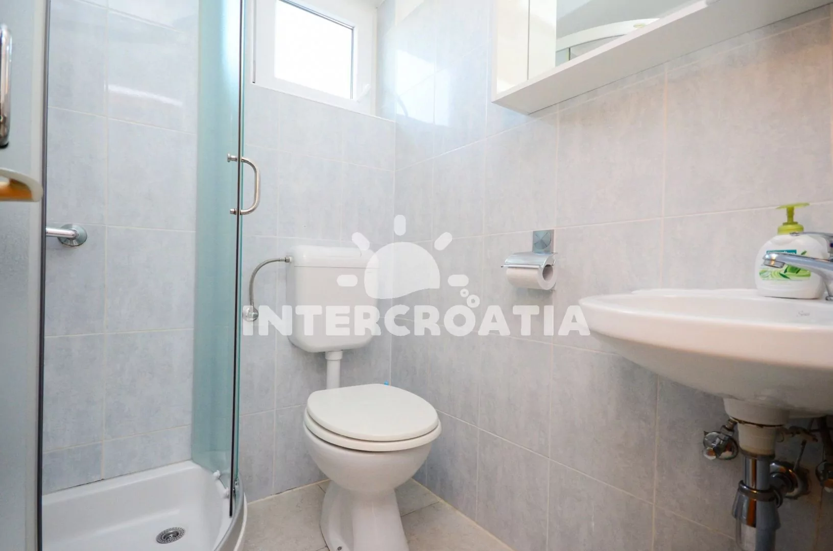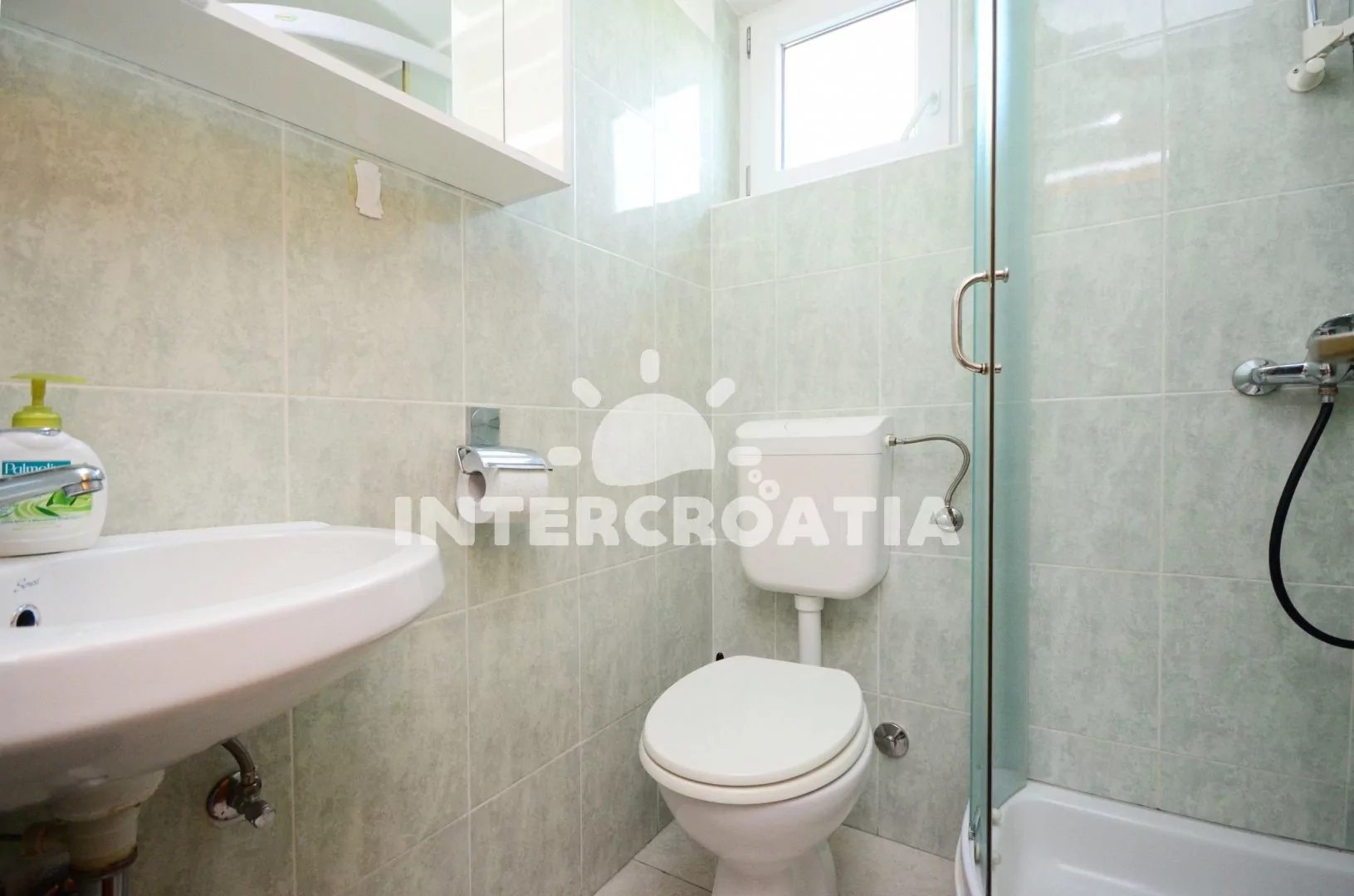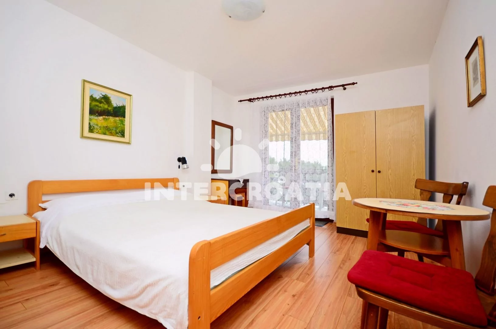 Apartmán s výhledem na moře a balkonem, nachází se v prvním patře a je vhodný pro až 6 osob. Kuchyň je vybavena jídelním stolem pro 6 osob, klimatizací, kuchyňskou linkou se sporákem, troubou, myčkou na nádobí, rychlovarnou konvicí, toustovačem, nádobím a lednicí s mrazákem. Obývací pokoj s pohovkou, televizí se satelitním programem a klimatizací. První i druhá ložnice je vybavena s jedním dvoulůžkem a vstupem na balkon. Třetí ložnice s dvěma jednolůžky a rovněž vstupem na balkon. Dvě koupelny se sprchovým koutem, umyvadlem a wc. Hosté mají k dispozici parkování u objektu zdarma.