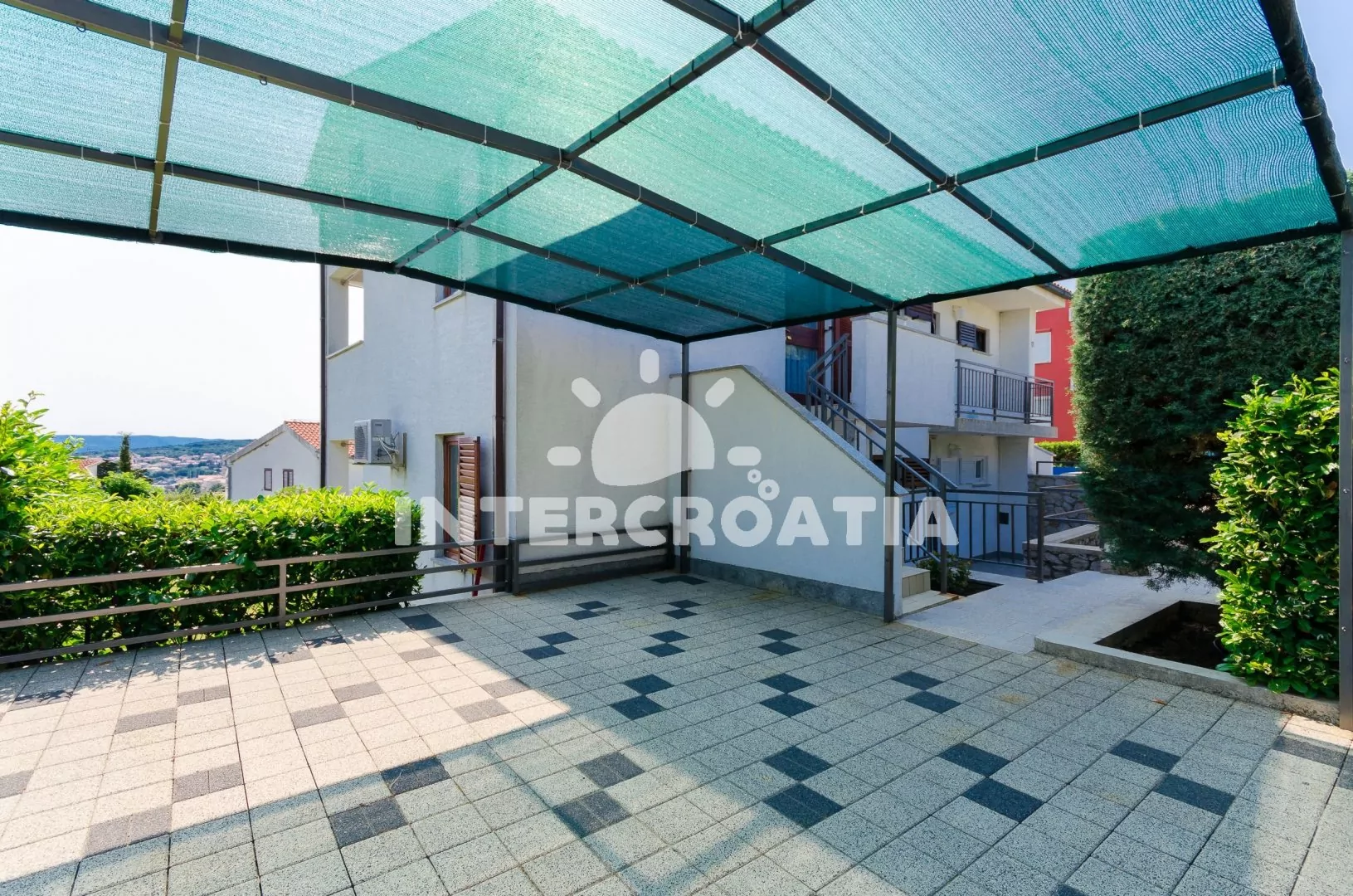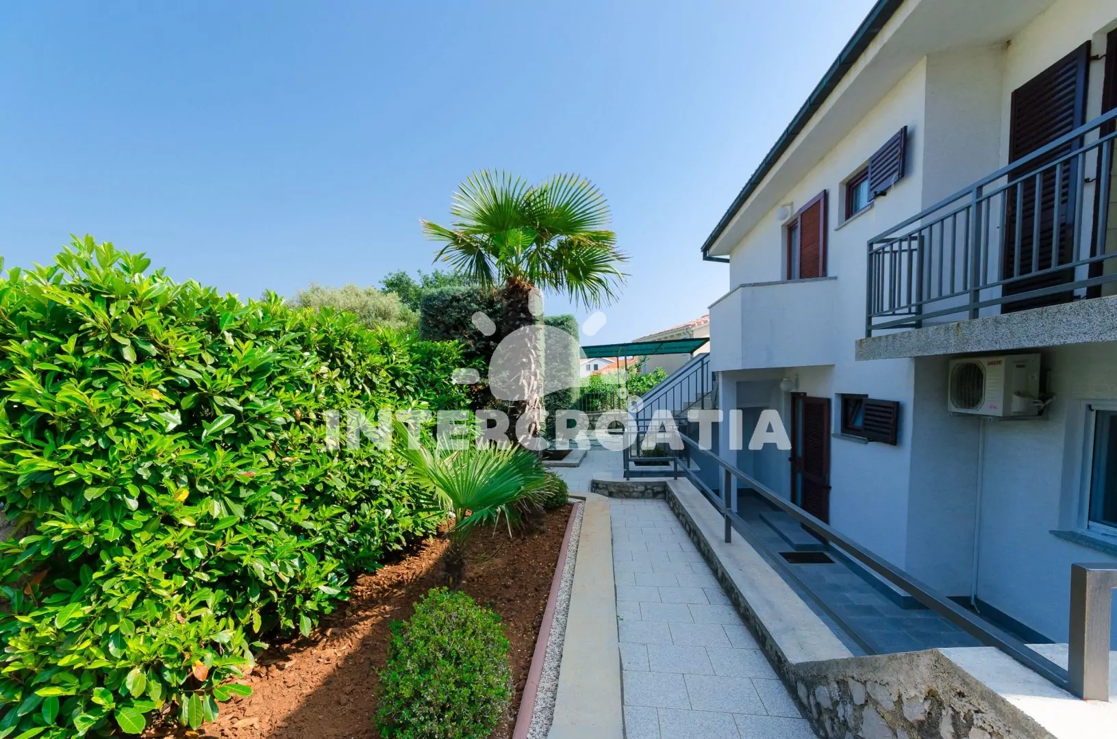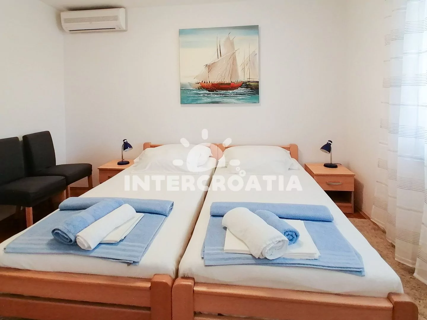 Patrový apartmánový dům vzdušnou čarou 250 m od moře. Apartmány s terasami a venkovním posezením, k dispozici parkovací místa pro automobil.