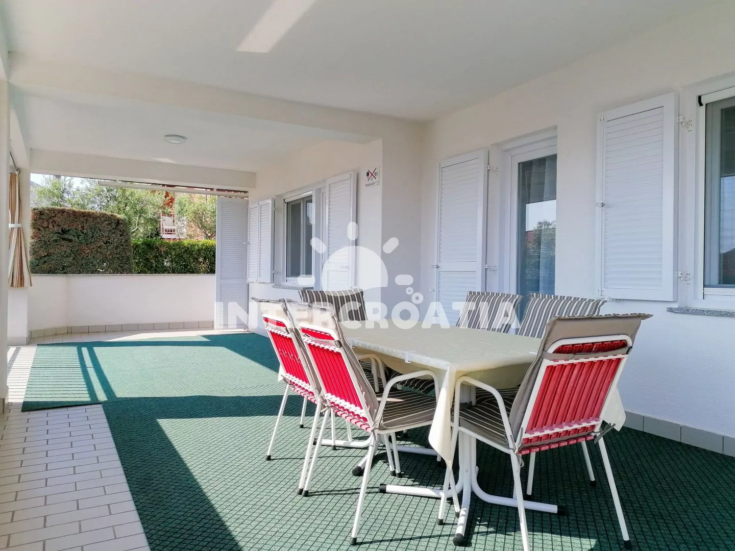 Apartmán s krytou a prostornou terasou je vhodný pro 4 až 5 osob a nachází se v přízemí domu. Samostatný obývací pokoj a kuchyň. Kuchyňská linka se sporákem, digestoří, troubou, myčkou na nádobí, kávovarem, mikrovlnnou troubou, nádobím, lednicí s mrazákem a jídelním stolem pro 4 osoby. Obývací pokoj se sedací soupravou, radiem, televizí se satelitním programem a vstupem na terasu. První ložnice je vybavena dvoulůžkem, jedním jednolůžkem a vstupem na terasu. Druhá ložnice je vybavena dvoulůžkem. Koupelna se sprchovým koutem, umyvadlem, fénem, pračkou, bidetem a wc. Hostům je k dispozici parkování u objektu zdarma.