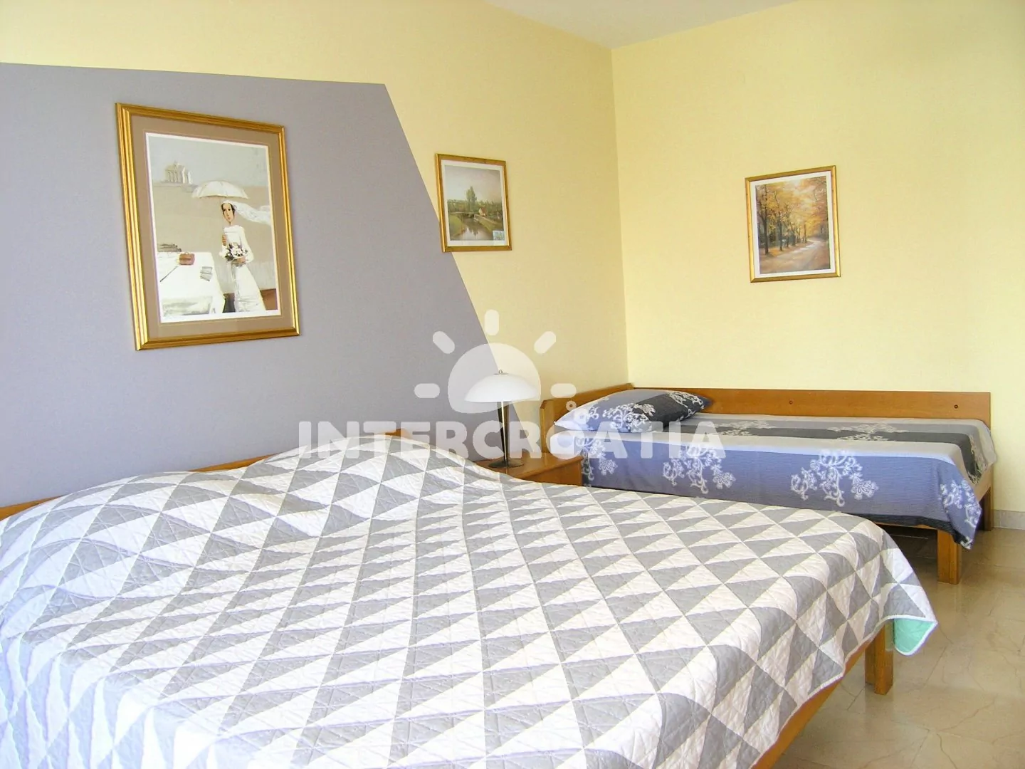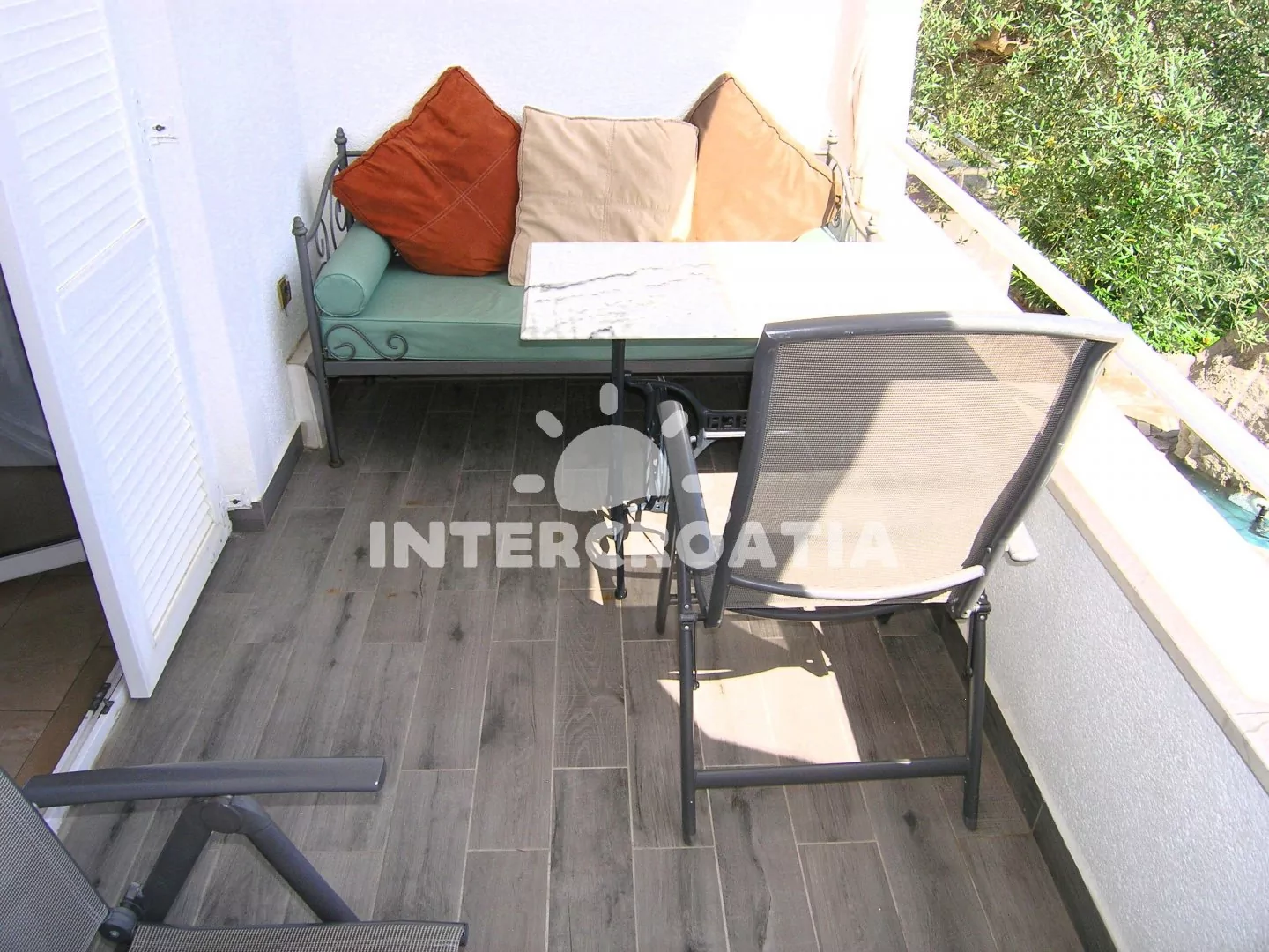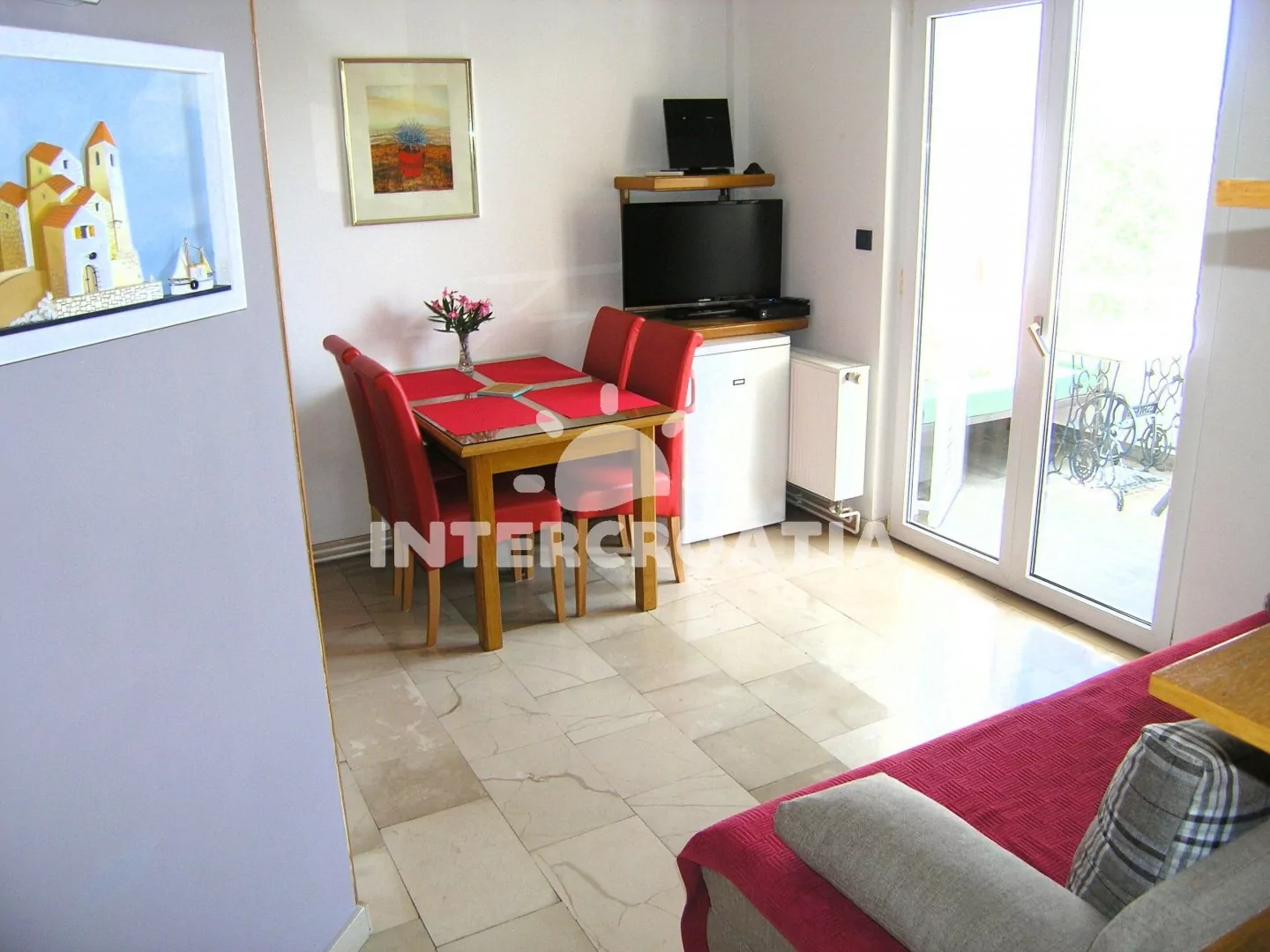 Apartmán s výhledem na moře a balkonem, se nachází v přízemí domu a je vhodný pro 2 až 3 osoby. Obývací pokoj je spojený s kuchyní. Kuchyňská linka je vybavena sporákem, digestoří, mikrovlnnou troubou, kávovarem, nádobím a lednicí s mrazákem. Obývací pokoj s jídelním stolem pro 4 osoby, pohovkou, televizí se satelitním programem, klimatizací a vstupem na balkon. Ložnice je vybavena jedním dvoulůžkem, jedním jednolůžkem a vstupem na balkon. Koupelna se sprchovým koutem, umyvadlem a wc. Hostům je k dispozici parkování u objektu zdarma.
