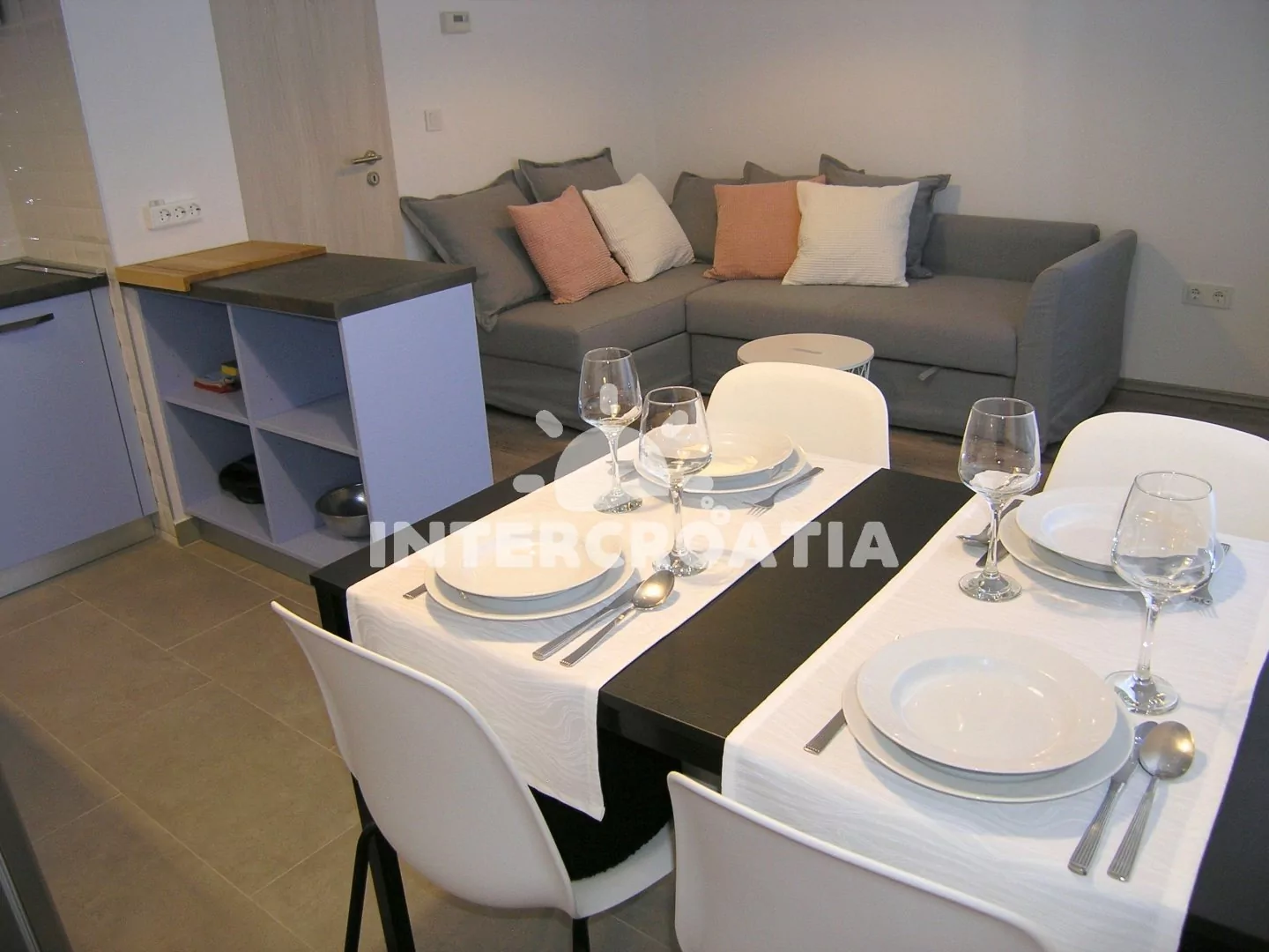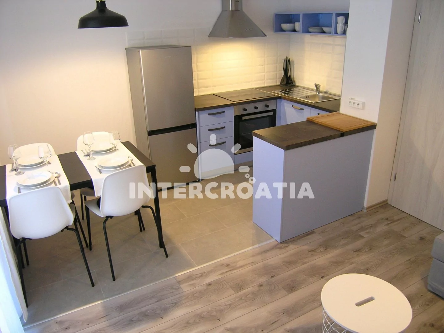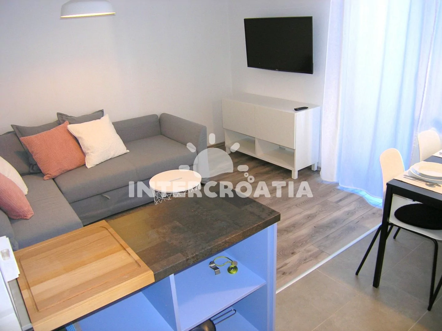 Apartmán s vlastní terasou je umístěný ve zvýšeném přízemí vily a je vhodný pro 2 až 3 osoby. Obývací pokoj je spojený s kuchyní. Kuchyňská linka je vybavena sklokeramickou varnou deskou, vestavěnou troubou, komínovou digestoří, kávovarem, nádobím a lednicí s mrazákem. Obývací pokoj s jídelním stolem pro 4 osoby, rohovou pohovkou (rozložitelná na extra lůžko pro 1 osobu), televizí se satelitním programem, klimatizací a vstupem na terasu. Ložnice je vybavena jedním dvoulůžkem. Koupelna se sprchovým koutem, umyvadlem a wc. Hostům je k dispozici parkování u objektu zdarma.