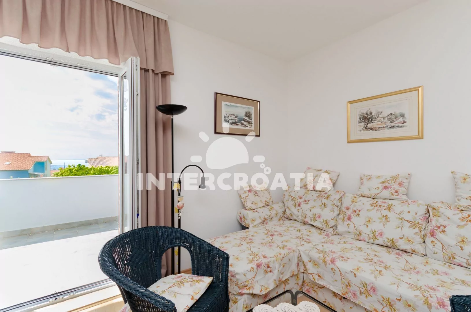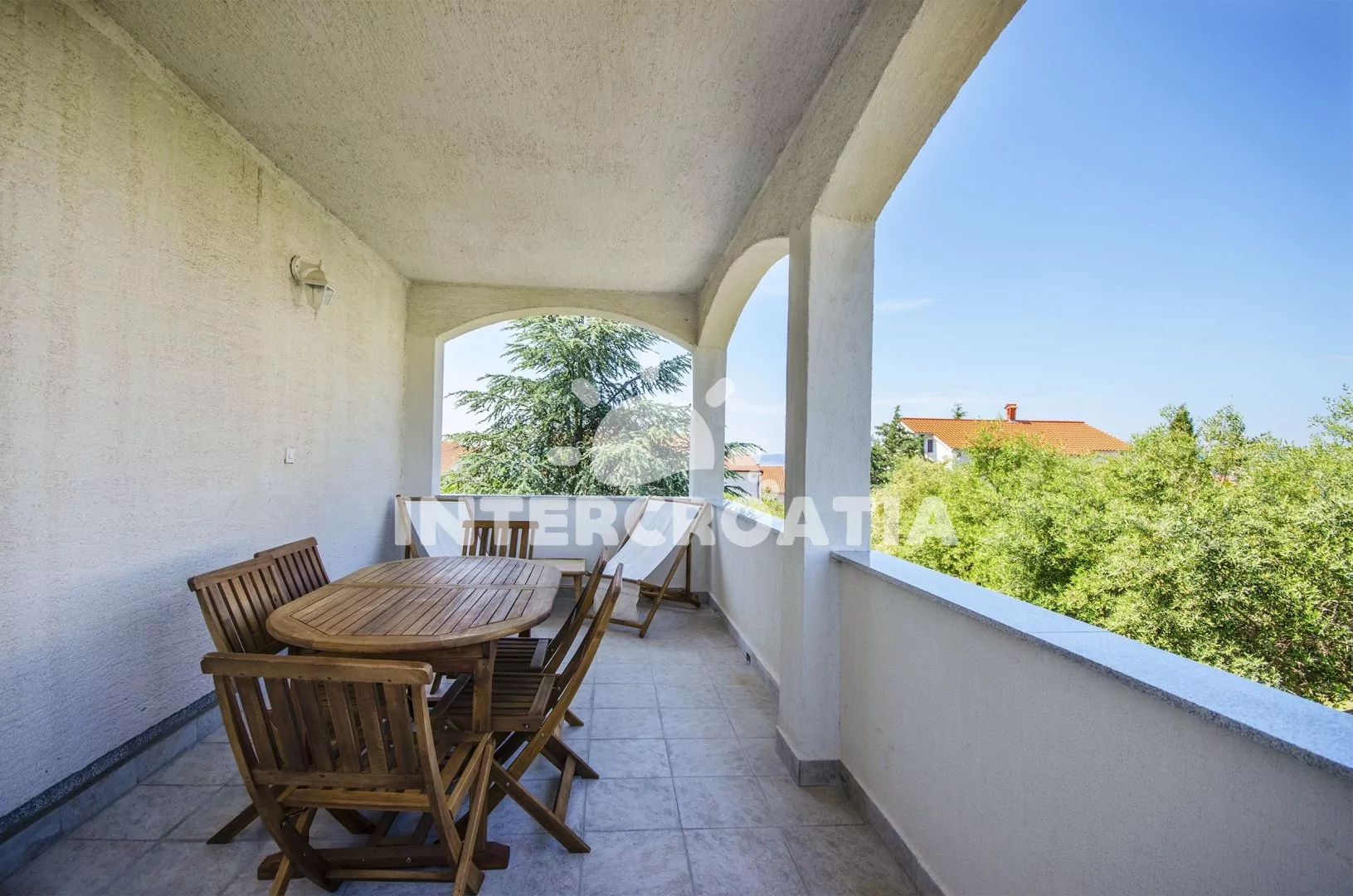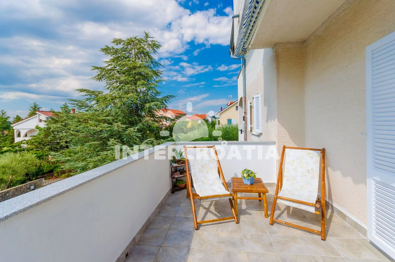 Apartmán (60 m2) s vlastní terasou a částečným výhledem na moře se nachází v 1. patře domu a je vhodný pro 4 až 6 osob. Kuchyňská linka je vybavena sklokeramickou varnou deskou, digestoří, vestavěnou troubou, myčkou na nádobí, rychlovarnou konvicí, kávovarem, toustovačem, mikrovlnnou troubou, nádobím a lednicí s mrazákem. Z kuchyně vstup na terasu. Obývací pokoj s jídelním stolem pro 4 osoby, pohovkou (rozložitelná na extra lůžko pro 2 osoby), televizí se satelitním programem a klimatizací. První i druhá ložnice je vybavena vždy s jedním dvoulůžkem. Koupelna s vanou, sprchovou zástěnou, umyvadlem, pračkou, fénem, bidetem a wc. Hostům je k dispozici parkování u objektu zdarma.