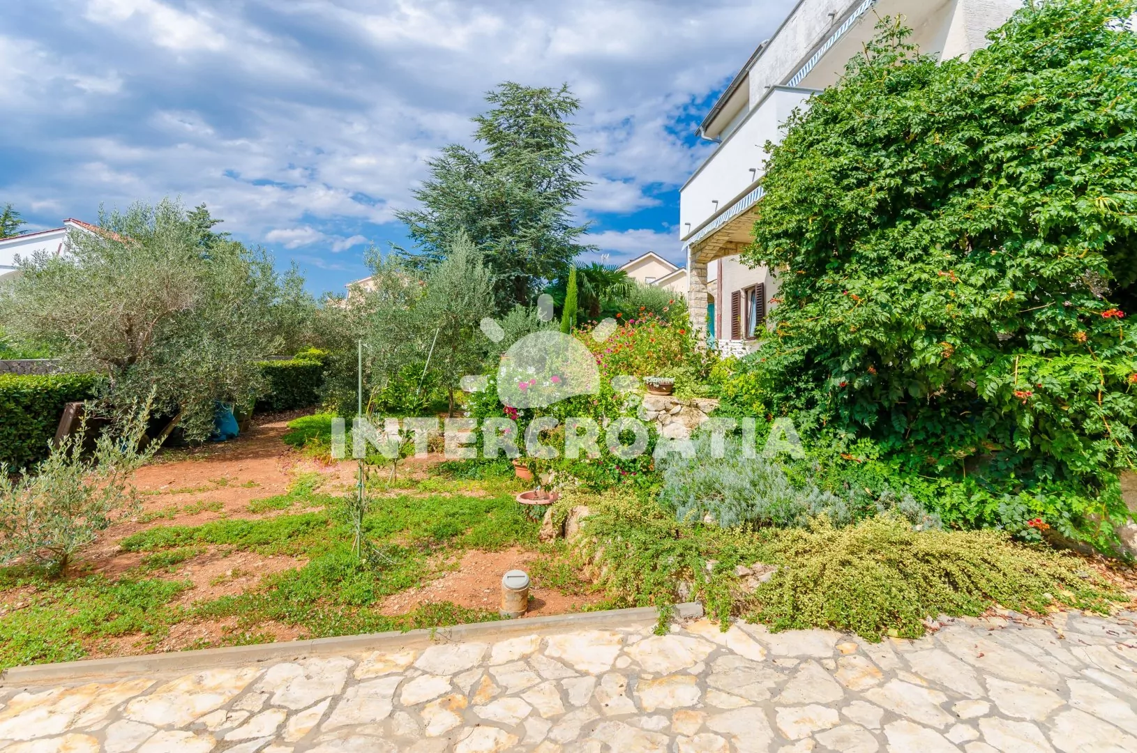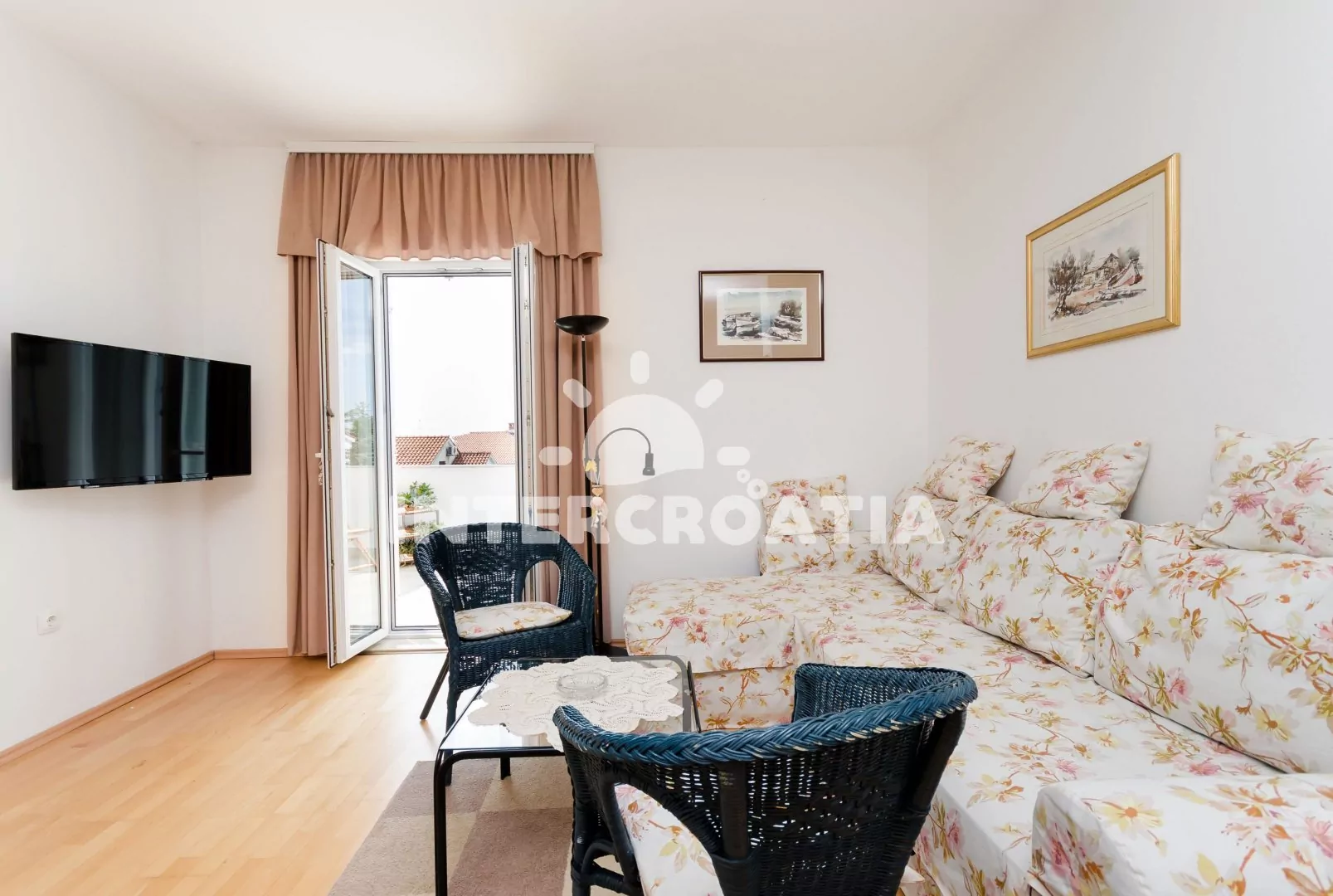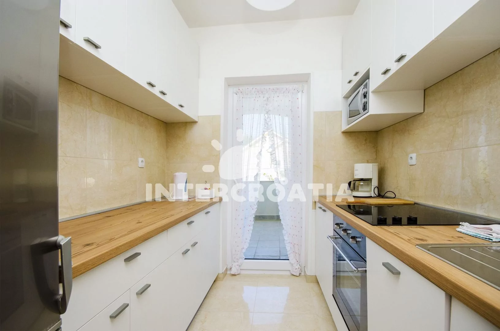 Apartmán (60 m2) s vlastní terasou a částečným výhledem na moře se nachází v 1. patře domu a je vhodný pro 4 až 6 osob. Kuchyňská linka je vybavena sklokeramickou varnou deskou, digestoří, vestavěnou troubou, myčkou na nádobí, rychlovarnou konvicí, kávovarem, toustovačem, mikrovlnnou troubou, nádobím a lednicí s mrazákem. Z kuchyně vstup na terasu. Obývací pokoj s jídelním stolem pro 4 osoby, pohovkou (rozložitelná na extra lůžko pro 2 osoby), televizí se satelitním programem a klimatizací. První i druhá ložnice je vybavena vždy s jedním dvoulůžkem. Koupelna s vanou, sprchovou zástěnou, umyvadlem, pračkou, fénem, bidetem a wc. Hostům je k dispozici parkování u objektu zdarma.