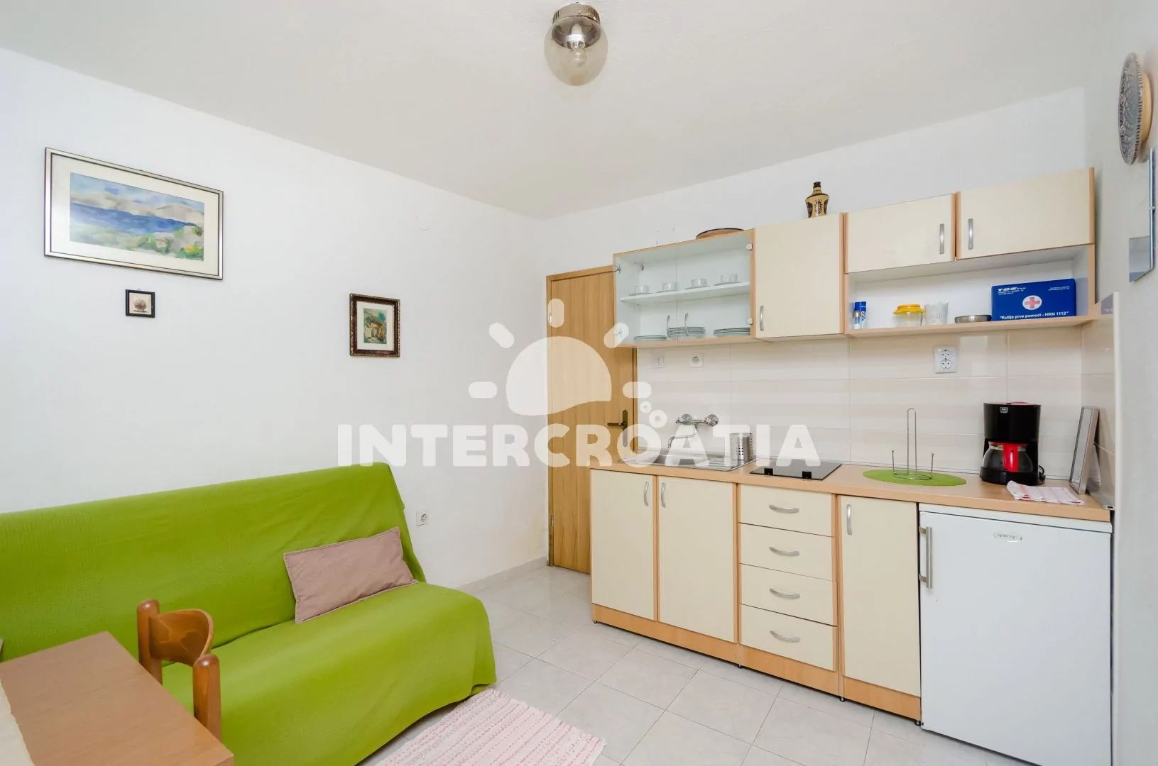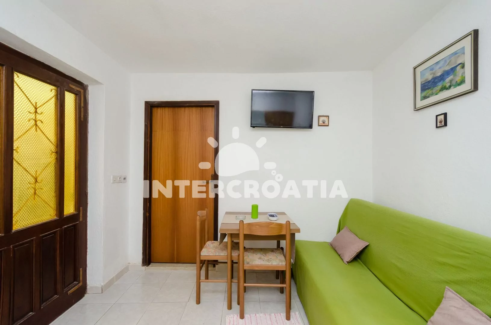 Apartmán (32 m2) s terasou a venkovním posezením se nachází v přízemí domu a je vhodný pro 2 až 3 osoby. Obývací pokoj je spojený s kuchyní. Kuchyňská linka je vybavena dvouplotýnkovým vařičem, kávovarem, nádobím a lednicí s mrazákem. Obývací pokoj s jídelním stolem, pohovkou (rozložitelná na extra lůžko pro 1 osobu) a televizí se satelitním programem. Ložnice s jedním dvoulůžkem a klimatizací. Koupelna se sprchovým koutem, umyvadlem a wc. Hostům je k dispozici parkování u objektu zdarma.