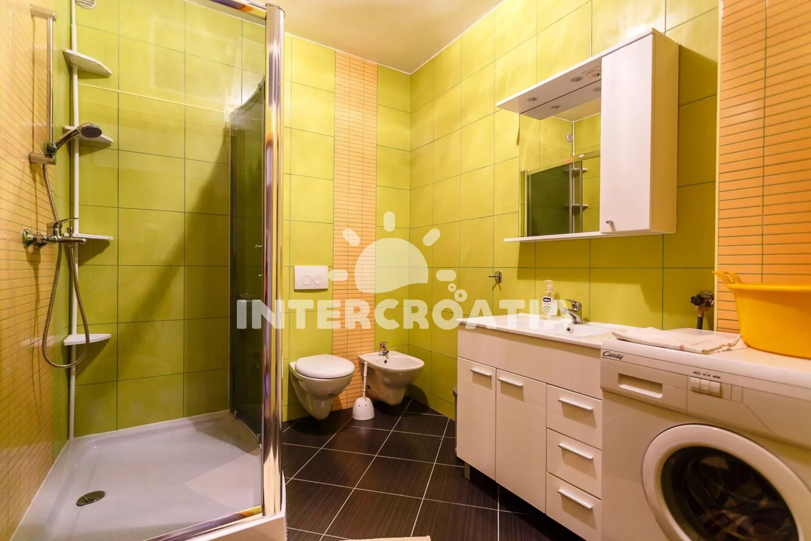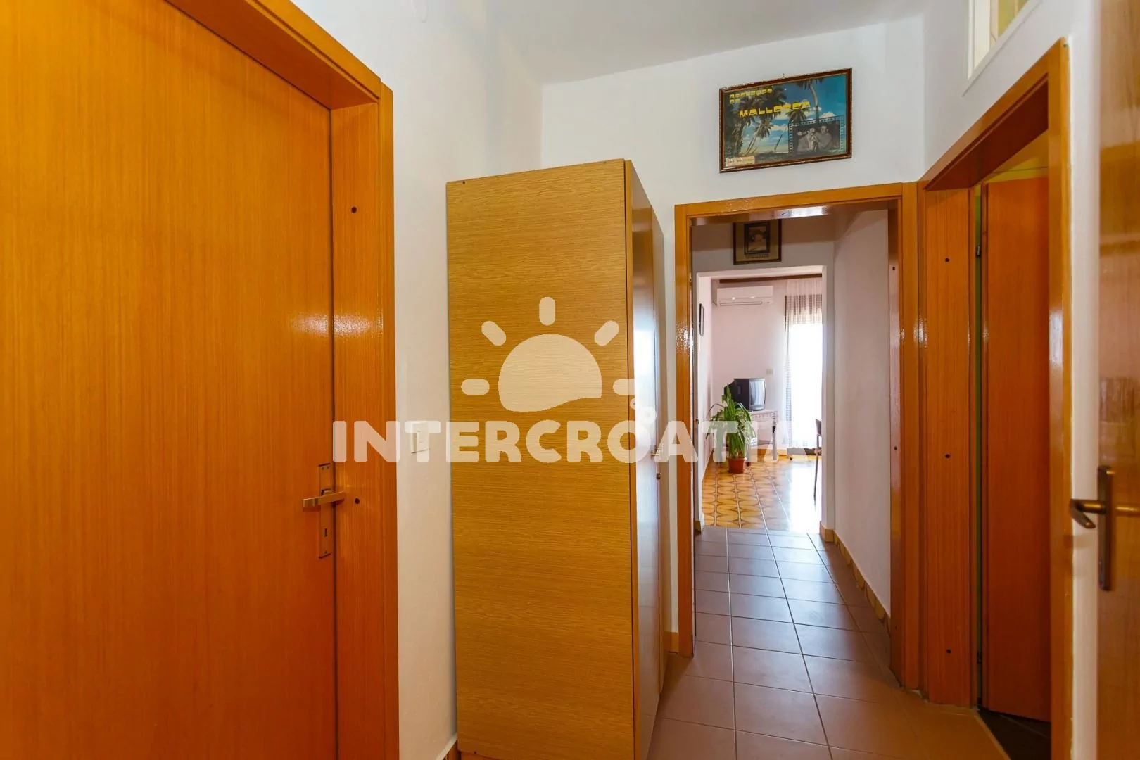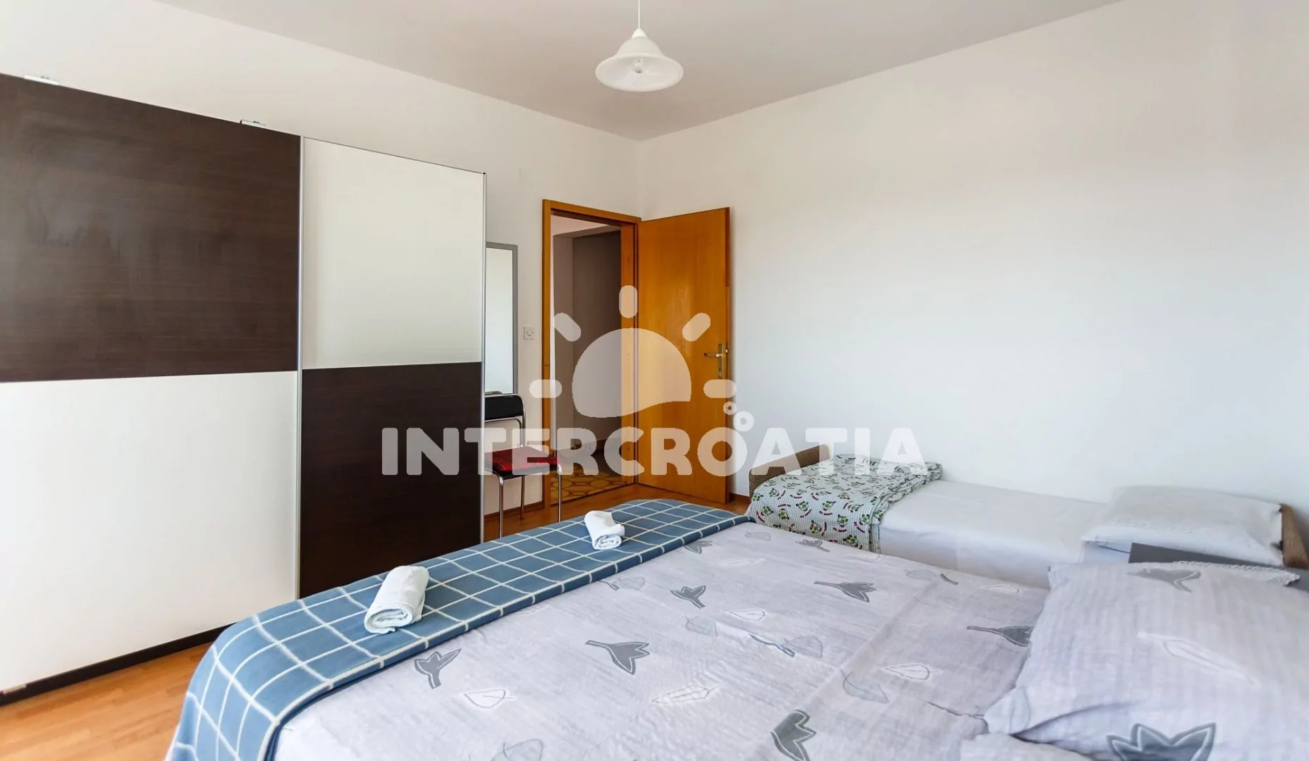 Apartmán (70 m2) s terasou a výhledem na moře se nachází v přízemí domu. Apartmán má dvě ložnice a je vhodný pro 5 až 6 osob. Obývací pokoj je spojený s kuchyní. Kuchyňská linka je vybavena sporákem s troubou, digestoří, rychlovarnou konvicí, kávovarem, nádobím a lednicí s mrazákem. Obývací pokoj s jídelním stolem pro 6 osob, pohovkou (rozložitelná na extra lůžko pro 1 osobu), televizí se satelitním programem, klimatizací a vstupem na terasu. První ložnice s dvoulůžkem, jedním jednolůžkem a vstupem na terasu. Druhá ložnice s dvoulůžkem. Koupelna se sprchovým koutem, umyvadlem, pračkou, bidetem a wc. Hostům je k dispozici parkování u objektu zdarma.