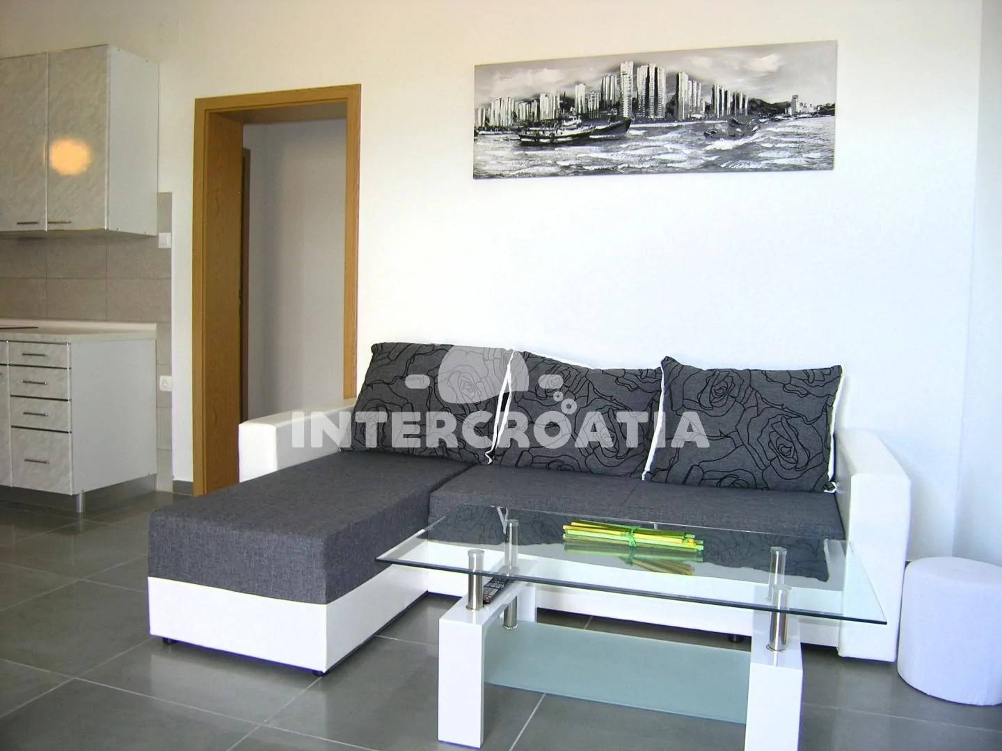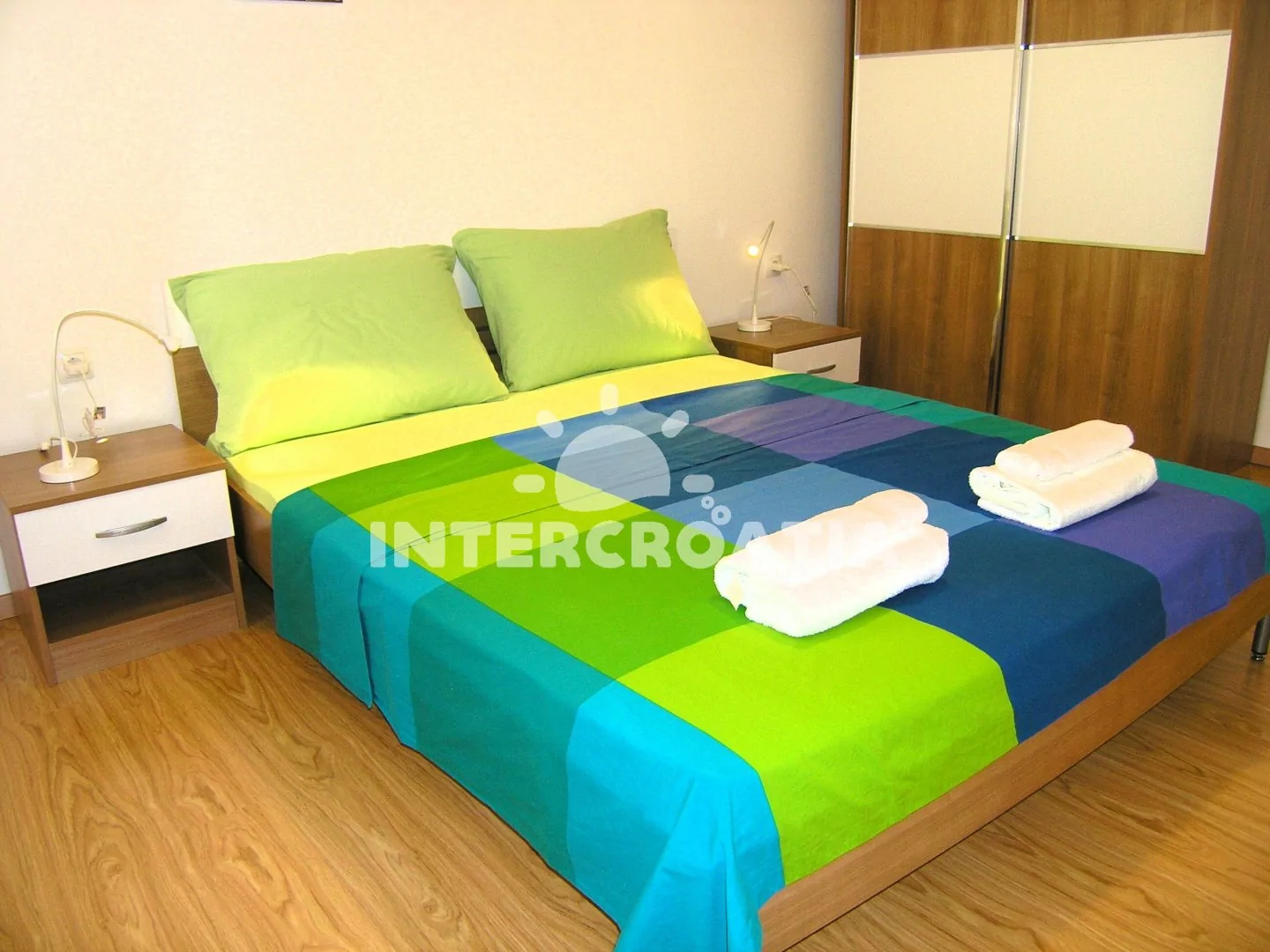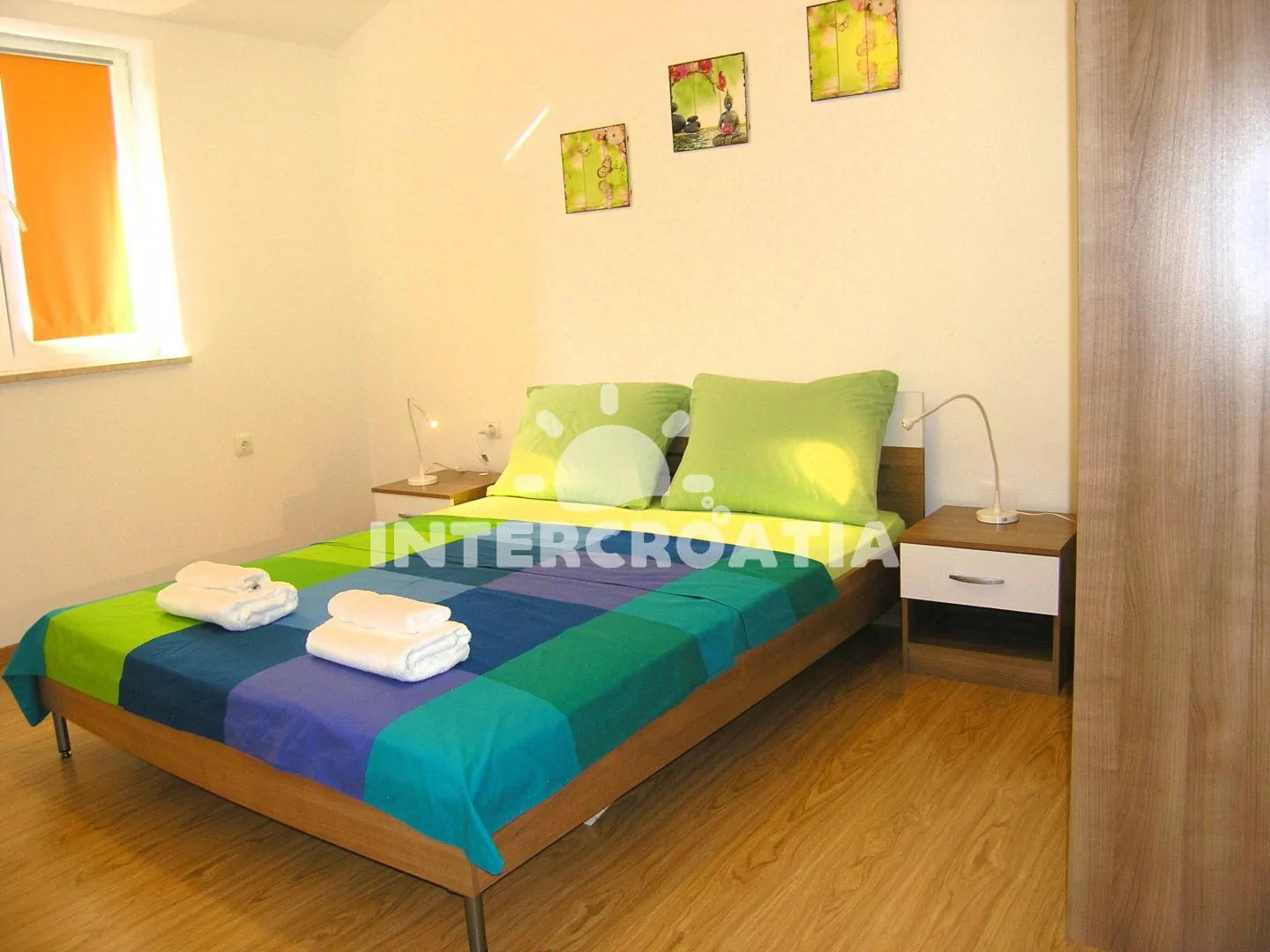 Podkrovní apartmán (75 m2) s terasou, posezením a výhledem na moře. Apartmán má 2 ložnice a je vhodný pro až 4 osoby. Obývací pokoj je spojený s kuchyní. Kuchyňská linka je vybavena sklokeramickou varnou deskou, digestoří, vestavěnou troubou, myčkou na nádobí, mikrovlnnou troubou, rychlovarnou konvicí, kávovarem, nádobím a lednicí s mrazákem. Obývací pokoj s jídelním stolem, pohovkou, televizí, klimatizací a vstupem na terasu. První i druhá ložnice je vybavena vždy s jedním dvoulůžkem. Koupelna se sprchovým koutem, umyvadlem, pračkou a wc. Hostům je k dispozici parkování u objektu zdarma.