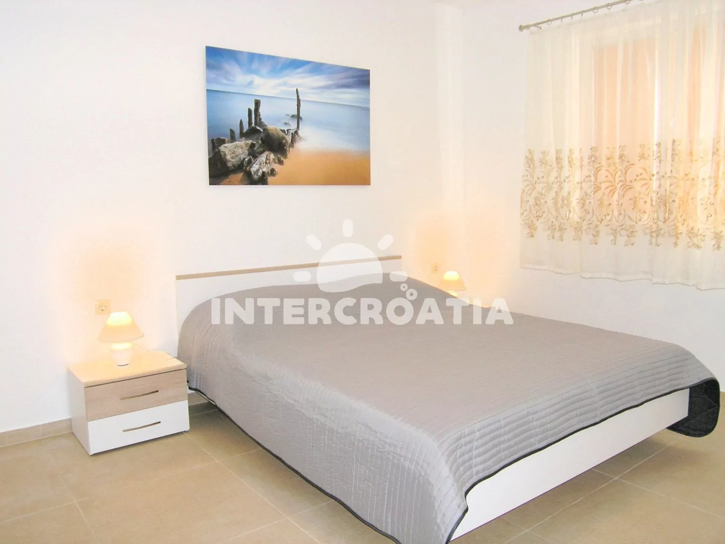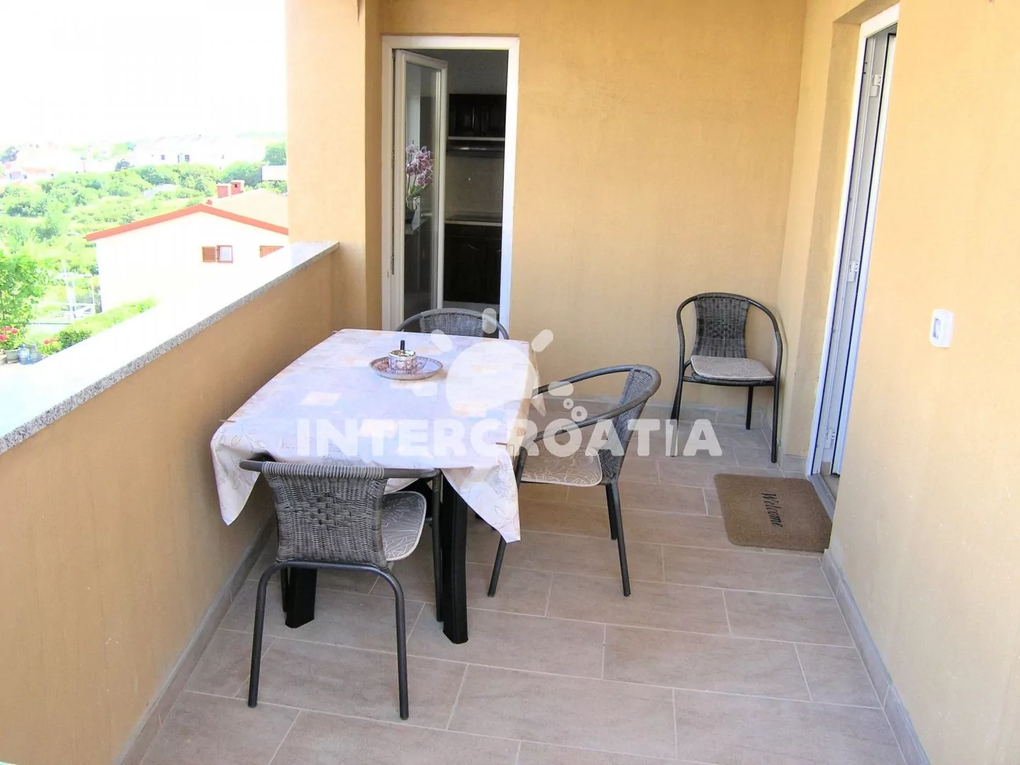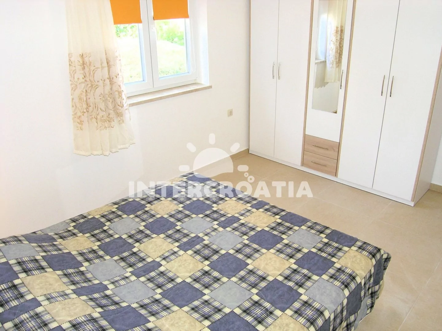 Apartmán (70 m2) s terasou, výhledem na moře a do zahrady se nachází v přízemí domu. Apartmán má 2 ložnice a je vhodný pro 4 až 5 osob. Obývací pokoj je spojený s kuchyní. Kuchyňská linka je vybavena sklokeramickou varnou deskou, digestoří, kávovarem, nádobím a lednicí s mrazákem. Obývací pokoj s jídelním stolem, pohovkou (rozložitelná na extra lůžko pro 1 osobu), televizí a klimatizací a vstupem na terasu. První i druhá ložnice je vybavena vždy s jedním dvoulůžkem. Koupelna se sprchovým koutem, umyvadlem, bidetem a wc. Hostům je k dispozici parkování u objektu zdarma.