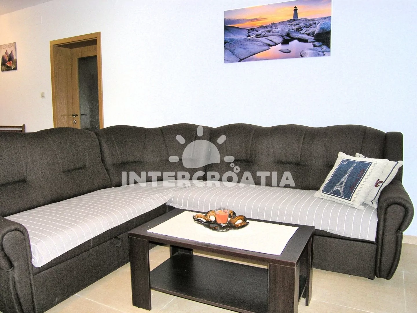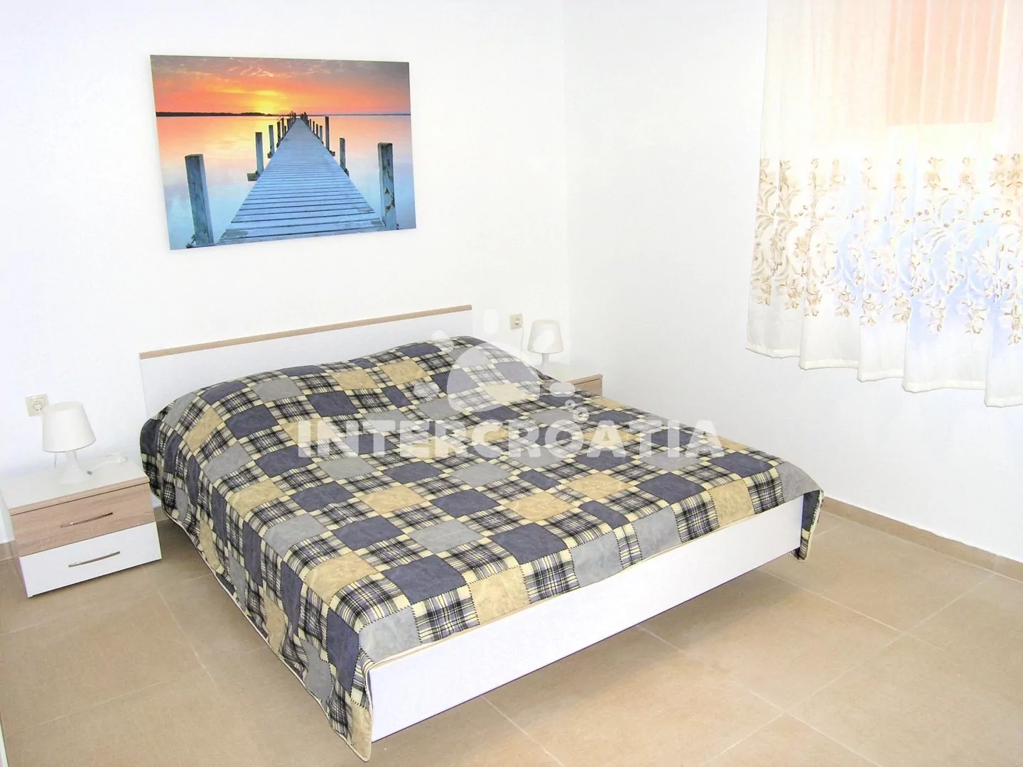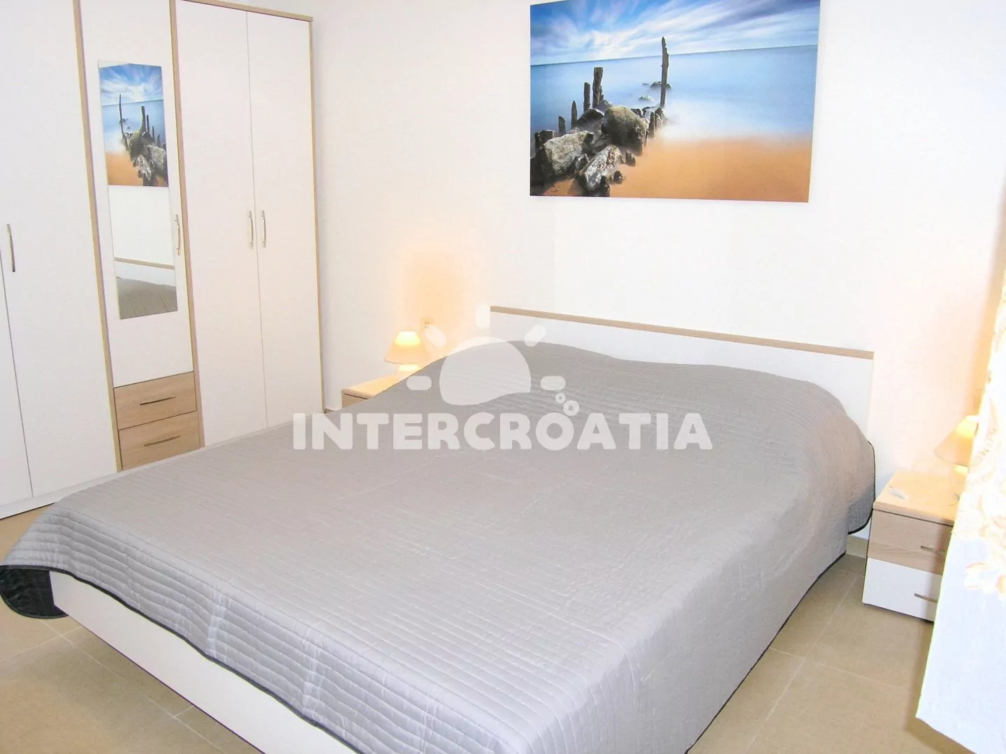 Apartmán (70 m2) s terasou, výhledem na moře a do zahrady se nachází v přízemí domu. Apartmán má 2 ložnice a je vhodný pro 4 až 5 osob. Obývací pokoj je spojený s kuchyní. Kuchyňská linka je vybavena sklokeramickou varnou deskou, digestoří, kávovarem, nádobím a lednicí s mrazákem. Obývací pokoj s jídelním stolem, pohovkou (rozložitelná na extra lůžko pro 1 osobu), televizí a klimatizací a vstupem na terasu. První i druhá ložnice je vybavena vždy s jedním dvoulůžkem. Koupelna se sprchovým koutem, umyvadlem, bidetem a wc. Hostům je k dispozici parkování u objektu zdarma.
