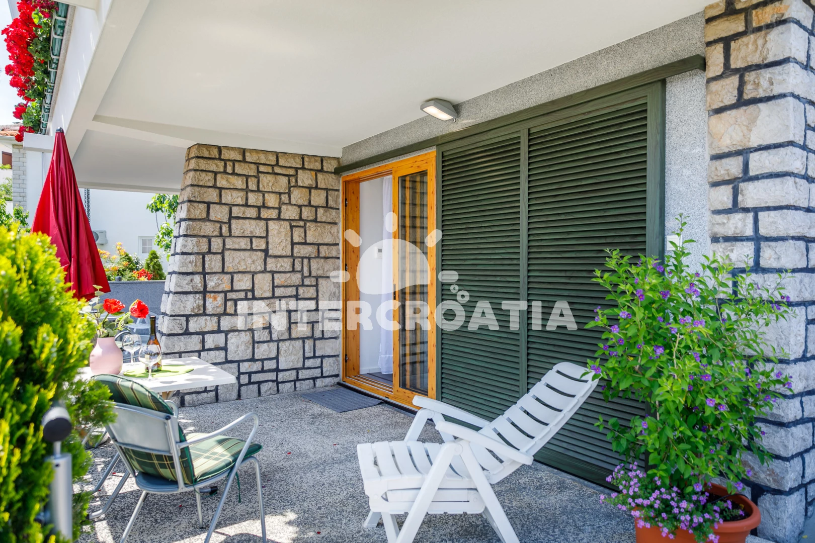 Apartmán se nachází 250 m od moře a pláže. Pláž je oblázková a betonové desky. U objektu je k dispozici společná zahrada s posezením a grilem. Parkování je před domem.
