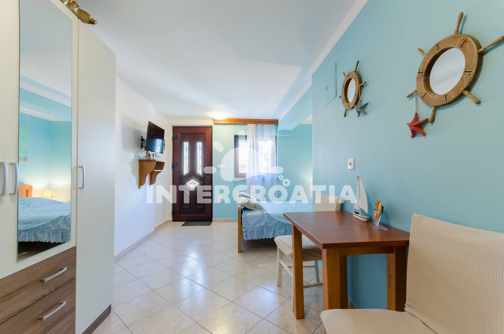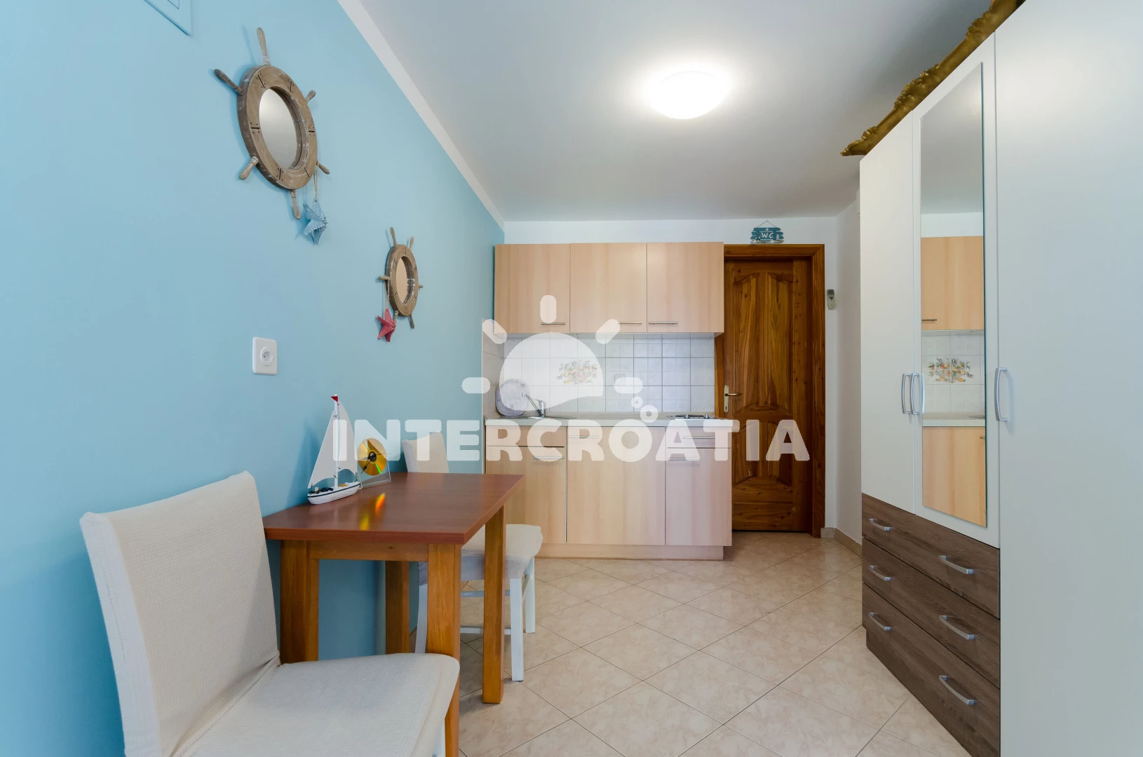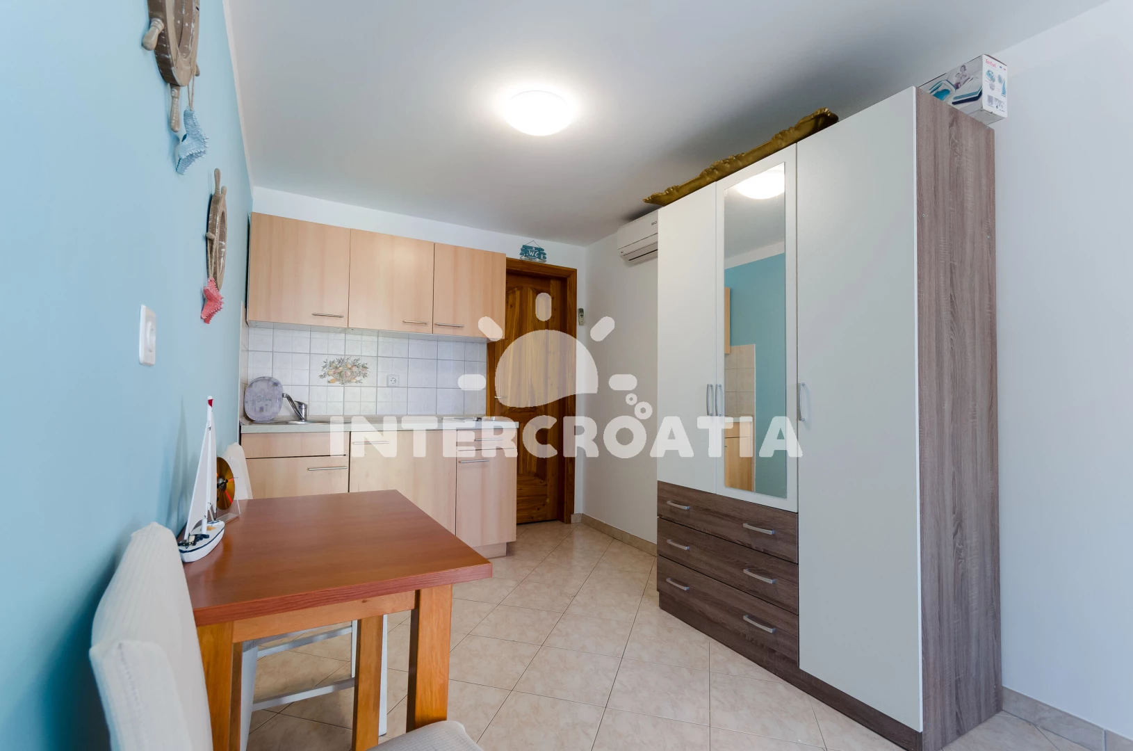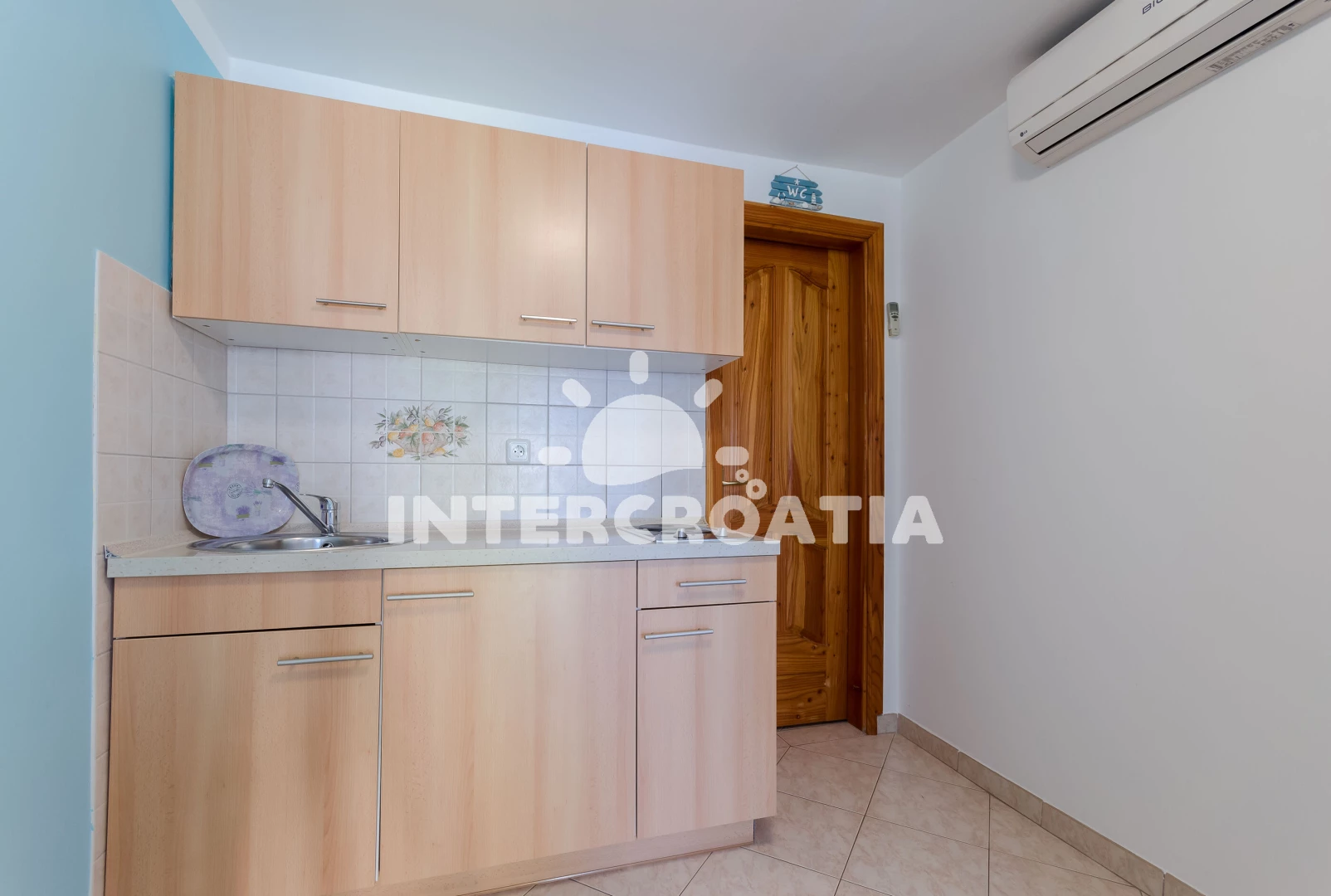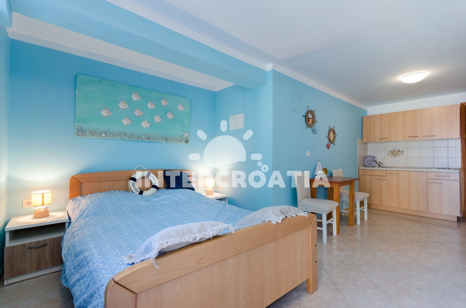 Apartmán se nachází 800 m od moře a pláže. Pláž je skalnatá, oblázková a betonové desky. U objektu je k dispozici společná zahrada s posezením a grilem. Parkování je před domem.