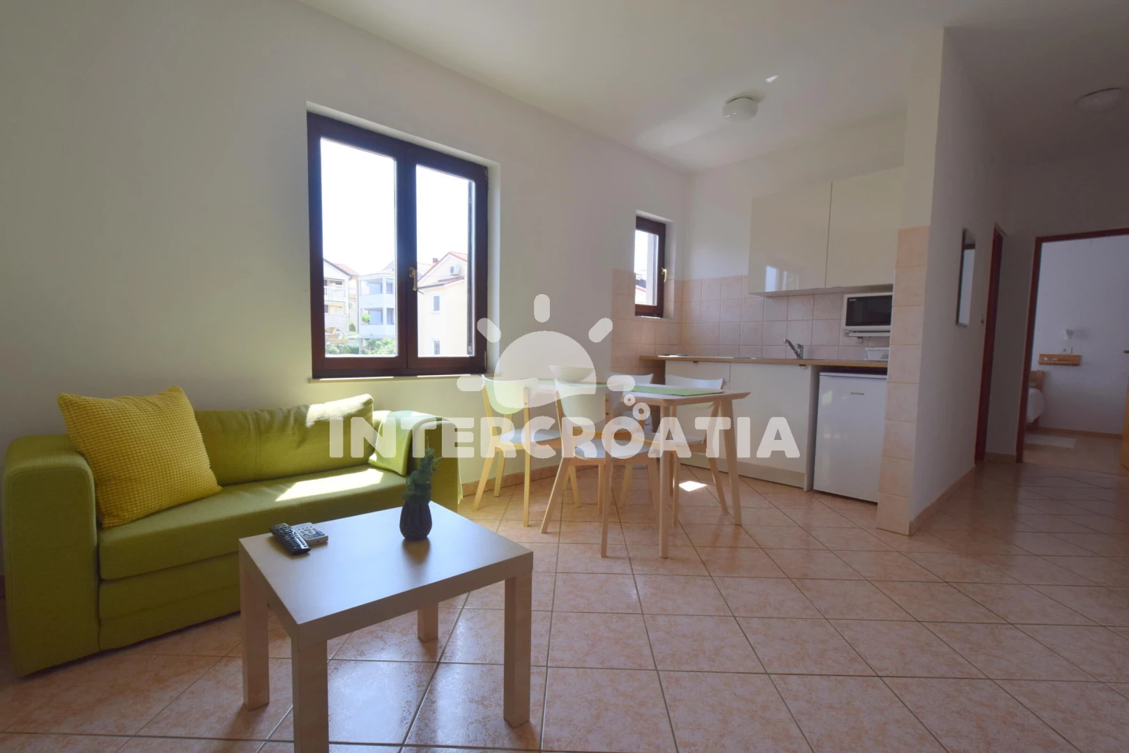 Vzdálenosti: Moře 500 m, pláž 700 m (oblázková a betonové desky), směnárna 400 m, supermarket 400 m, restaurace 450 m, centrum 450 m, bar 450 m, banka 500 m, půjčovna motorových člunů 500 m, čerpací stanice 500 m, půjčovna kol 500 m, pošta 600 m, veřejná doprava 600 m, lékárna 600 m, kotviště pro čluny 600 m, ambulance 600 m, potápění 700 m, letiště 1,4 km, diskotéka 1,5 km, trajekt (Valbiska (Krk)) 8 km,