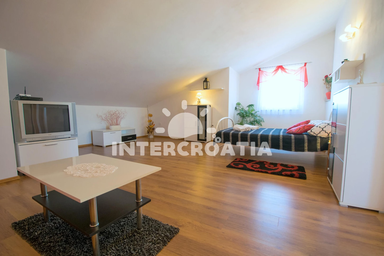 Apartmán (45 m2) s balkonem, a výhledem na moře. Nachází se v podkroví objektu. Apartmán má 1 ložnici a je vhodný pro až 2 osoby. Kuchyňská linka je vybavena varnou deskou, toustovačem, kávovarem, mikrovlnnou troubou, rychlovarnou konvicí, nádobím, lednicí, mrazákem. K dispozici televize se satelitním programem. Koupelna s vanou, umyvadlem, WC.